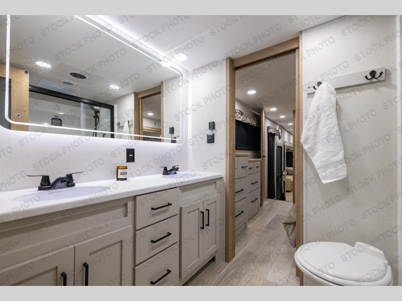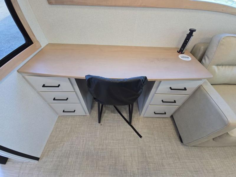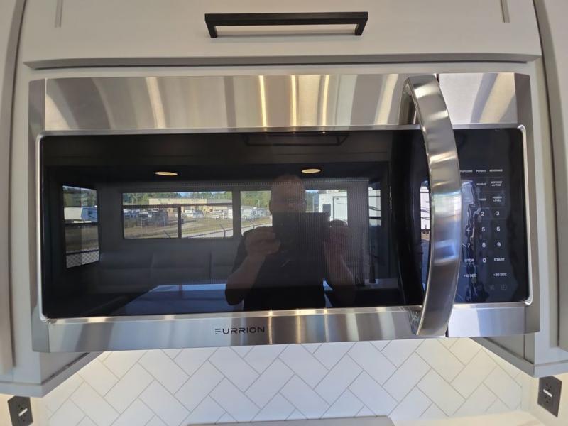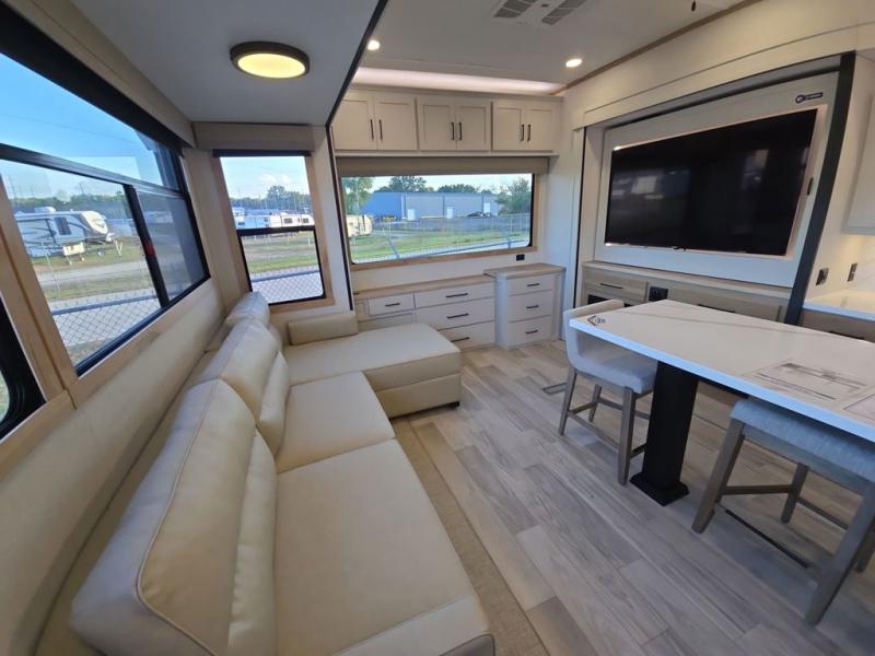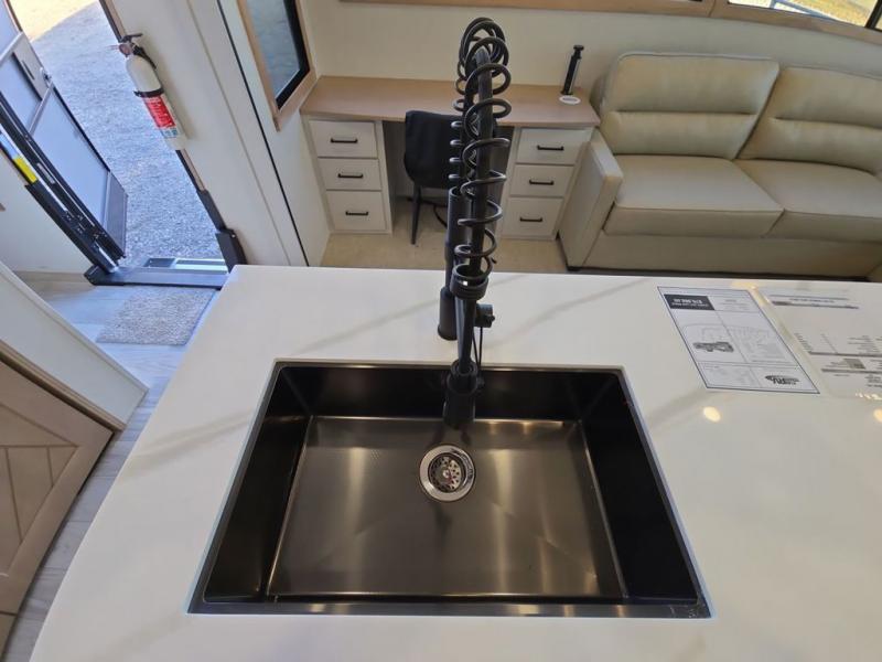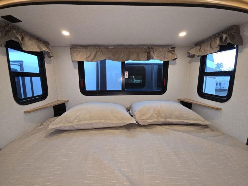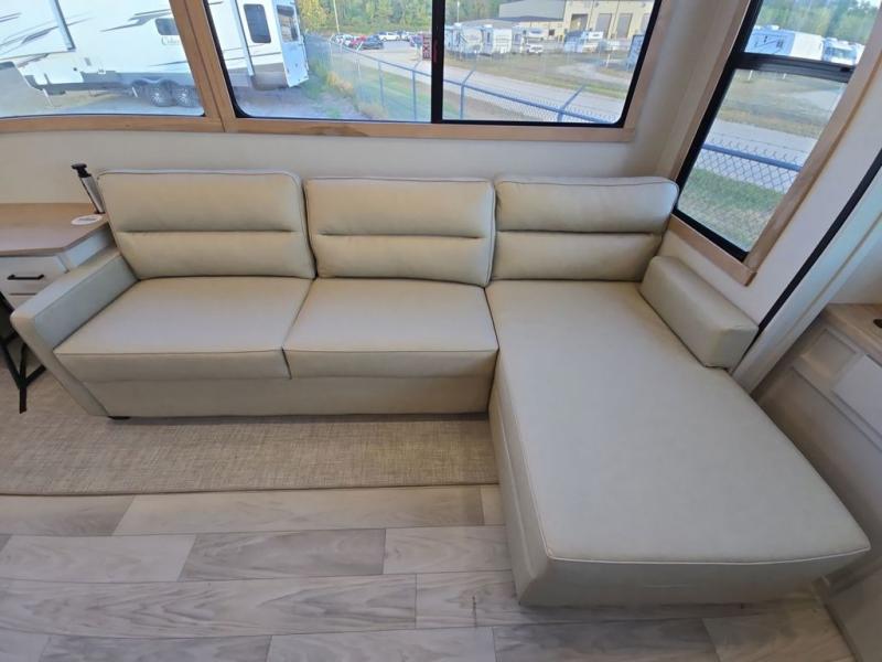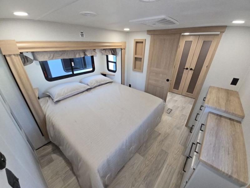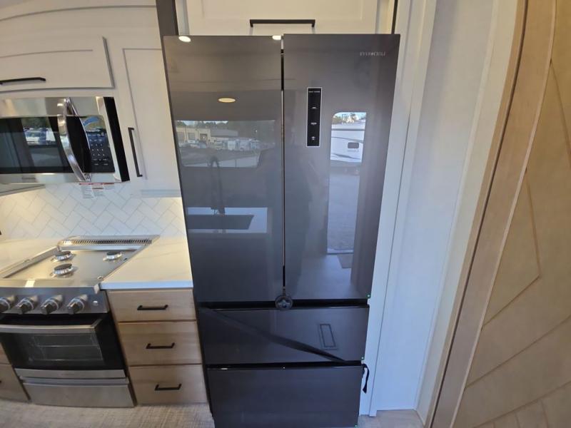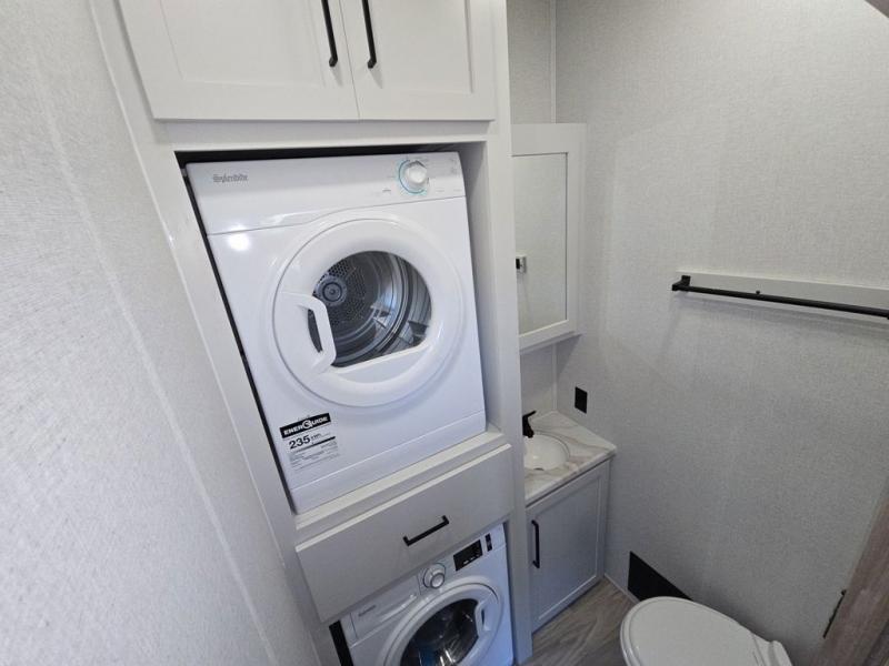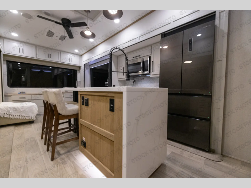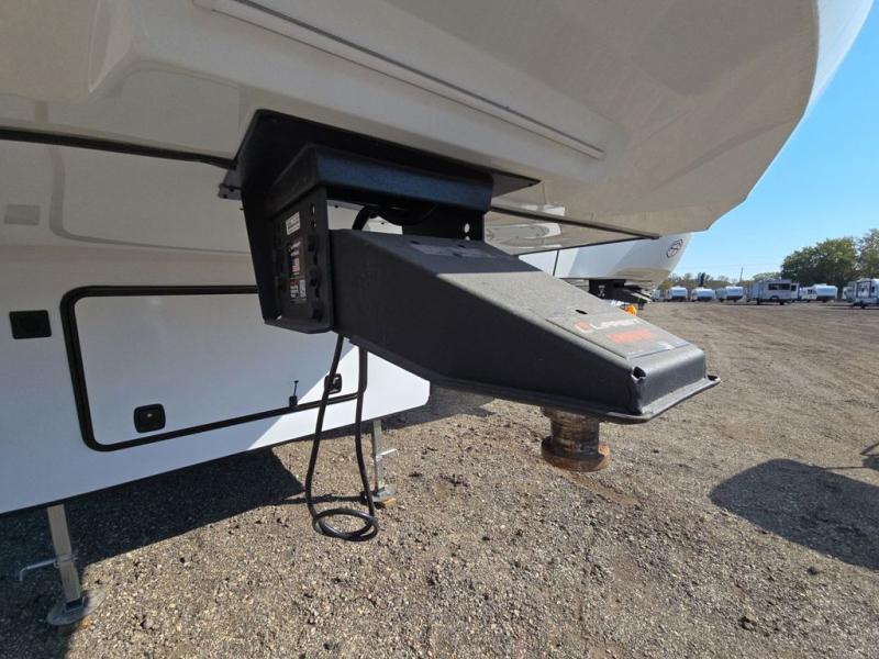 This fifth wheel is perfect for those seeking a comfortable, feature-rich home on wheels. Upon entering, you'll find a spacious rear living room, ideal for relaxation and entertainment. The room features a comfortable chase lounge, sofa, and an entertainment center with a cozy fireplace. For added convenience, there's a hidden pantry, desk with a chair, and a shelf and cabinet for storage. The kitchen is well-appointed with a stylish kitchen island featuring a beautiful waterfall edge. Overhead cabinets provide ample storage, while the microwave, 12V refrigerator, and four-burner cooktop make meal preparation a breeze. Plus, a butler pantry offers additional storage for kitchen essentials. A convenient half bath is located nearby, complete with a stackable washer and dryer prep if you want the option to add these appliances. The bedroom retreat features a comfortable king bed, a small dresser, and a tall dresser with a TV hookup. The adjacent walk-in bathroom closet boasts a one-piece fiberglass shower with a seat, dual sink, medicine cabinet, linen closet, and ample storage thanks to the various shelves, perfect for keeping your belongings organized. Exterior features include two awnings, one 12’ and the other 18’, providing ample shade and protection.