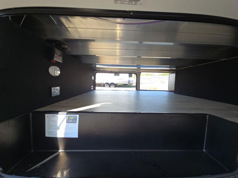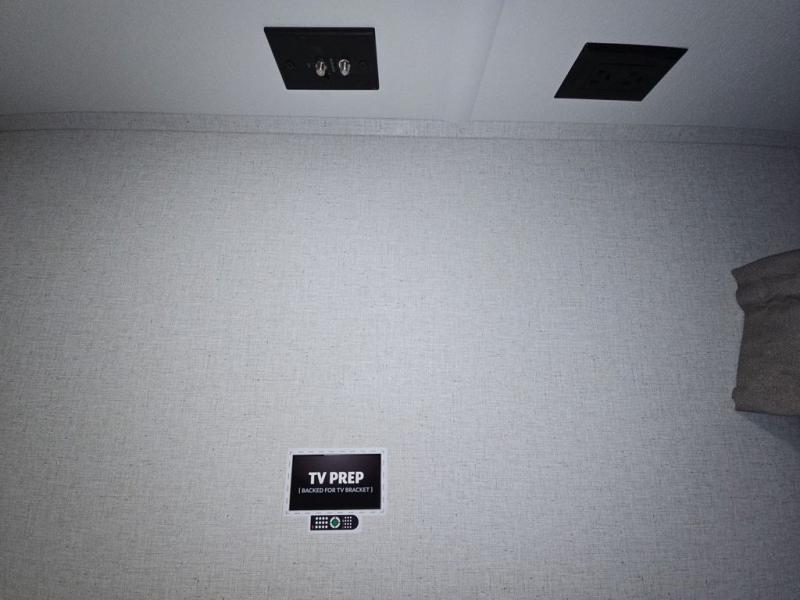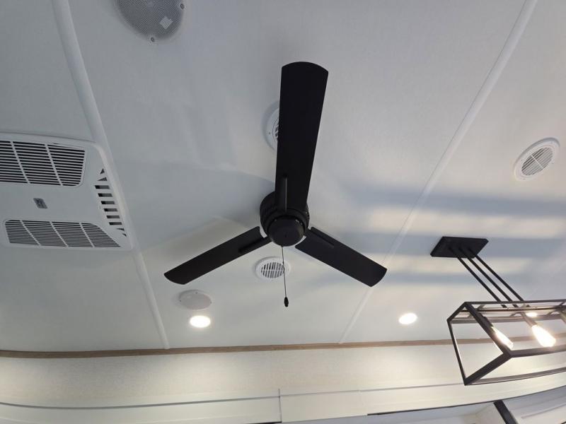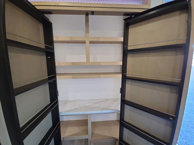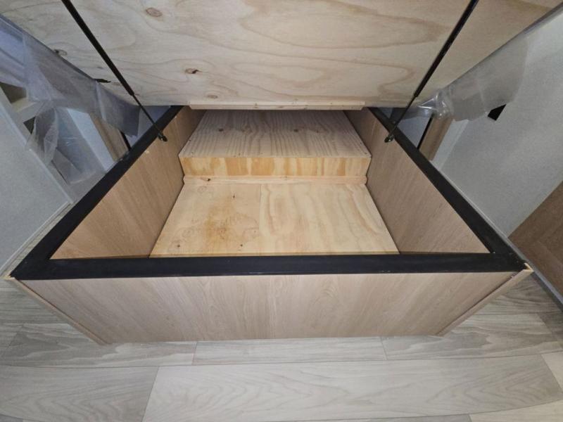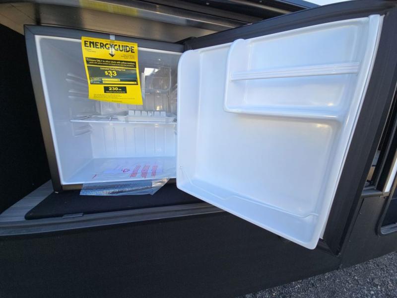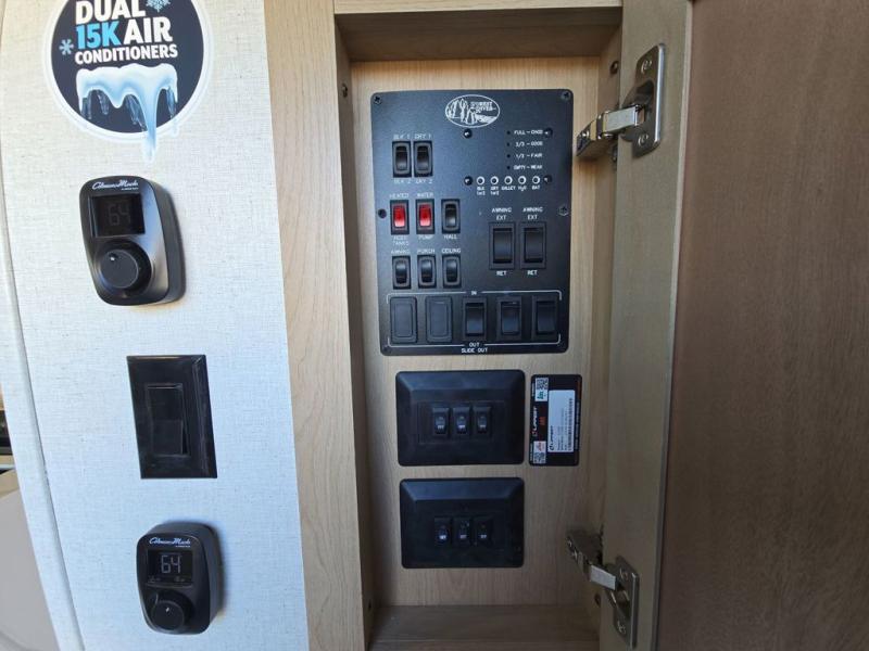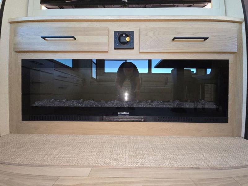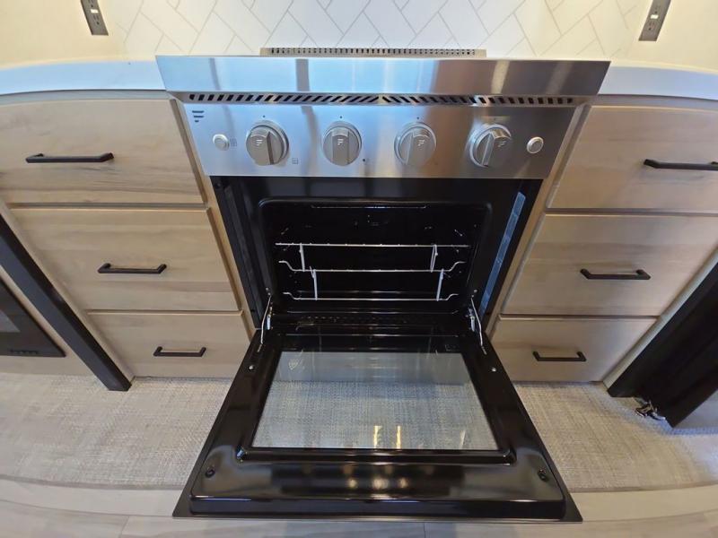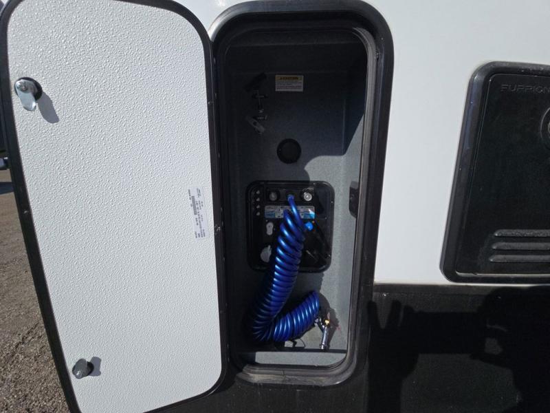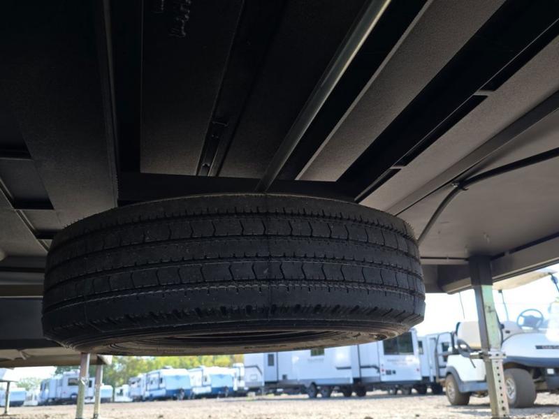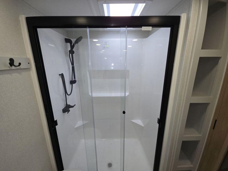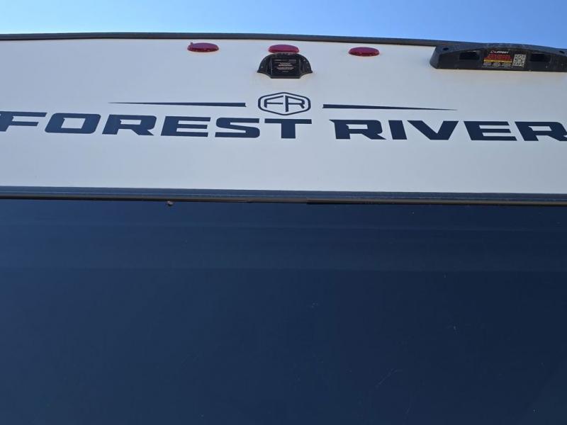 This fifth wheel is perfect for those seeking a comfortable, feature-rich home on wheels. Upon entering, you'll find a spacious rear living room, ideal for relaxation and entertainment. The room features a comfortable chase lounge, sofa, and an entertainment center with a cozy fireplace. For added convenience, there's a hidden pantry, desk with a chair, and a shelf and cabinet for storage. The kitchen is well-appointed with a stylish kitchen island featuring a beautiful waterfall edge. Overhead cabinets provide ample storage, while the microwave, 12V refrigerator, and four-burner cooktop make meal preparation a breeze. Plus, a butler pantry offers additional storage for kitchen essentials. A convenient half bath is located nearby, complete with a stackable washer and dryer prep if you want the option to add these appliances. The bedroom retreat features a comfortable king bed, a small dresser, and a tall dresser with a TV hookup. The adjacent walk-in bathroom closet boasts a one-piece fiberglass shower with a seat, dual sink, medicine cabinet, linen closet, and ample storage thanks to the various shelves, perfect for keeping your belongings organized. Exterior features include two awnings, one 12’ and the other 18’, providing ample shade and protection.