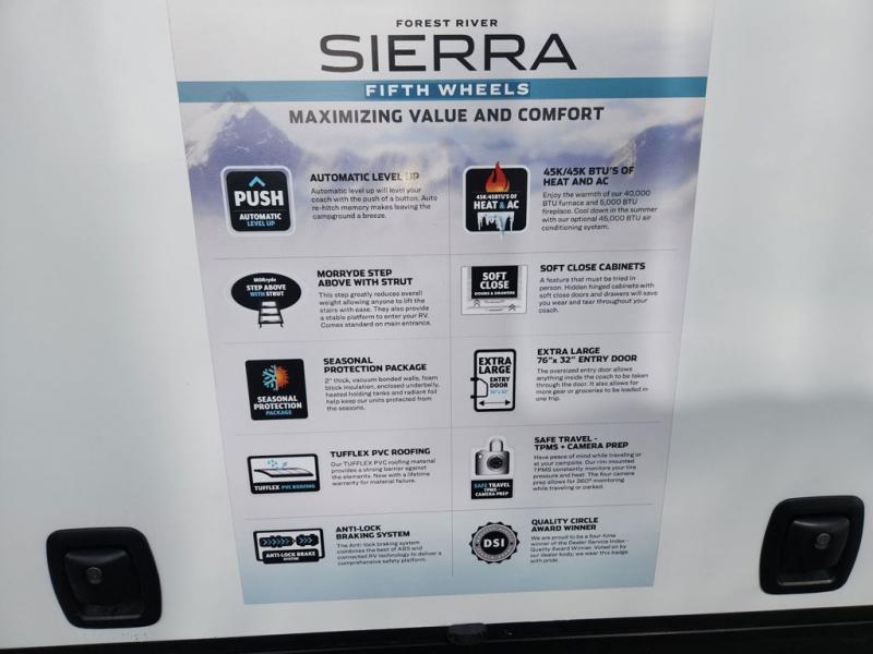 Each one of these Forest River Sierra fifth wheels are equipped with everything you need to make the most of each adventure! The underbelly armor will protect your unit's vitals from road debris and the painted two tone aerodynamic fiberglass front cap has an improved turning radius to make them easier to navigate. With an electric leveling system, you can set your unit up quick and easy then get to having fun faster than ever. The welded aluminum framed, vacuum bonded laminated superstructure will hold up through every adventure and the cambered powder coated frame comes with rust prohibitor to last longer. Each model also includes the Summit Package that comes with a king Wi-Fi extender system and Olympus antenna, a full coach water filter system, Goodyear tires with 7,000 lb. axles, and the list goes on. The interior is just as impressive with rustic wood plank linoleum, recessed residential lighting, a memory foam mattress, and mocha accent crown molding over the kitchen cabinets!