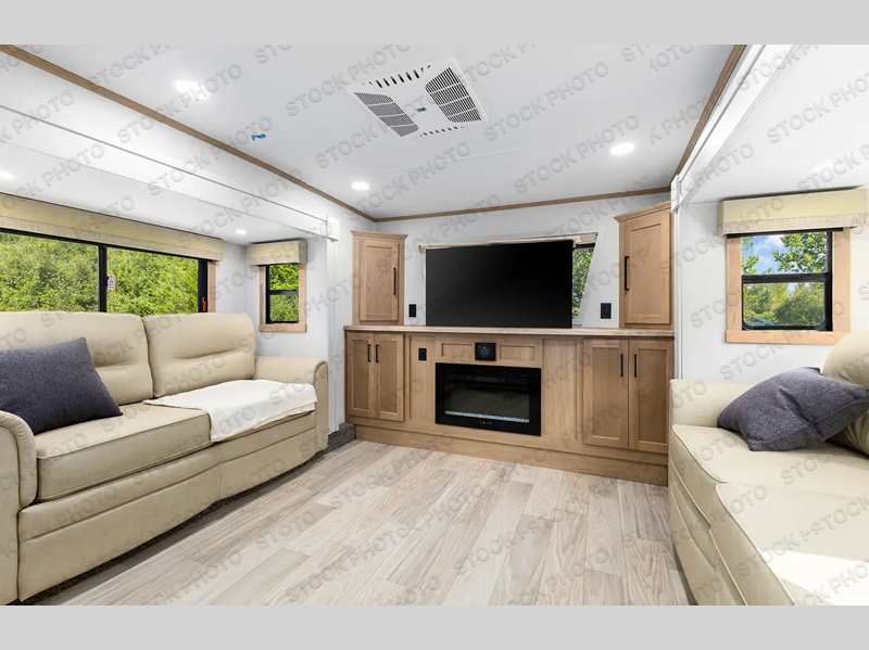 The perfect fifth wheel for a larger family! This unit sleeps eight people the loft above the rear master bedroom and bathroom. In the loft area, there are two 44" x 74" bunk mats for comfort as well as wardrobe/storage at the head of each. The master bedroom features a king size bed that slides out to create more space by the bed. A spacious bath features a one-piece fiberglass shower for comfort. A spacious kitchen features two slides, a free-standing dinette in one, and the 12V refrigerator and stove in the other. There is also a center island with large sink for added food prep space. Head up the steps in front to a dual slide front living area with 50" TV and fireplace beneath the window. There is also theater seating opposite the TV, and a tri-fold hide-a-bed in each slide allowing added sleeping space when needed.