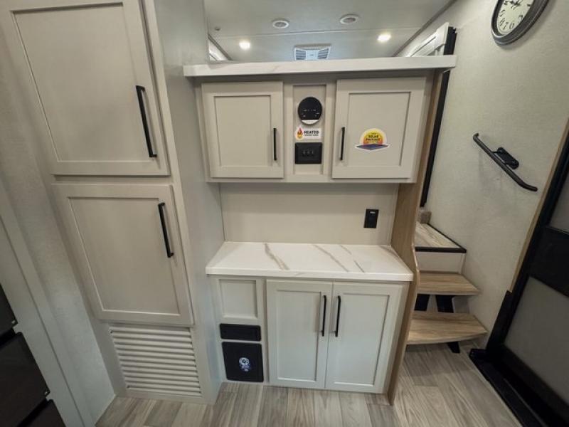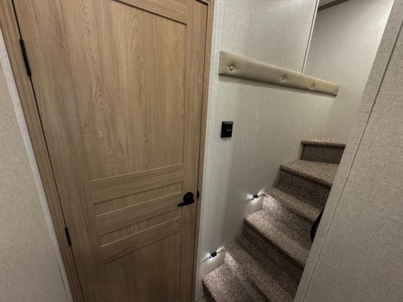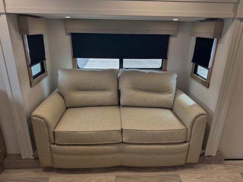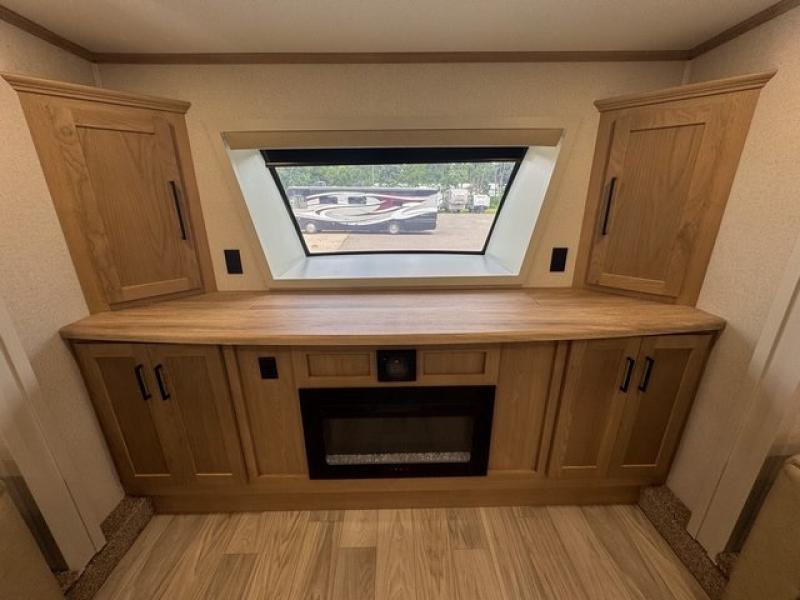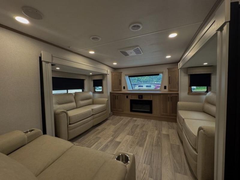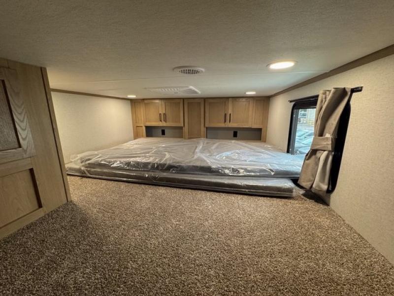 The perfect fifth wheel for a larger family! This unit sleeps eight or more with the full and half lofts above the rear master bedroom and bathroom. In the full loft area there are two 44" x 74" bunk mats for comfort as well as wardrobe/storage at the head of each. The master bedroom features a king size bed that slides out to create more space by the bed. A spacious bath features a walk-in shower for comfort and includes a seat so you can relax while you shower. A spacious kitchen features two slides, a free standing dinette in one, and the 12V refrigerator and stove in the other. There is also a center island with large sink for added food prep space. Head up the steps in front to a dual slide front living area with 50" TV and fireplace beneath the window. There is also theater seating opposite the TV, and a tri-fold hide-a-bed in each slide allowing added sleeping space when needed.