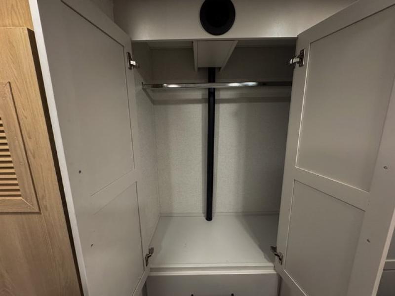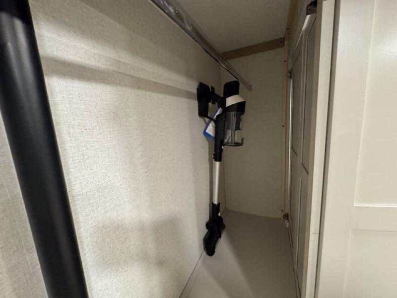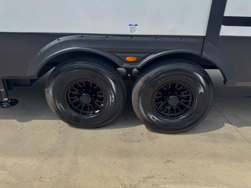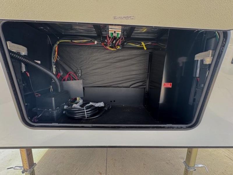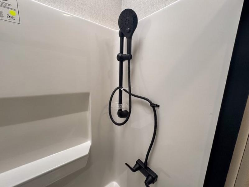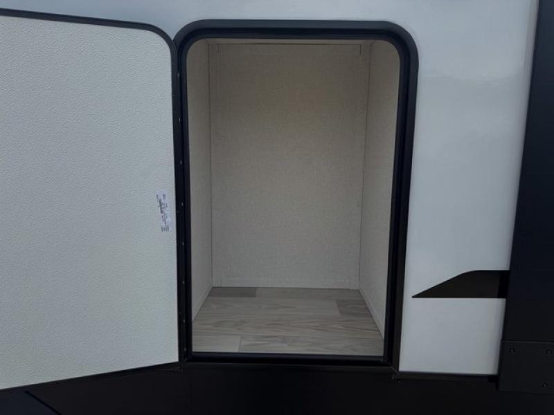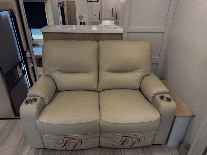 The perfect fifth wheel for a larger family! This unit sleeps eight or more with the full and half lofts above the rear master bedroom and bathroom. In the full loft area there are two 44" x 74" bunk mats for comfort as well as wardrobe/storage at the head of each. The master bedroom features a king size bed that slides out to create more space by the bed. A spacious bath features a walk-in shower for comfort and includes a seat so you can relax while you shower. A spacious kitchen features two slides, a free standing dinette in one, and the 12V refrigerator and stove in the other. There is also a center island with large sink for added food prep space. Head up the steps in front to a dual slide front living area with 50" TV and fireplace beneath the window. There is also theater seating opposite the TV, and a tri-fold hide-a-bed in each slide allowing added sleeping space when needed.