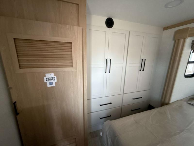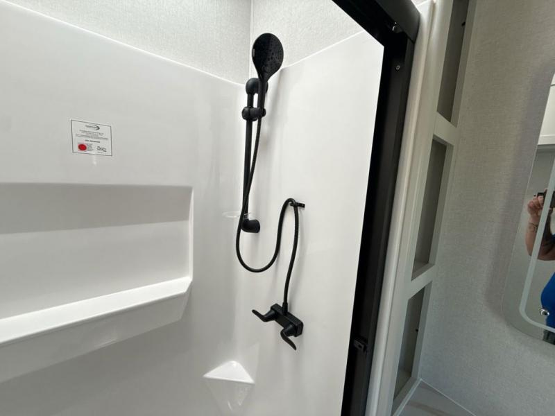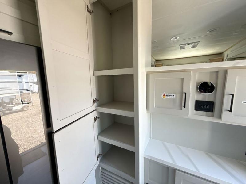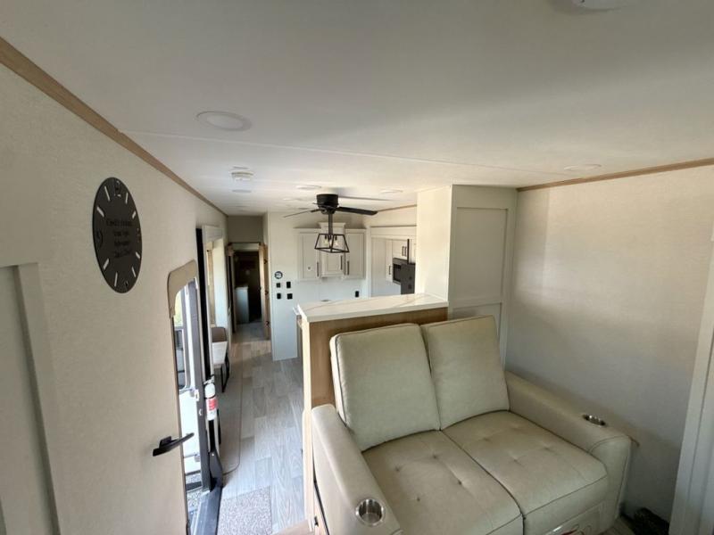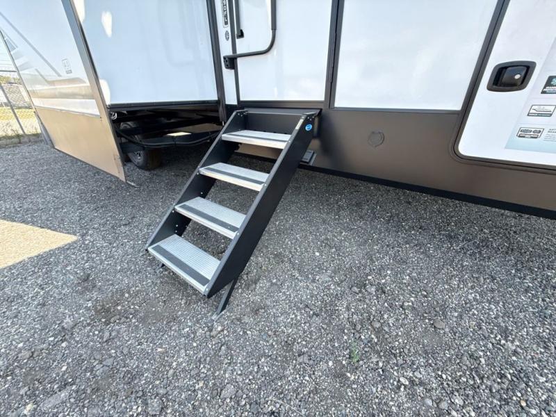 The perfect fifth wheel for a larger family! This unit sleeps eight or more with the full and half lofts above the rear master bedroom and bathroom. In the full loft area there are two 44" x 74" bunk mats for comfort as well as wardrobe/storage at the head of each. The master bedroom features a king size bed that slides out to create more space by the bed. A spacious bath features a walk-in shower for comfort and includes a seat so you can relax while you shower. A spacious kitchen features two slides, a free standing dinette in one, and the 12V refrigerator and stove in the other. There is also a center island with large sink for added food prep space. Head up the steps in front to a dual slide front living area with 50" TV and fireplace beneath the window. There is also theater seating opposite the TV, and a tri-fold hide-a-bed in each slide allowing added sleeping space when needed.