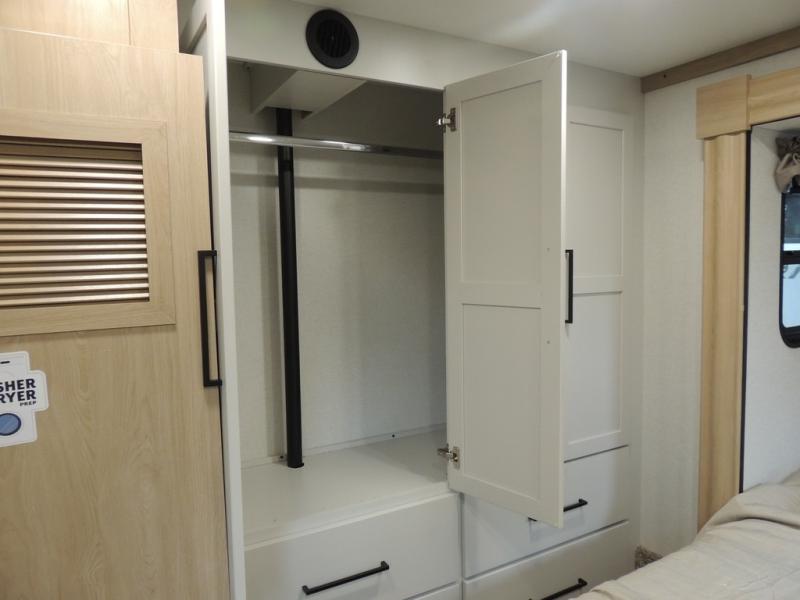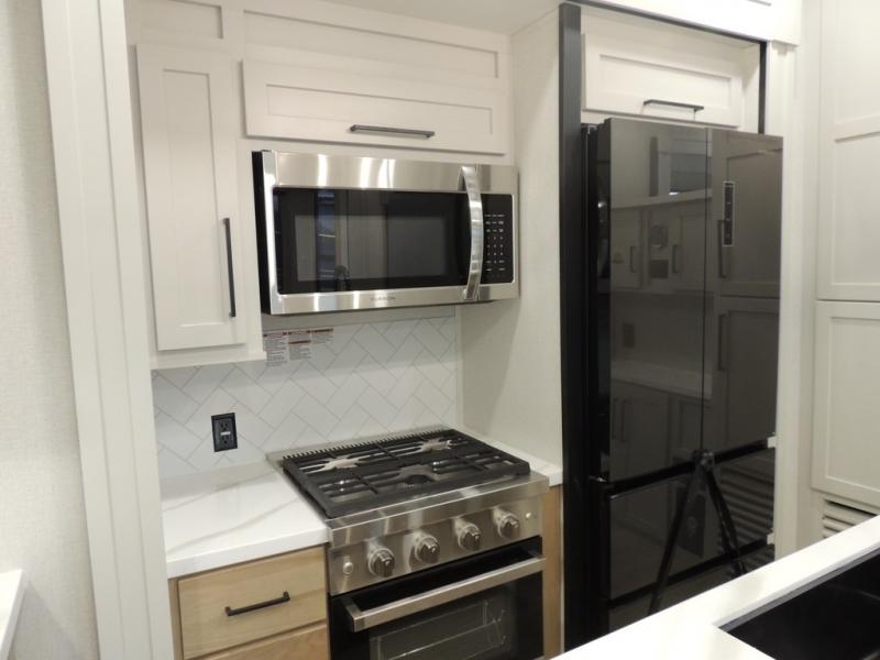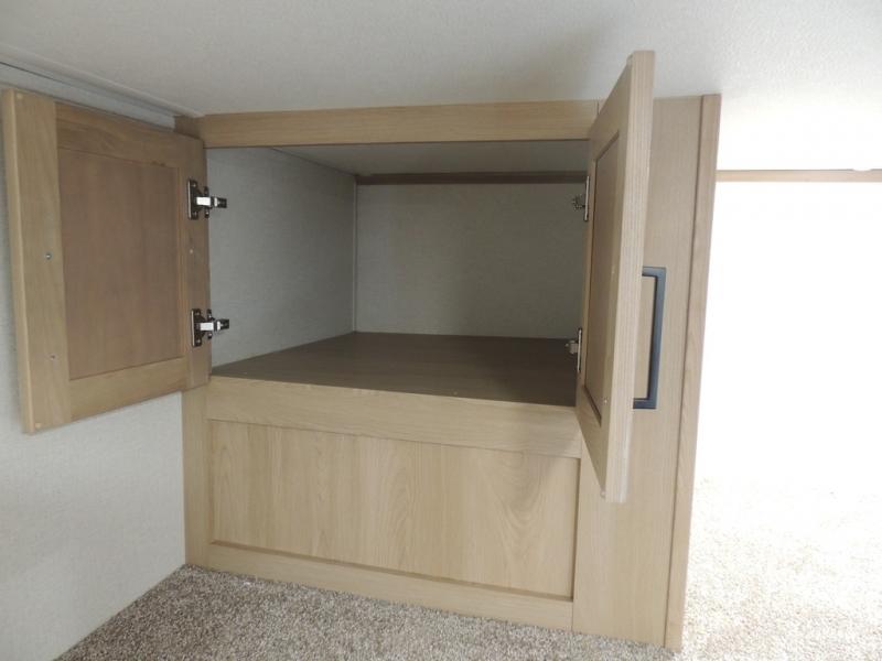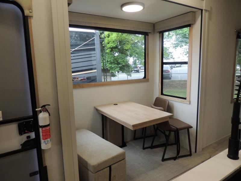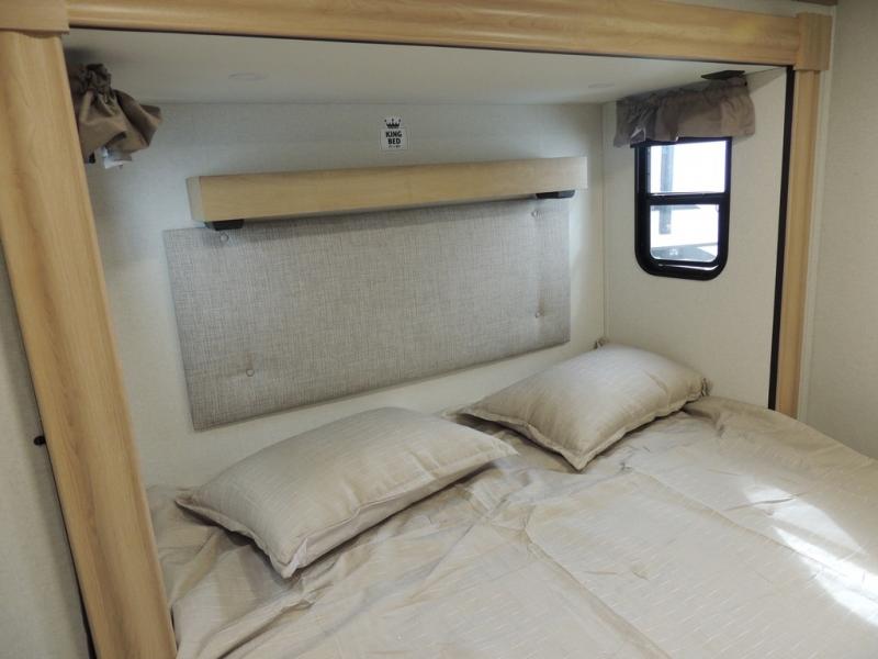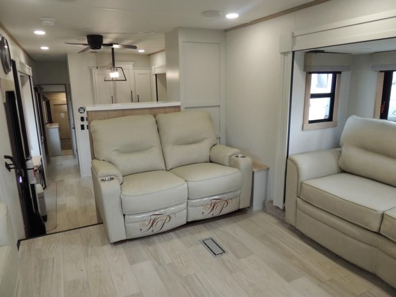 The perfect fifth wheel for a larger family! This unit sleeps eight or more with the full and half lofts above the rear master bedroom and bathroom. In the full loft area there are two 44" x 74" bunk mats for comfort as well as wardrobe/storage at the head of each. The master bedroom features a king size bed that slides out to create more space by the bed. A spacious bath features a walk-in shower for comfort and includes a seat so you can relax while you shower. A spacious kitchen features two slides, a free standing dinette in one, and the 12V refrigerator and stove in the other. There is also a center island with large sink for added food prep space. Head up the steps in front to a dual slide front living area with 50" TV and fireplace beneath the window. There is also theater seating opposite the TV, and a tri-fold hide-a-bed in each slide allowing added sleeping space when needed.