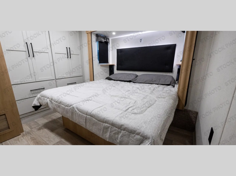 The perfect fifth wheel for a larger family! This unit sleeps eight or more with the full and half lofts above the rear master bedroom and bathroom. In the full loft area there are two 44" x 74" bunk mats for comfort as well as wardrobe/storage at the head of each. The master bedroom features a king size bed that slides out to create more space by the bed. A spacious bath features a walk-in shower for comfort and includes a seat so you can relax while you shower. A spacious kitchen features two slides, a free standing dinette in one, and the 12V refrigerator and stove in the other. There is also a center island with large sink for added food prep space. Head up the steps in front to a dual slide front living area with 50" TV and fireplace beneath the window. There is also theater seating opposite the TV, and a tri-fold hide-a-bed in each slide allowing added sleeping space when needed.