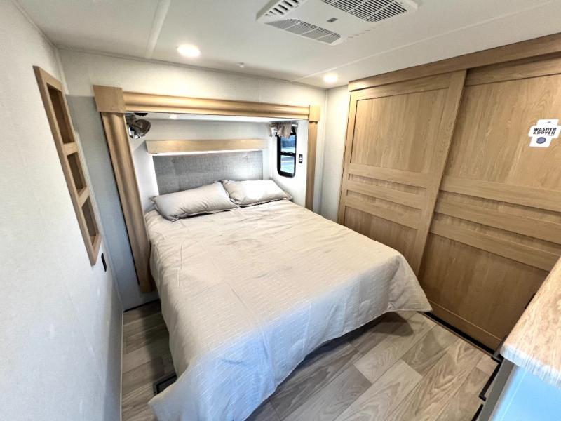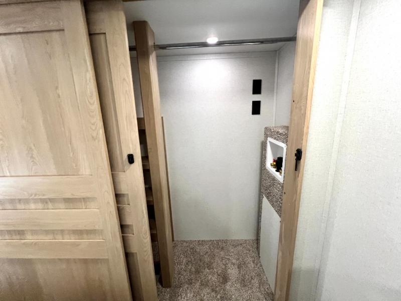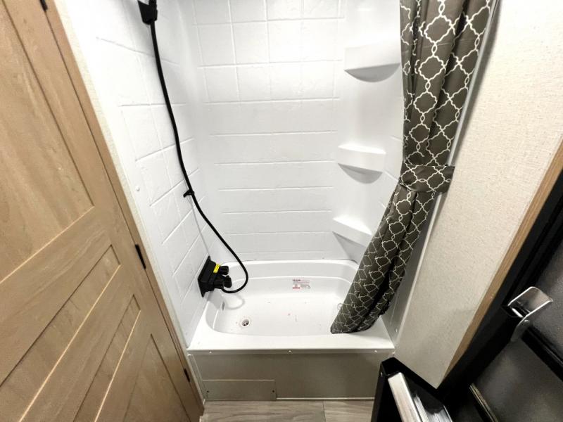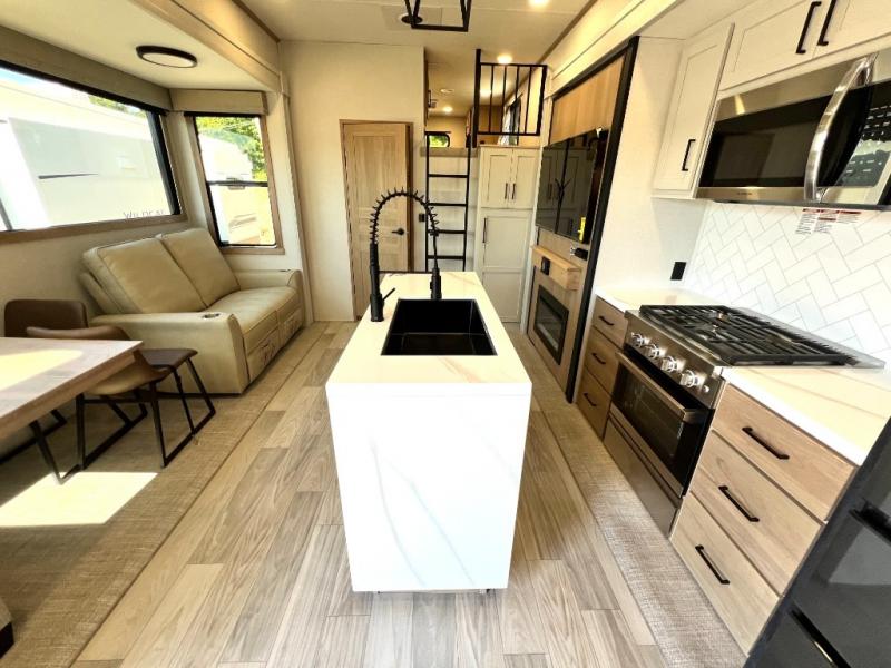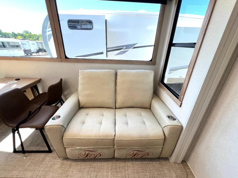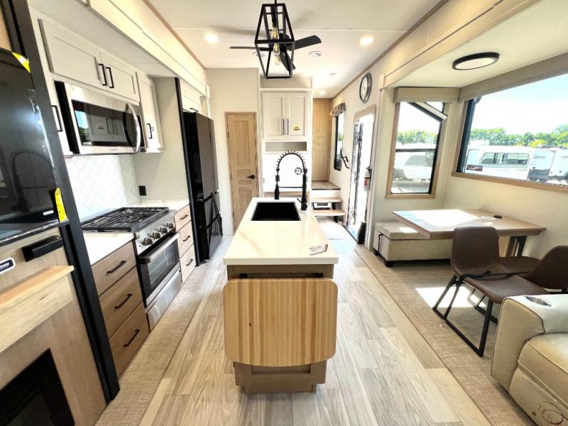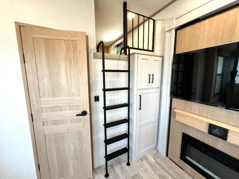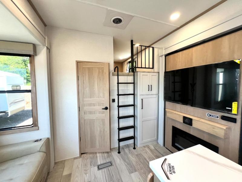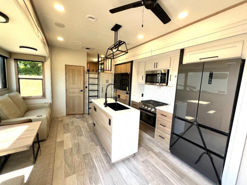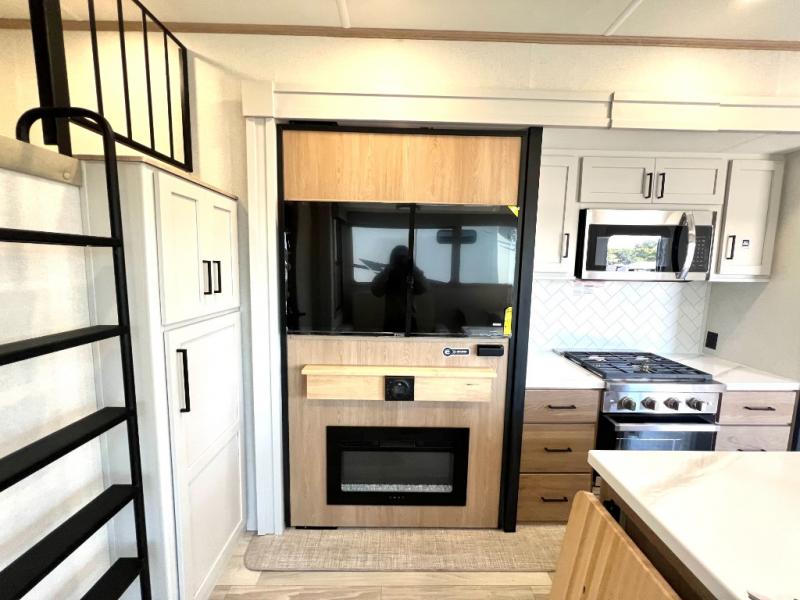 Enjoy a home on wheels with this fifth wheel! There are two bedrooms to choose from plus an upper loft with two 32" x 74" bunk mats, cabinets, and TV prep. The front private bedroom has a queen bed slide across from a dresser and a front wardrobe that is prepped to add an optional washer and dryer. The second bedroom has a queen bed slide across from a dresser with wardrobes on either side, plus it's very own full rear bathroom which has a 36" x 24" tub and a rear entry/exit door to the unit. The second full bathroom has a shower with a seat so everyone can get ready quickly in the morning. Prepare your best home cooked meals with the kitchen island and three burner cooktop then enjoy it at the free standing dinette. Relax in true comfort each night in the theater seating across from the fireplace and 50" TV at the entertainment center!