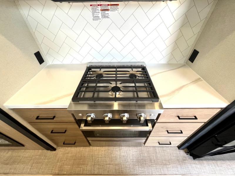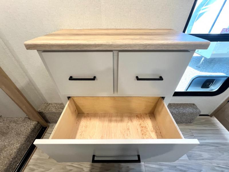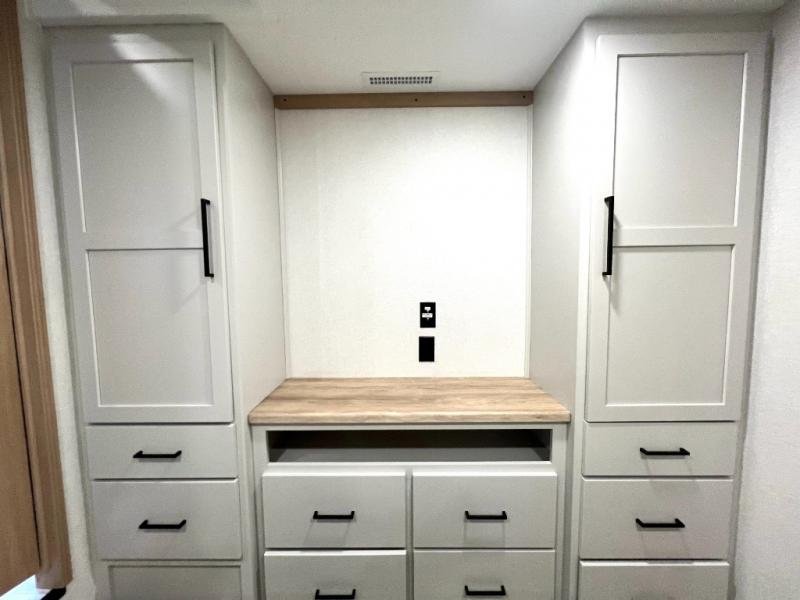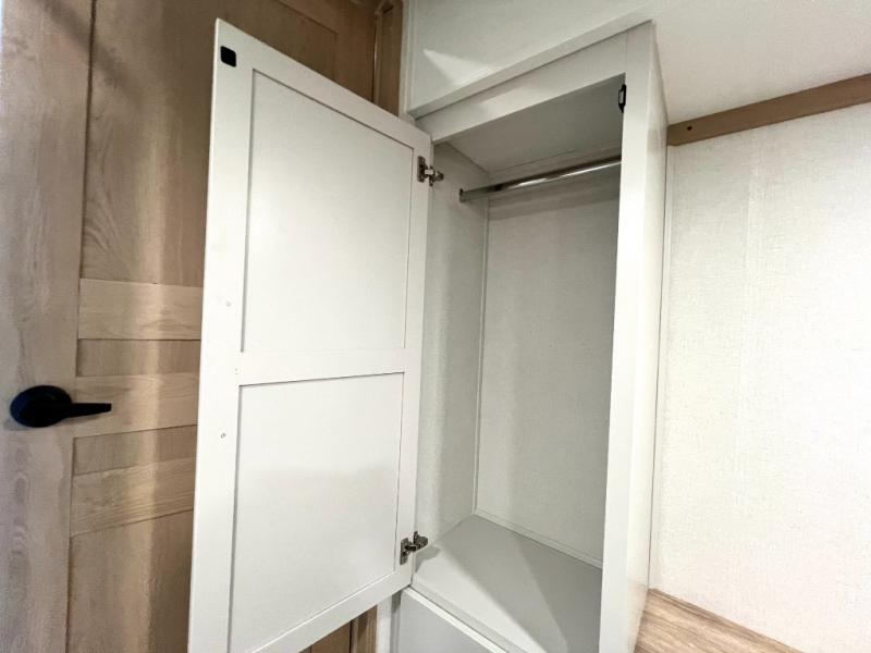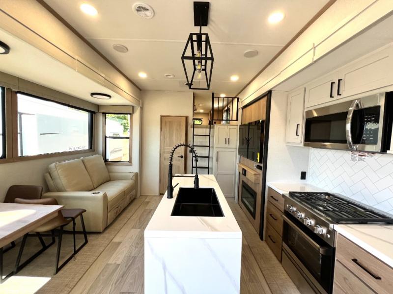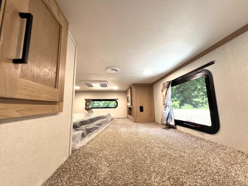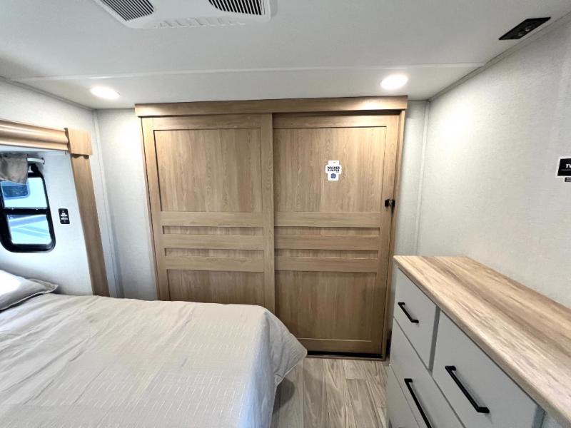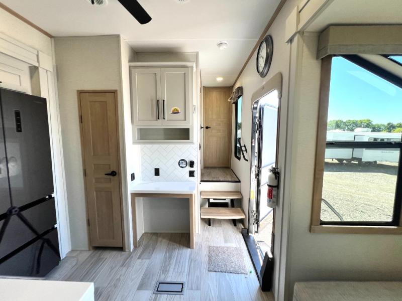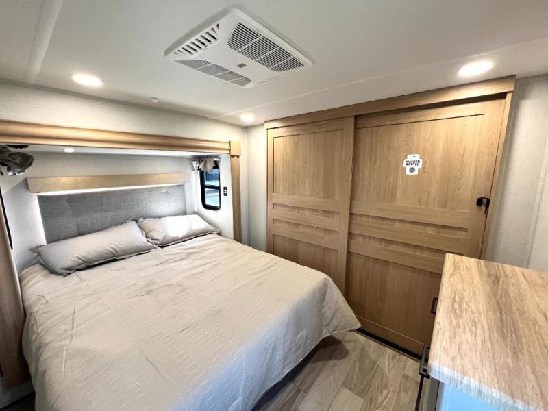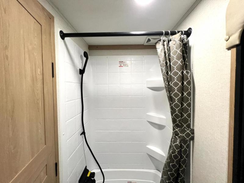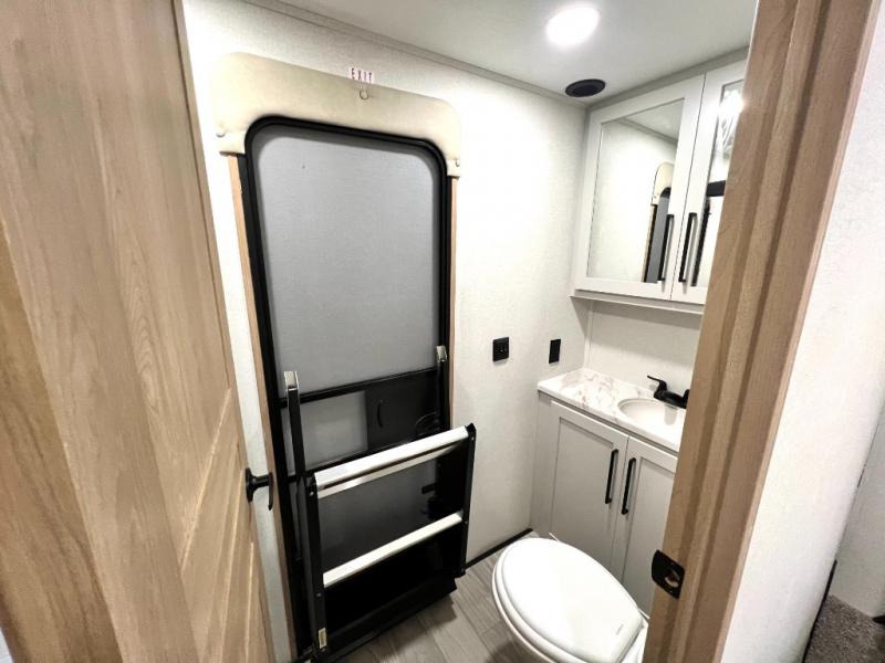 Enjoy a home on wheels with this fifth wheel! There are two bedrooms to choose from plus an upper loft with two 32" x 74" bunk mats, cabinets, and TV prep. The front private bedroom has a queen bed slide across from a dresser and a front wardrobe that is prepped to add an optional washer and dryer. The second bedroom has a queen bed slide across from a dresser with wardrobes on either side, plus it's very own full rear bathroom which has a 36" x 24" tub and a rear entry/exit door to the unit. The second full bathroom has a shower with a seat so everyone can get ready quickly in the morning. Prepare your best home cooked meals with the kitchen island and three burner cooktop then enjoy it at the free standing dinette. Relax in true comfort each night in the theater seating across from the fireplace and 50" TV at the entertainment center!