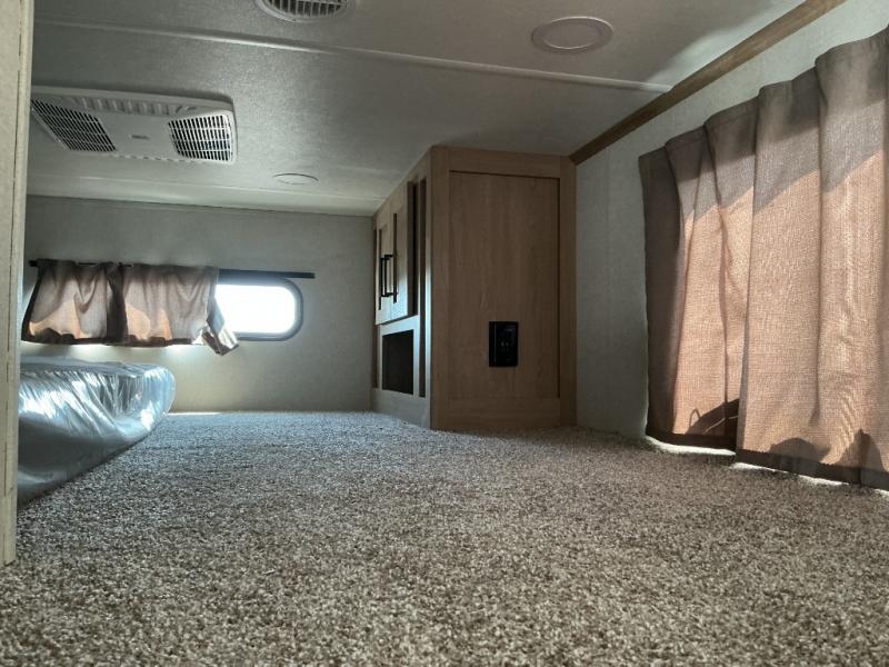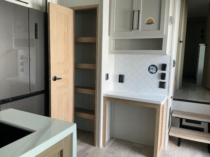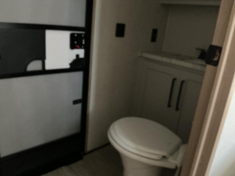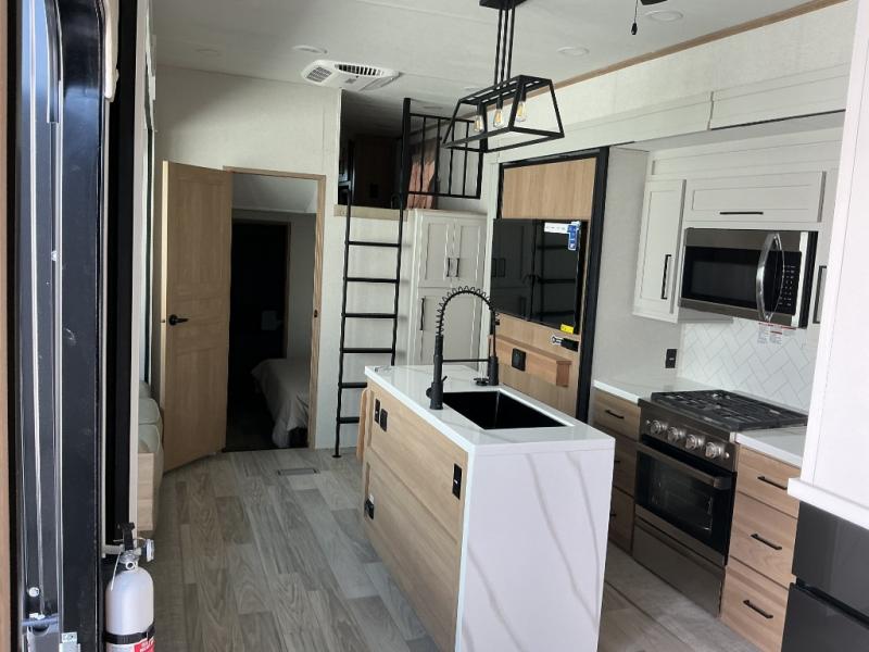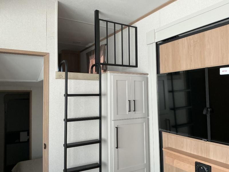 Enjoy a home on wheels with this fifth wheel! There are two bedrooms to choose from plus an upper loft with two 32" x 74" bunk mats, cabinets, and TV prep. The front private bedroom has a queen bed slide across from a dresser and a front wardrobe that is prepped to add an optional washer and dryer. The second bedroom has a queen bed slide across from a dresser with wardrobes on either side, plus it's very own full rear bathroom which has a 36" x 24" tub and a rear entry/exit door to the unit. The second full bathroom has a shower with a seat so everyone can get ready quickly in the morning. Prepare your best home cooked meals with the kitchen island and three burner cooktop then enjoy it at the free standing dinette. Relax in true comfort each night in the theater seating across from the fireplace and 50" TV at the entertainment center!