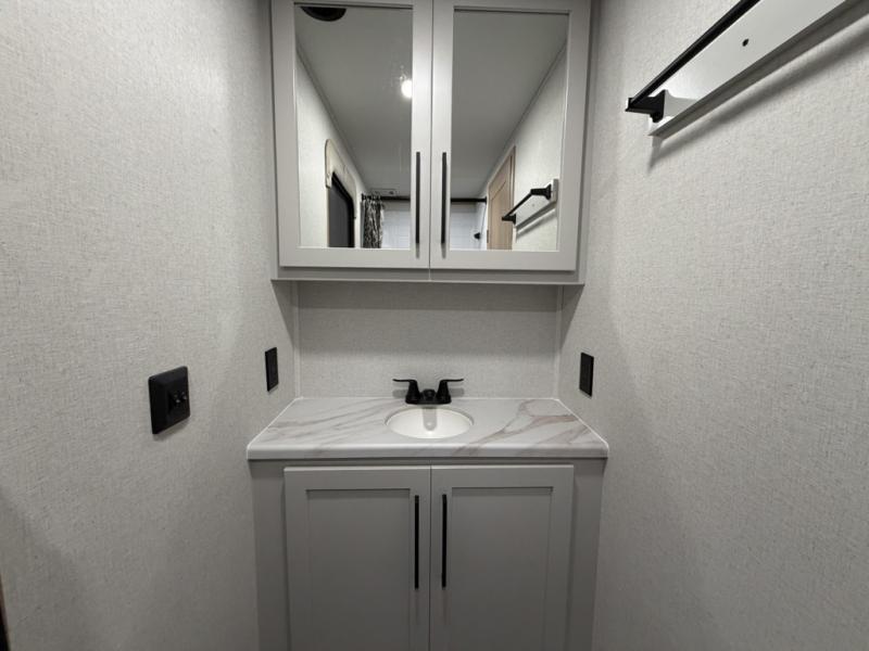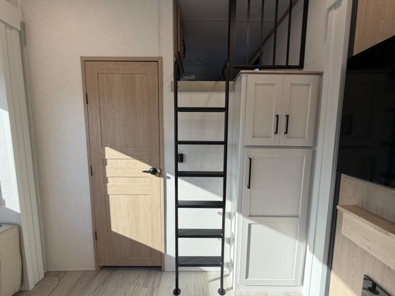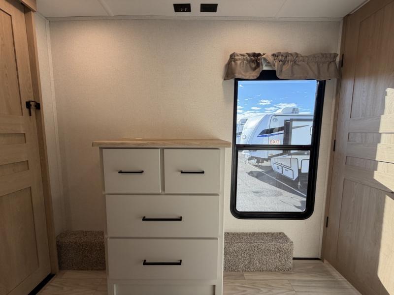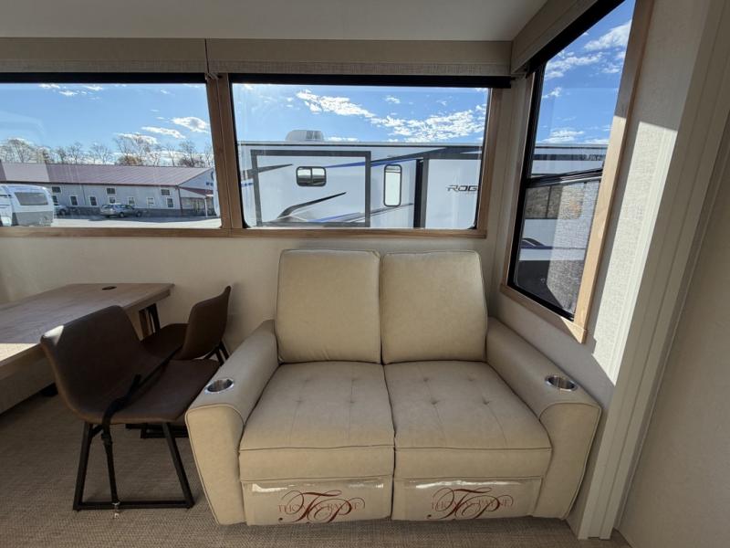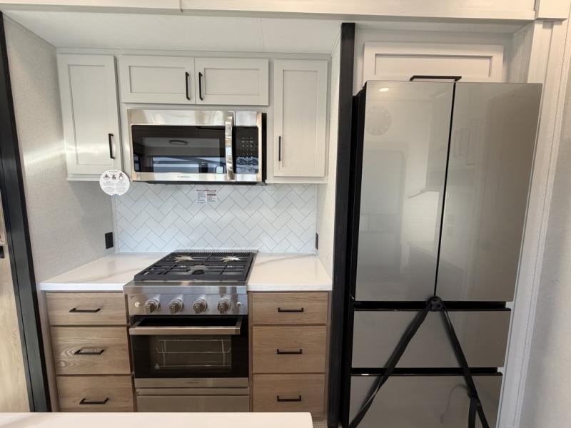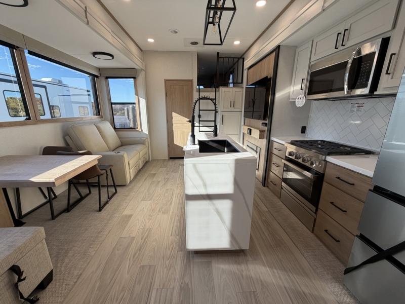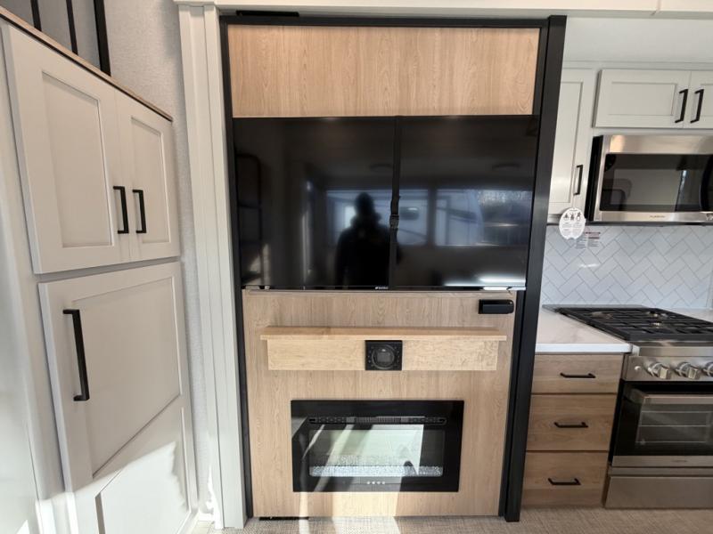 Enjoy a home on wheels with this fifth wheel! There are two bedrooms to choose from plus an upper loft with two 32" x 74" bunk mats, cabinets, and TV prep. The front private bedroom has a queen bed slide across from a dresser and next to a front wardrobe that is prepped to add an optional washer and dryer. The second bedroom has a queen bed slide across from a dresser with wardrobes on either side, plus it's very own full rear bathroom which has a tub and a rear entry/exit door to the unit. The second full bathroom has a one-piece fiberglass shower so everyone can get ready quickly in the morning. Prepare your best home cooked meals with the kitchen island and three burner cooktop then enjoy it at the free-standing dinette. Relax in true comfort each night in the theater seating across from the fireplace and 50" TV at the entertainment center!