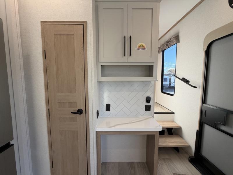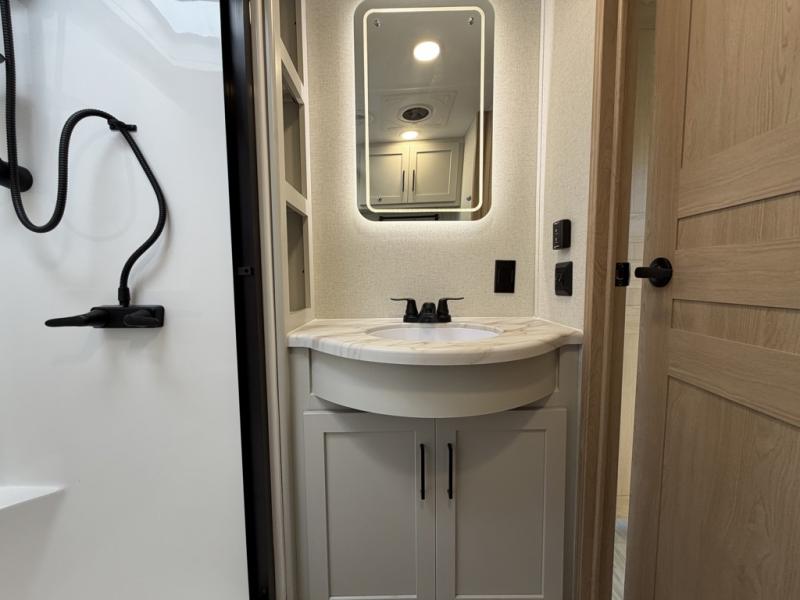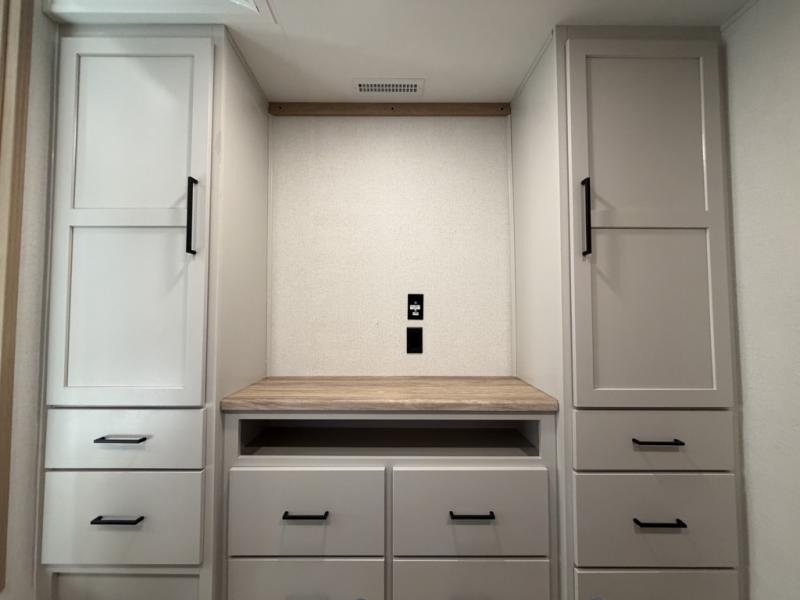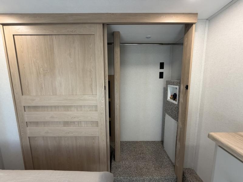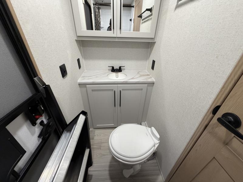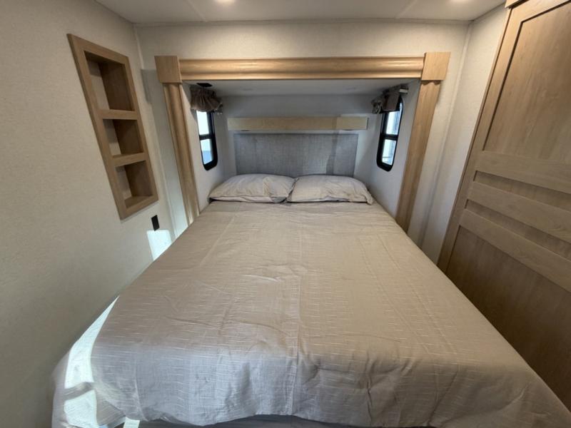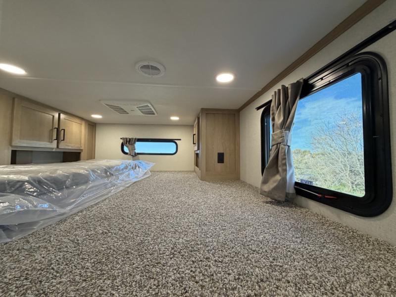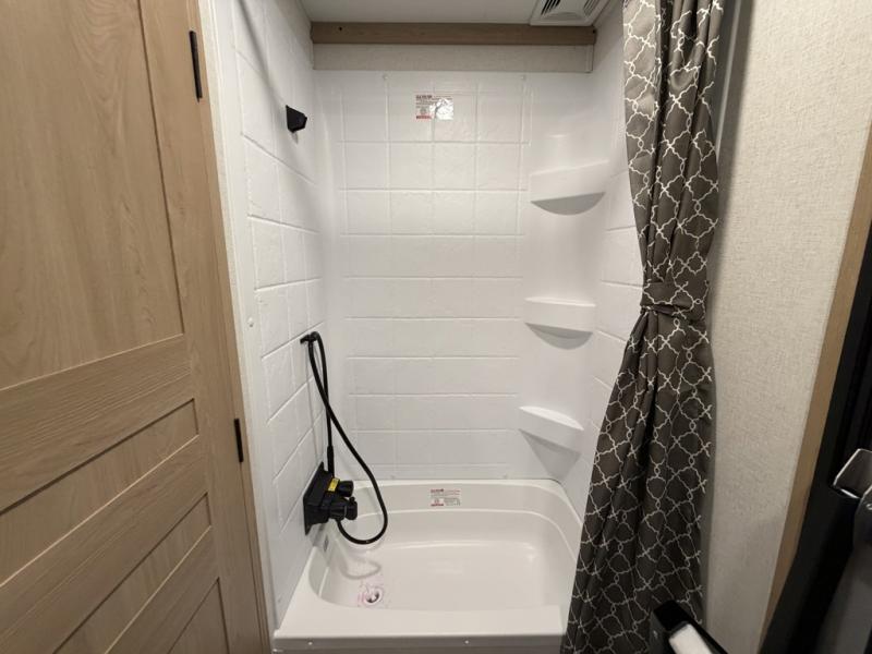 Enjoy a home on wheels with this fifth wheel! There are two bedrooms to choose from plus an upper loft with two 32" x 74" bunk mats, cabinets, and TV prep. The front private bedroom has a queen bed slide across from a dresser and next to a front wardrobe that is prepped to add an optional washer and dryer. The second bedroom has a queen bed slide across from a dresser with wardrobes on either side, plus it's very own full rear bathroom which has a tub and a rear entry/exit door to the unit. The second full bathroom has a one-piece fiberglass shower so everyone can get ready quickly in the morning. Prepare your best home cooked meals with the kitchen island and three burner cooktop then enjoy it at the free-standing dinette. Relax in true comfort each night in the theater seating across from the fireplace and 50" TV at the entertainment center!