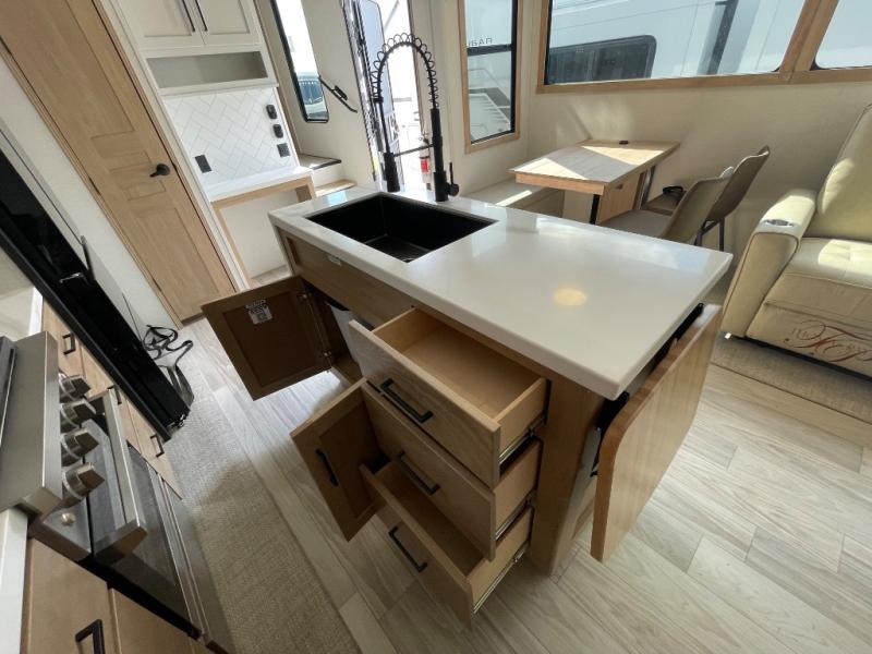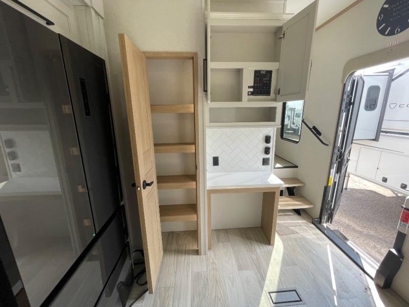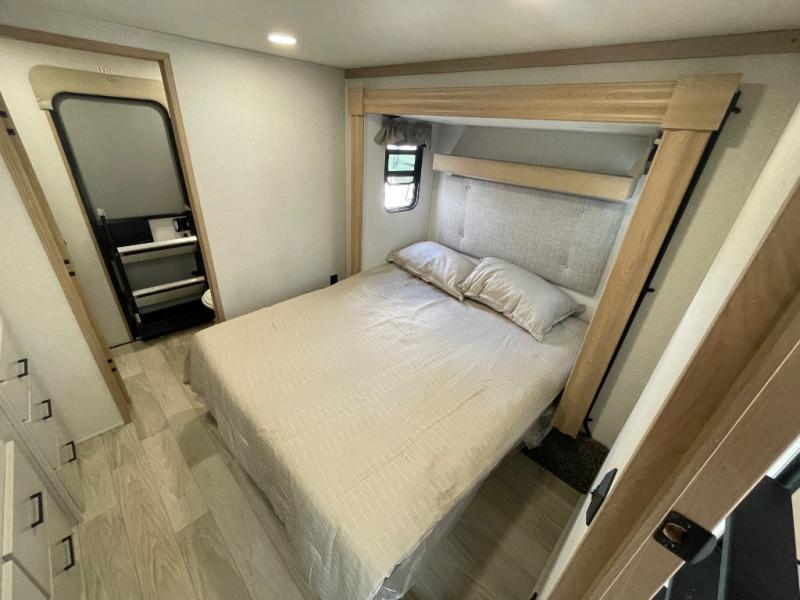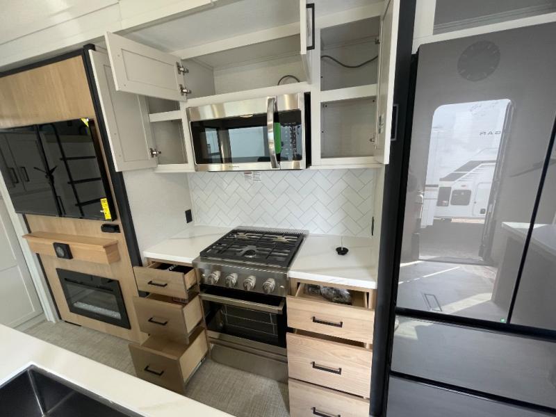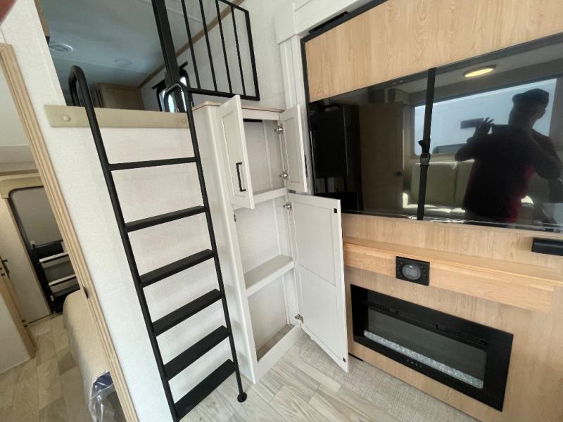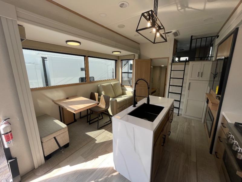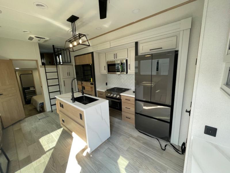 Enjoy a home on wheels with this fifth wheel! There are two bedrooms to choose from plus an upper loft with two 32" x 74" bunk mats, cabinets, and TV prep. The front private bedroom has a queen bed slide across from a dresser and next to a front wardrobe that is prepped to add an optional washer and dryer. The second bedroom has a queen bed slide across from a dresser with wardrobes on either side, plus it's very own full rear bathroom which has a tub and a rear entry/exit door to the unit. The second full bathroom has a one-piece fiberglass shower so everyone can get ready quickly in the morning. Prepare your best home cooked meals with the kitchen island and three burner cooktop then enjoy it at the free-standing dinette. Relax in true comfort each night in the theater seating across from the fireplace and 50" TV at the entertainment center!