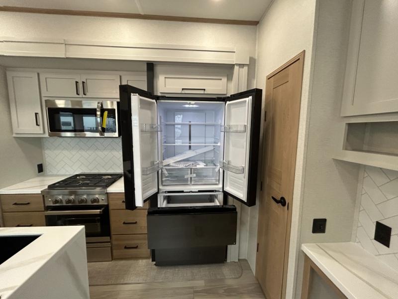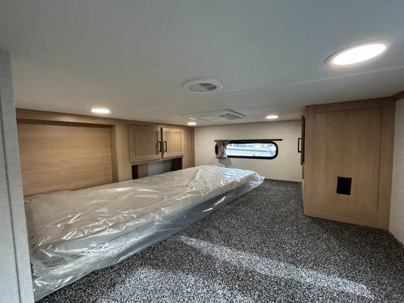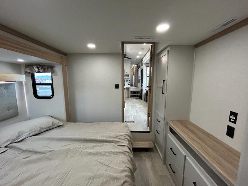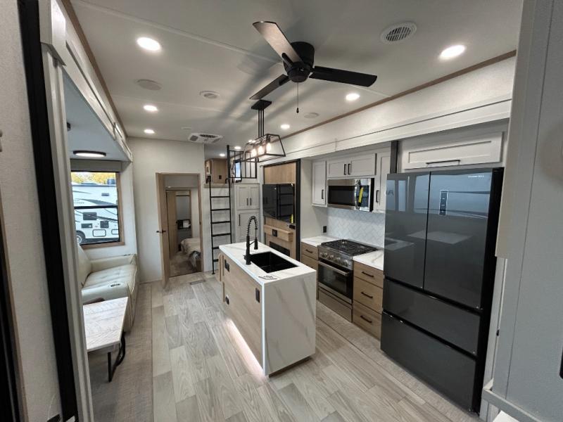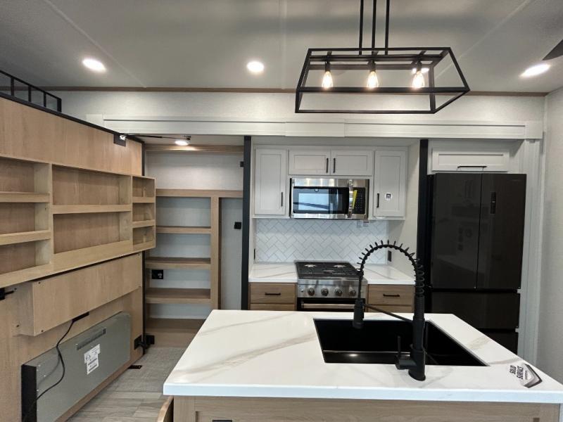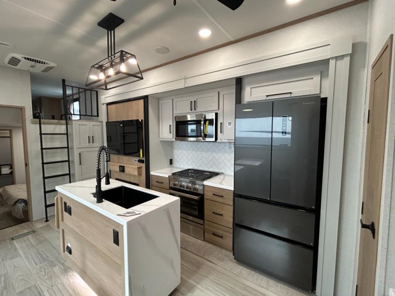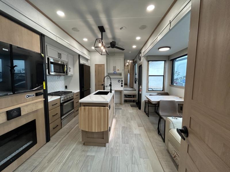 Enjoy a home on wheels with this fifth wheel! There are two bedrooms to choose from plus an upper loft with two 32" x 74" bunk mats, cabinets, and TV prep. The front private bedroom has a queen bed slide across from a dresser and next to a front wardrobe that is prepped to add an optional washer and dryer. The second bedroom has a queen bed slide across from a dresser with wardrobes on either side, plus it's very own full rear bathroom which has a tub and a rear entry/exit door to the unit. The second full bathroom has a one-piece fiberglass shower so everyone can get ready quickly in the morning. Prepare your best home cooked meals with the kitchen island and three burner cooktop then enjoy it at the free-standing dinette. Relax in true comfort each night in the theater seating across from the fireplace and 50" TV at the entertainment center!