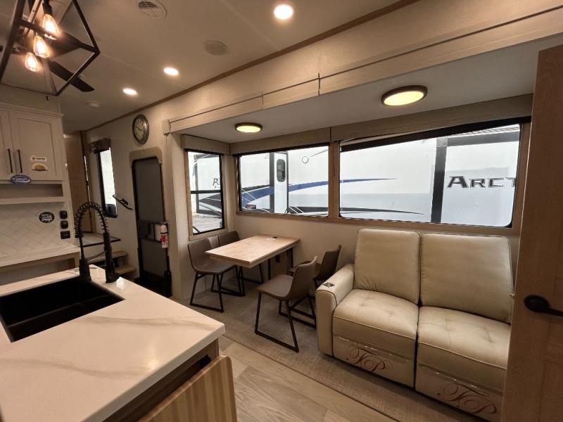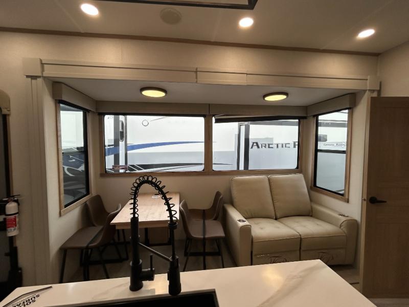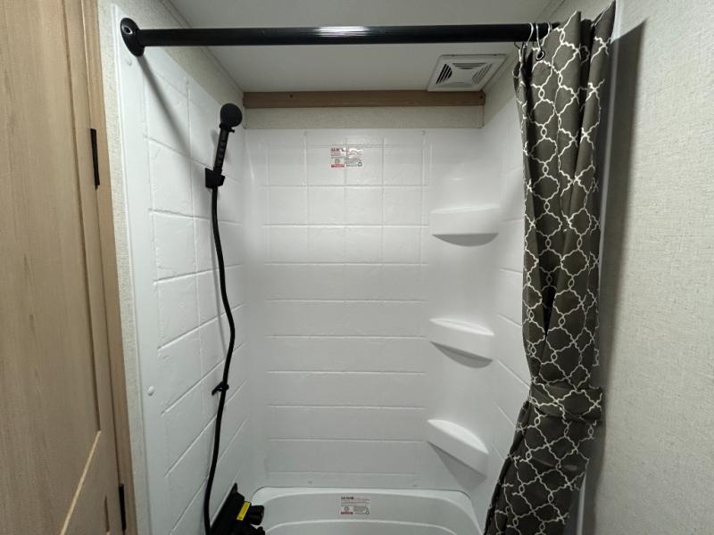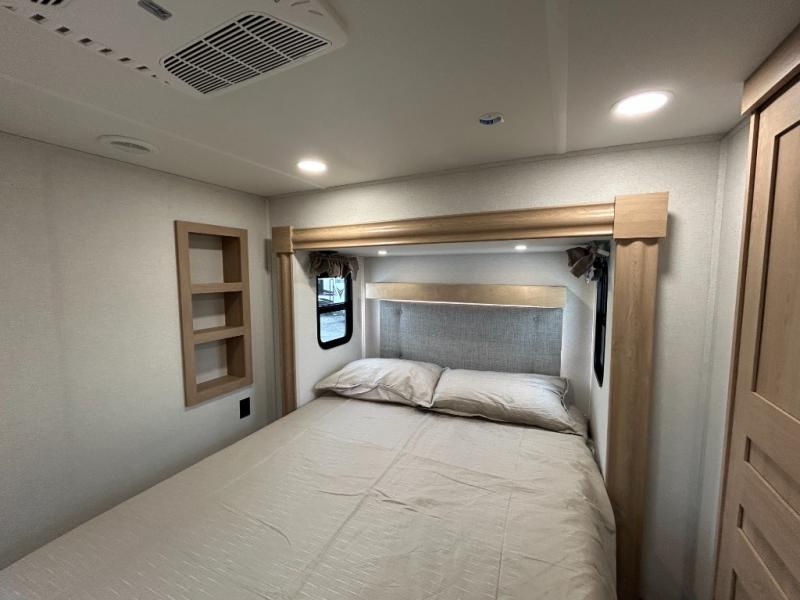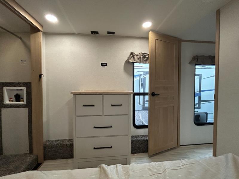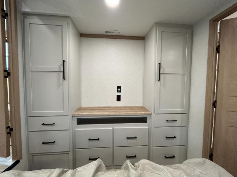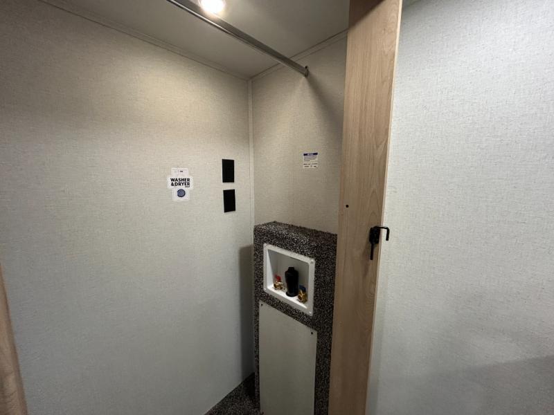 Enjoy a home on wheels with this fifth wheel! There are two bedrooms to choose from plus an upper loft with two 32" x 74" bunk mats, cabinets, and TV prep. The front private bedroom has a queen bed slide across from a dresser and next to a front wardrobe that is prepped to add an optional washer and dryer. The second bedroom has a queen bed slide across from a dresser with wardrobes on either side, plus it's very own full rear bathroom which has a tub and a rear entry/exit door to the unit. The second full bathroom has a one-piece fiberglass shower so everyone can get ready quickly in the morning. Prepare your best home cooked meals with the kitchen island and three burner cooktop then enjoy it at the free-standing dinette. Relax in true comfort each night in the theater seating across from the fireplace and 50" TV at the entertainment center!