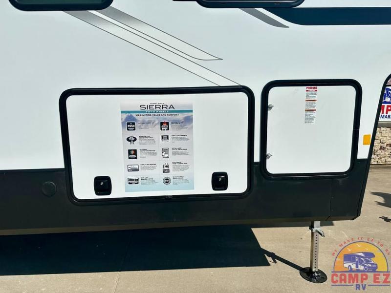 Each one of these Forest River Sierra fifth wheels are equipped with everything you need to make the most of each adventure! The underbelly armor will protect your unit's vitals from road debris and the painted two tone aerodynamic fiberglass front cap has an improved turning radius to make them easier to navigate. With an electric leveling system, you can set your unit up quick and easy then get to having fun faster than ever. The cambered powder coated frame with rust prohibitor construction allows for more duration of the fifth wheel. Each model also comes with a TV antenna with booster, 60,000BTU on demand tankless water heater, Goodyear Radial tires with 7,000 lb. axles, and the list goes on. The interior is just as impressive with Beachside Sundance Congoleum linoleum, recessed residential lighting, a memory foam mattress, and hidden hinged, soft close drawers and cabinets!