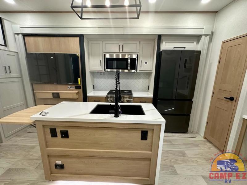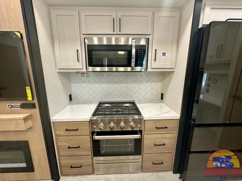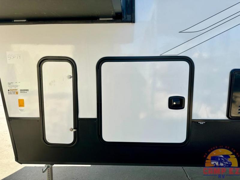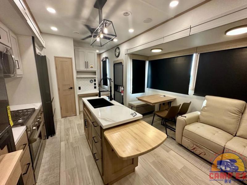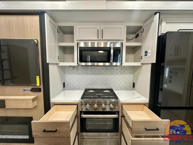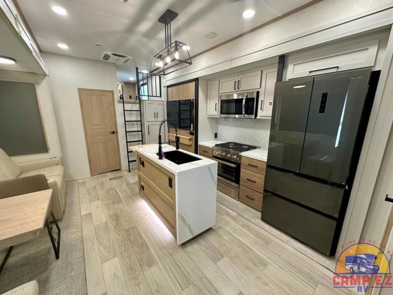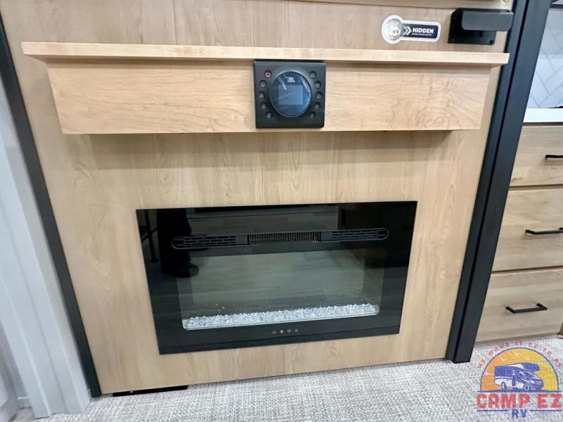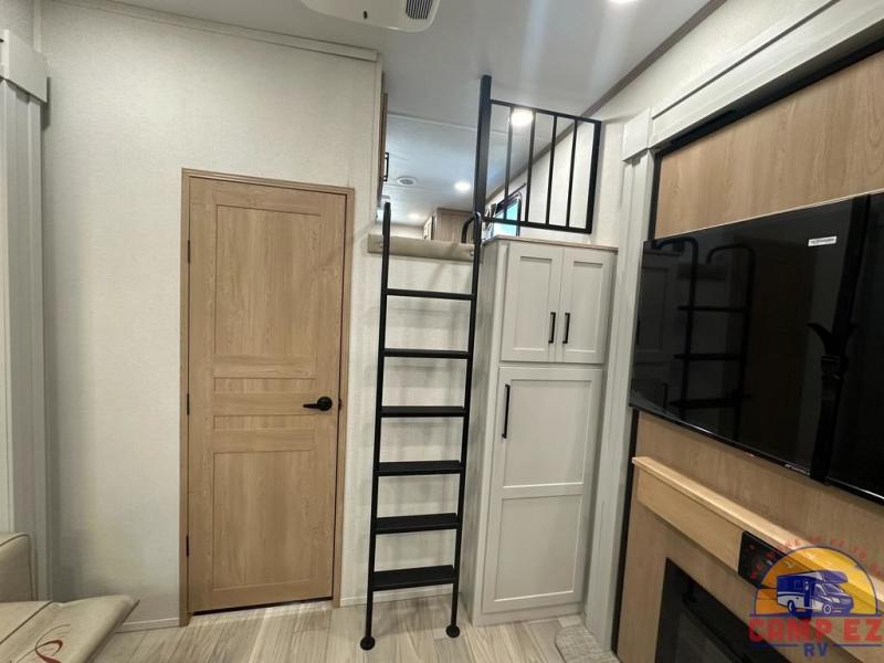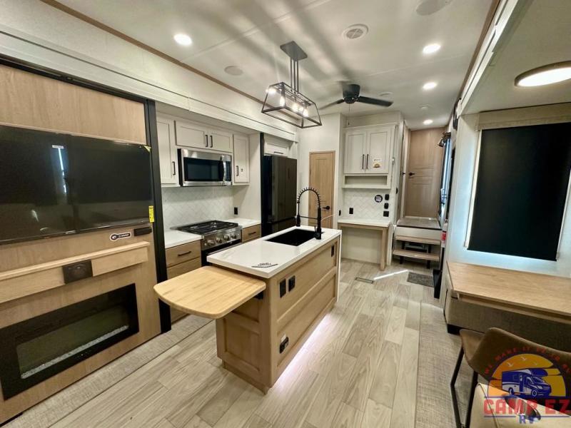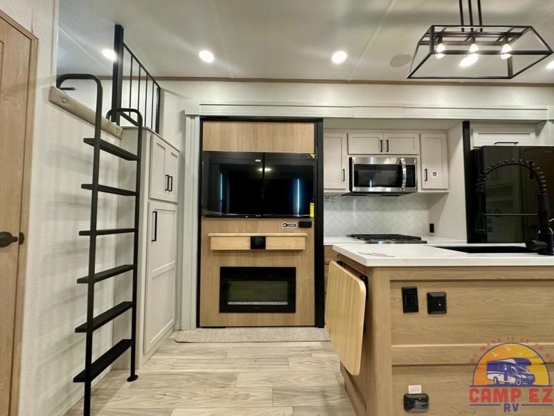 Enjoy a home on wheels with this fifth wheel! There are two bedrooms to choose from plus an upper loft with two 32" x 74" bunk mats, cabinets, and TV prep. The front private bedroom has a queen bed slide across from a dresser and next to a front wardrobe that is prepped to add an optional washer and dryer. The second bedroom has a queen bed slide across from a dresser with wardrobes on either side, plus it's very own full rear bathroom which has a tub and a rear entry/exit door to the unit. The second full bathroom has a one-piece fiberglass shower so everyone can get ready quickly in the morning. Prepare your best home cooked meals with the kitchen island and three burner cooktop then enjoy it at the free-standing dinette. Relax in true comfort each night in the theater seating across from the fireplace and 50" TV at the entertainment center!