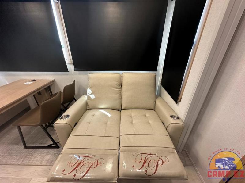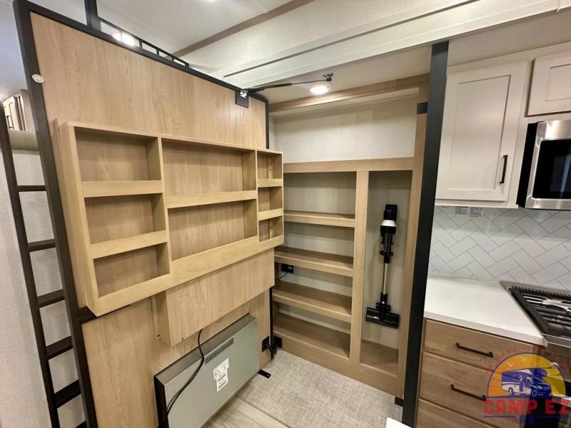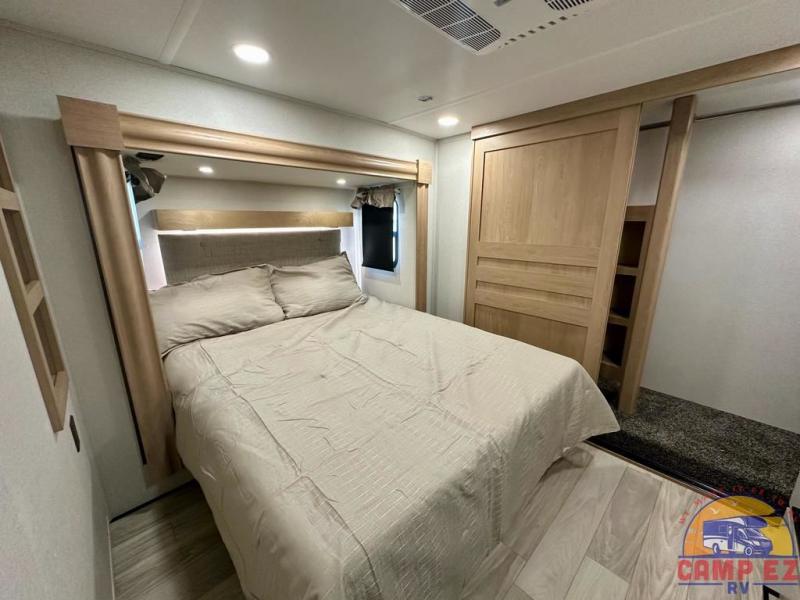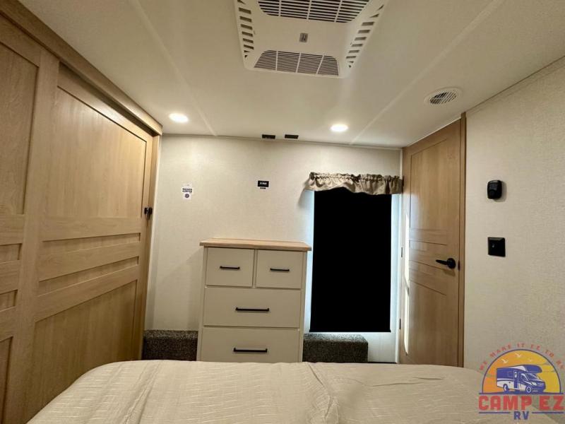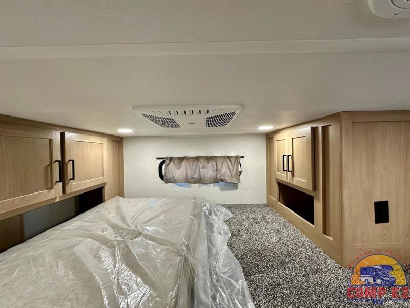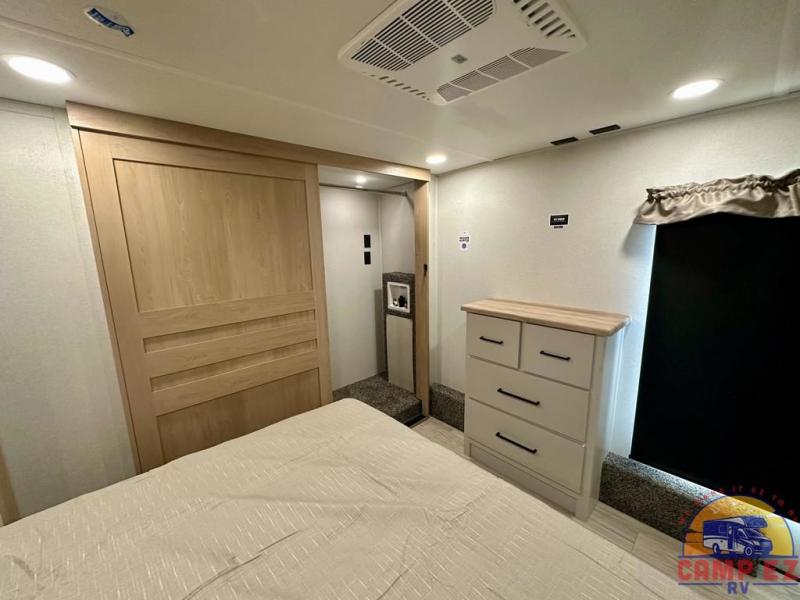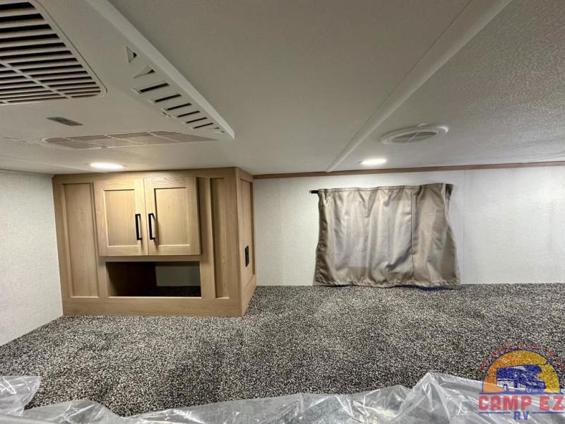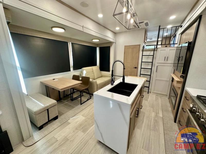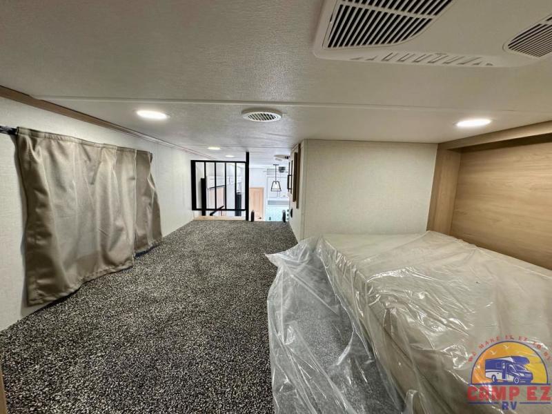 Enjoy a home on wheels with this fifth wheel! There are two bedrooms to choose from plus an upper loft with two 32" x 74" bunk mats, cabinets, and TV prep. The front private bedroom has a queen bed slide across from a dresser and next to a front wardrobe that is prepped to add an optional washer and dryer. The second bedroom has a queen bed slide across from a dresser with wardrobes on either side, plus it's very own full rear bathroom which has a tub and a rear entry/exit door to the unit. The second full bathroom has a one-piece fiberglass shower so everyone can get ready quickly in the morning. Prepare your best home cooked meals with the kitchen island and three burner cooktop then enjoy it at the free-standing dinette. Relax in true comfort each night in the theater seating across from the fireplace and 50" TV at the entertainment center!
