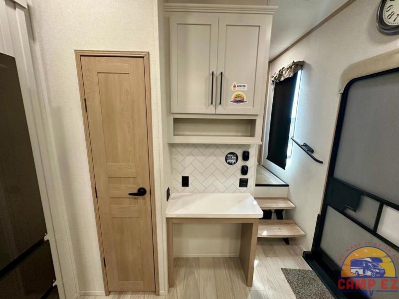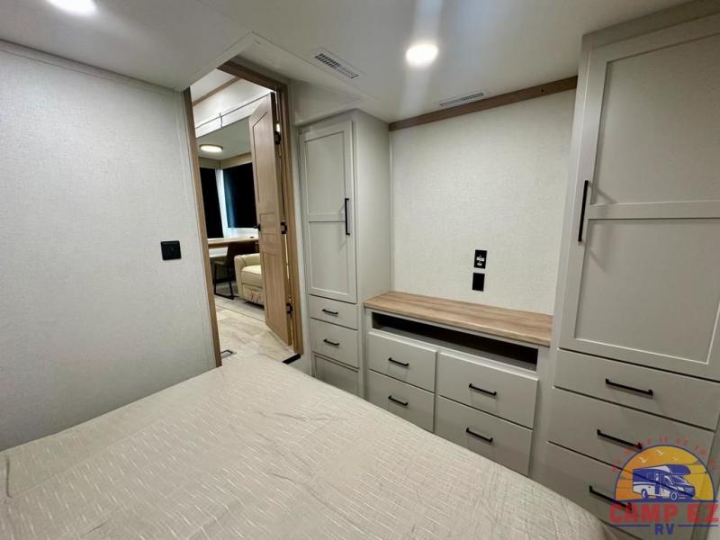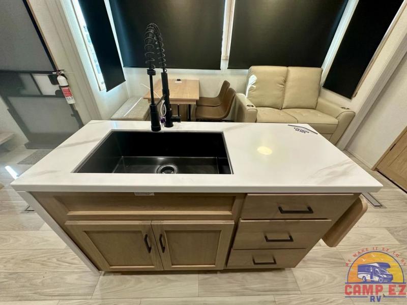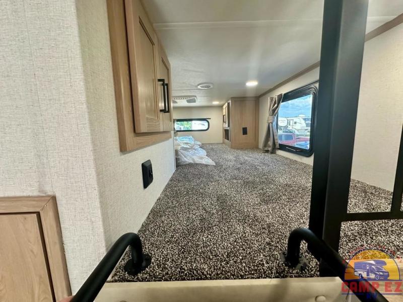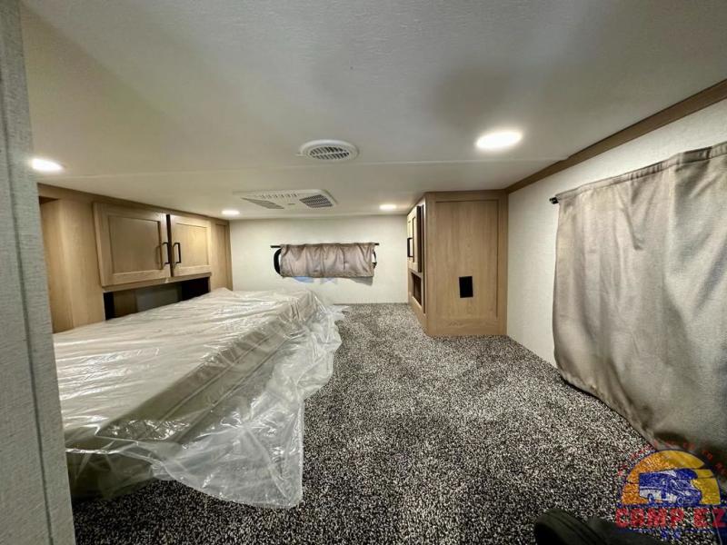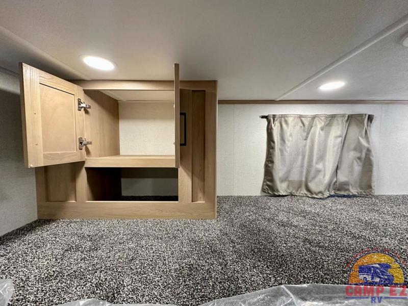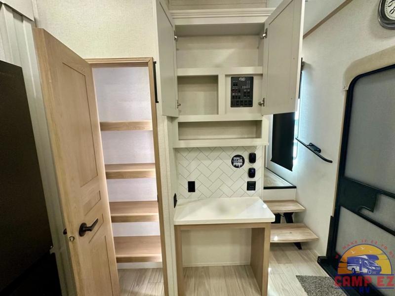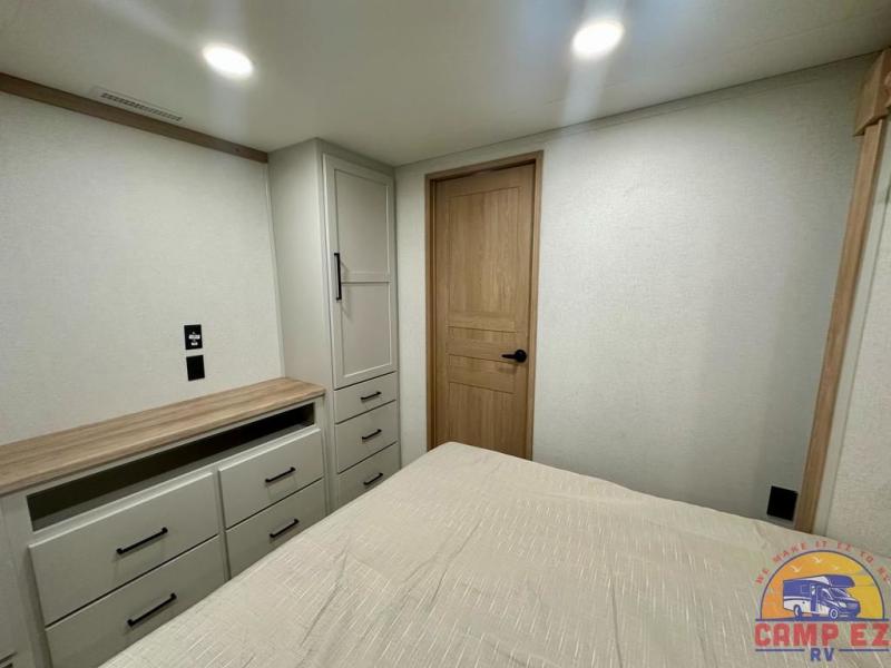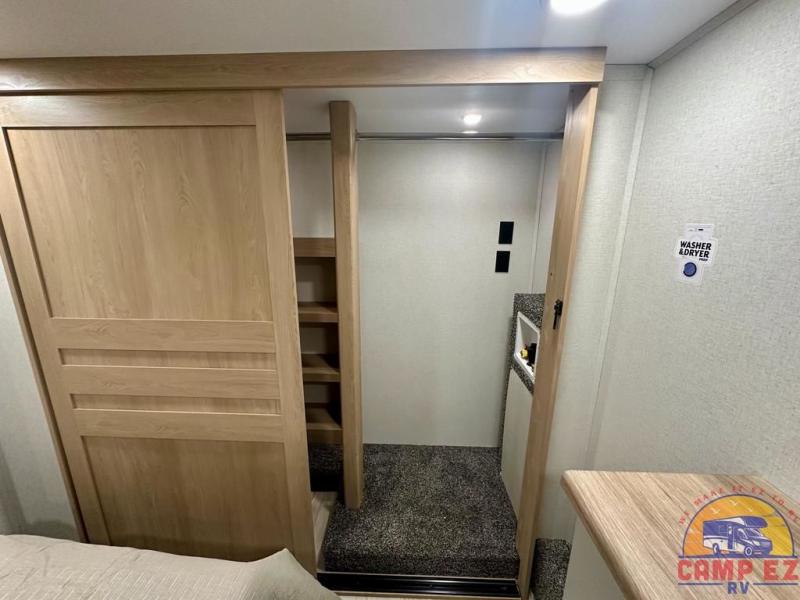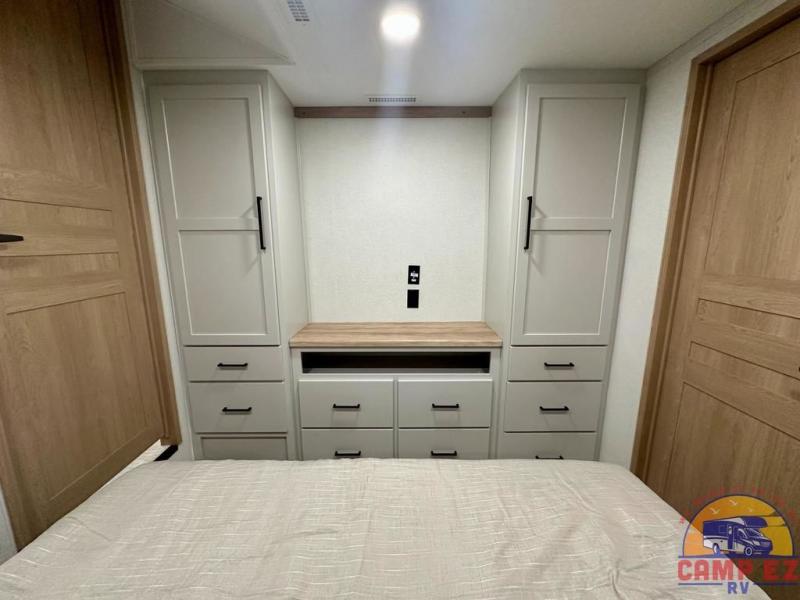 Enjoy a home on wheels with this fifth wheel! There are two bedrooms to choose from plus an upper loft with two 32" x 74" bunk mats, cabinets, and TV prep. The front private bedroom has a queen bed slide across from a dresser and next to a front wardrobe that is prepped to add an optional washer and dryer. The second bedroom has a queen bed slide across from a dresser with wardrobes on either side, plus it's very own full rear bathroom which has a tub and a rear entry/exit door to the unit. The second full bathroom has a one-piece fiberglass shower so everyone can get ready quickly in the morning. Prepare your best home cooked meals with the kitchen island and three burner cooktop then enjoy it at the free-standing dinette. Relax in true comfort each night in the theater seating across from the fireplace and 50" TV at the entertainment center!