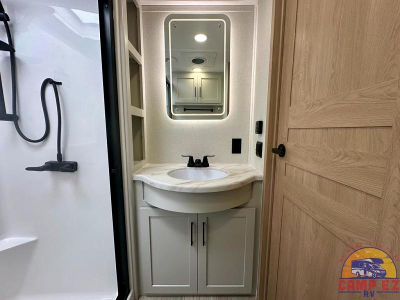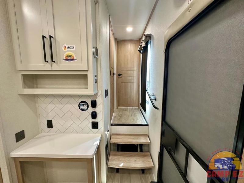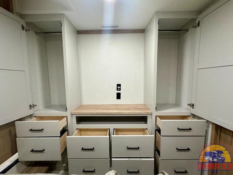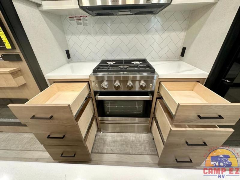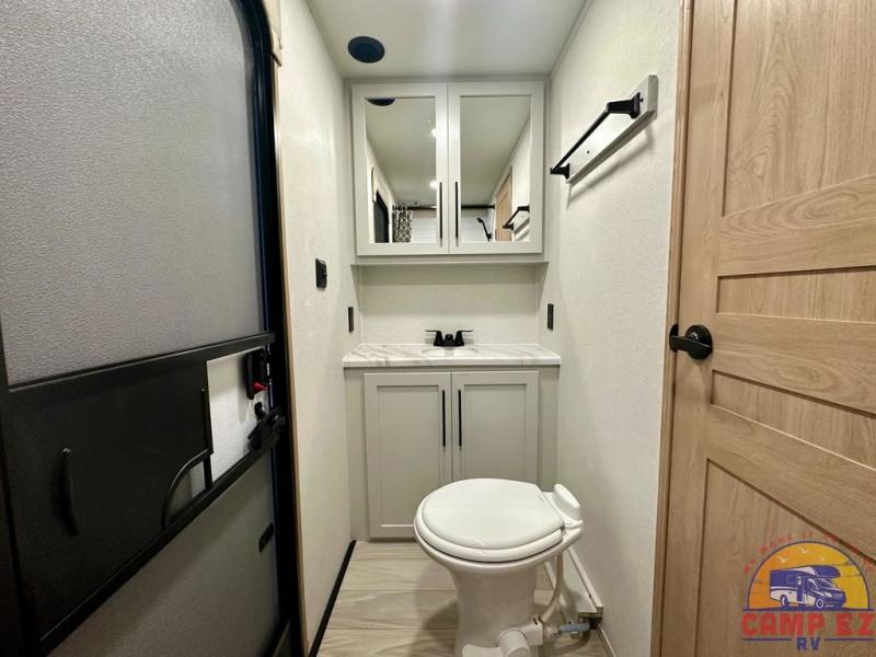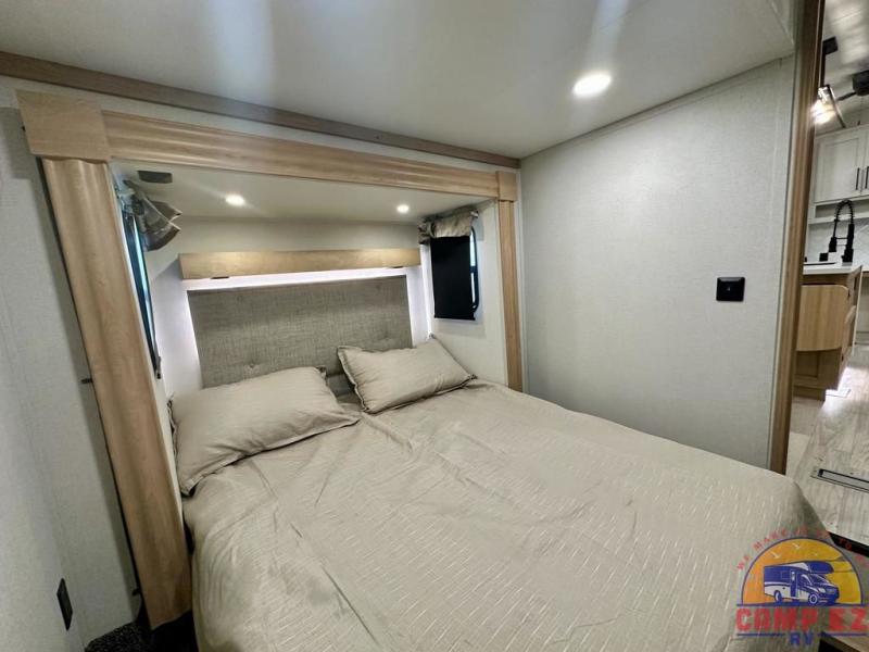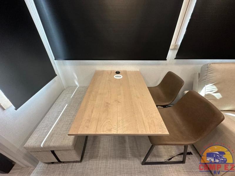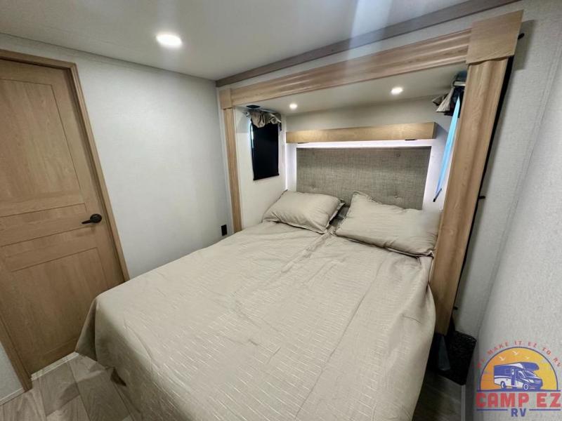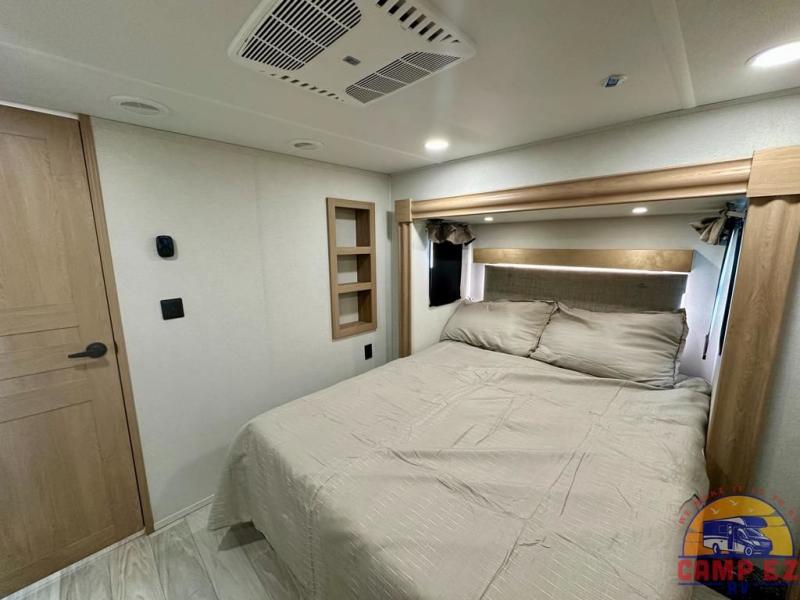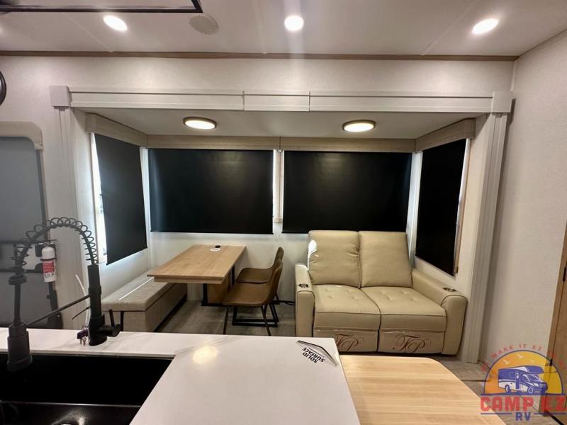 Enjoy a home on wheels with this fifth wheel! There are two bedrooms to choose from plus an upper loft with two 32" x 74" bunk mats, cabinets, and TV prep. The front private bedroom has a queen bed slide across from a dresser and next to a front wardrobe that is prepped to add an optional washer and dryer. The second bedroom has a queen bed slide across from a dresser with wardrobes on either side, plus it's very own full rear bathroom which has a tub and a rear entry/exit door to the unit. The second full bathroom has a one-piece fiberglass shower so everyone can get ready quickly in the morning. Prepare your best home cooked meals with the kitchen island and three burner cooktop then enjoy it at the free-standing dinette. Relax in true comfort each night in the theater seating across from the fireplace and 50" TV at the entertainment center!