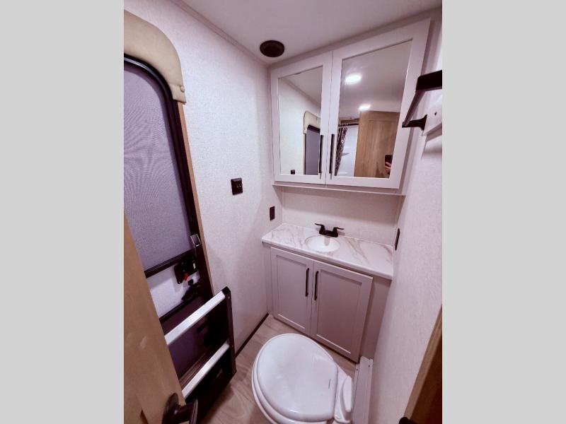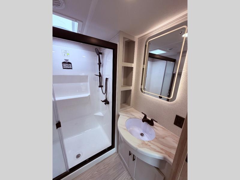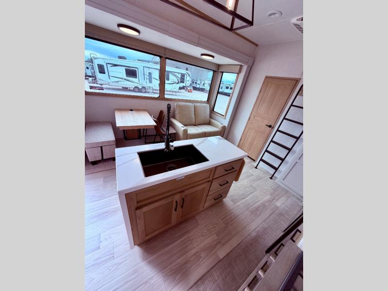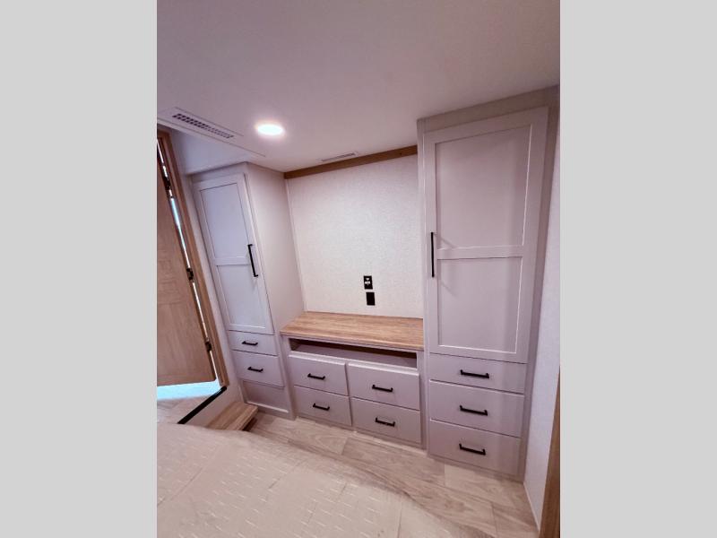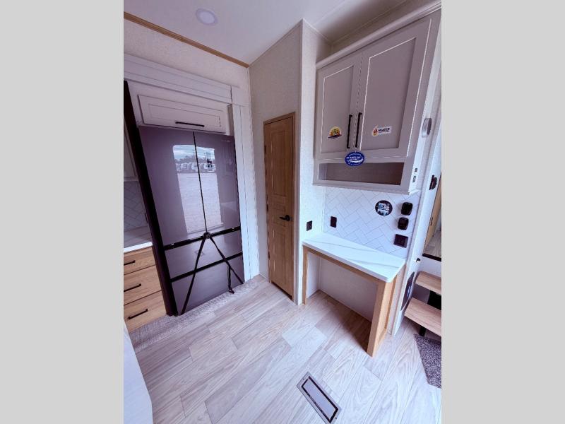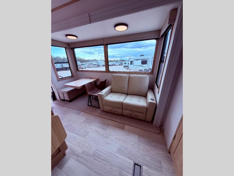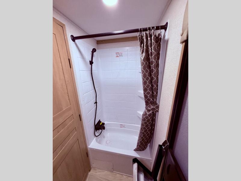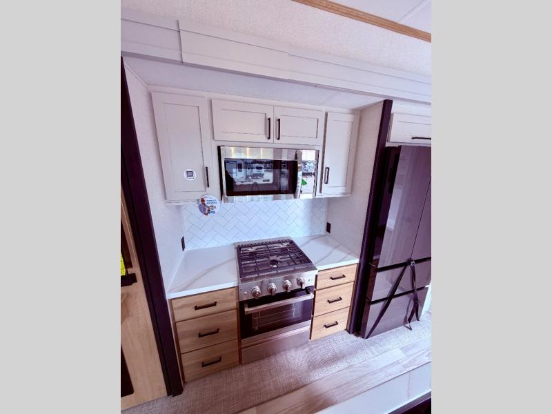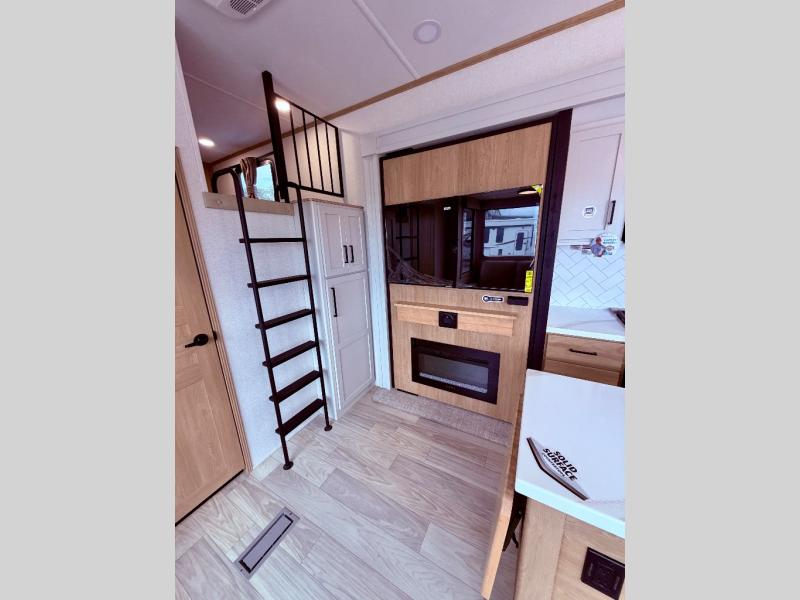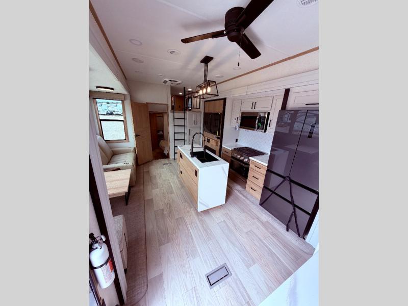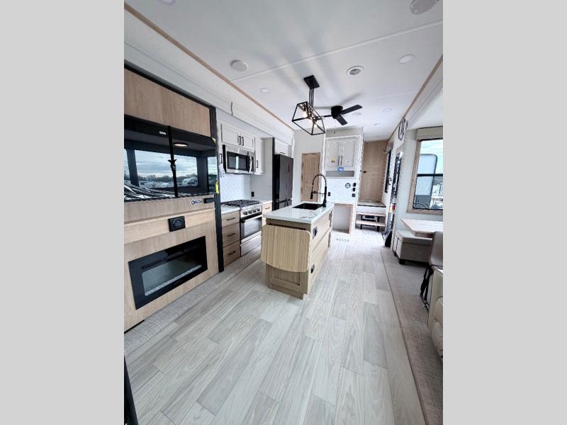 Enjoy a home on wheels with this fifth wheel! There are two bedrooms to choose from plus an upper loft with two 32" x 74" bunk mats, cabinets, and TV prep. The front private bedroom has a queen bed slide across from a dresser and next to a front wardrobe that is prepped to add an optional washer and dryer. The second bedroom has a queen bed slide across from a dresser with wardrobes on either side, plus it's very own full rear bathroom which has a tub and a rear entry/exit door to the unit. The second full bathroom has a one-piece fiberglass shower so everyone can get ready quickly in the morning. Prepare your best home cooked meals with the kitchen island and three burner cooktop then enjoy it at the free-standing dinette. Relax in true comfort each night in the theater seating across from the fireplace and 50" TV at the entertainment center!