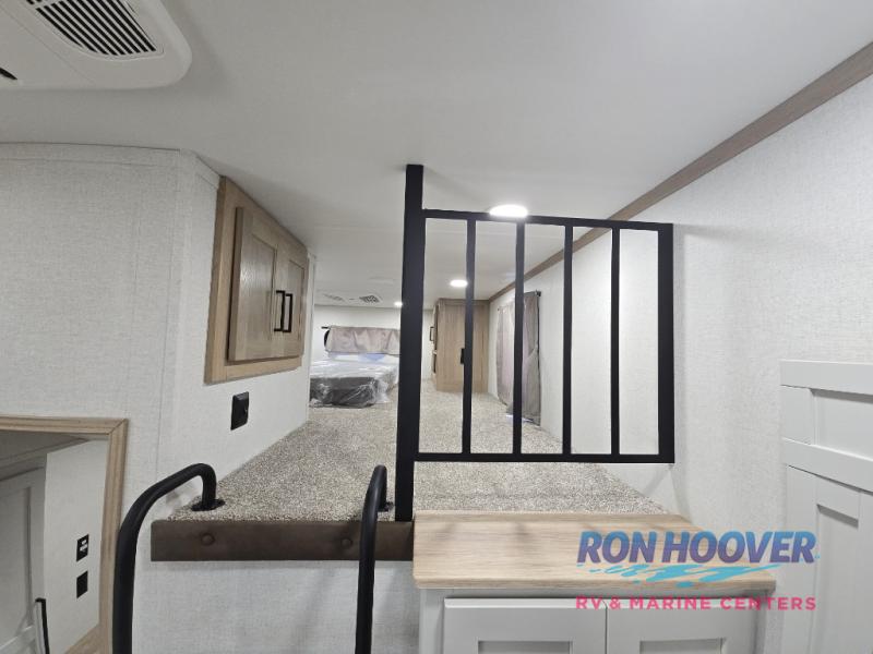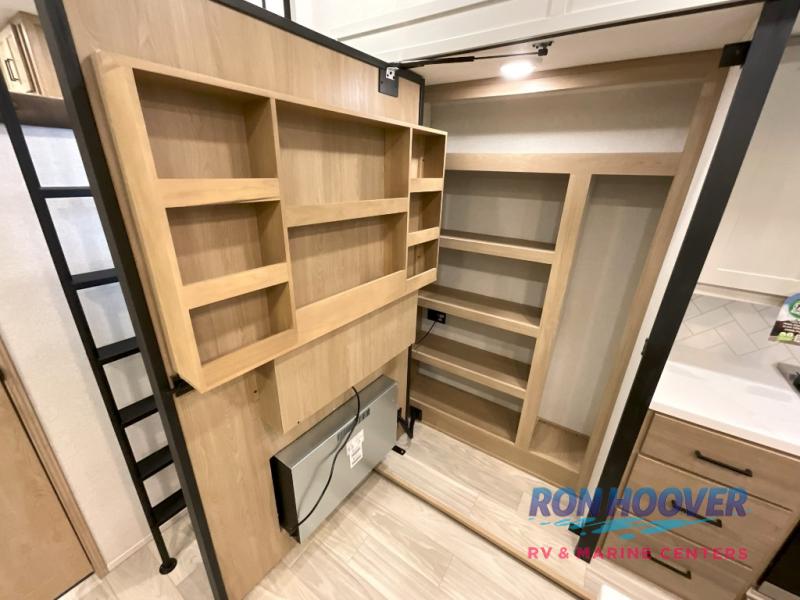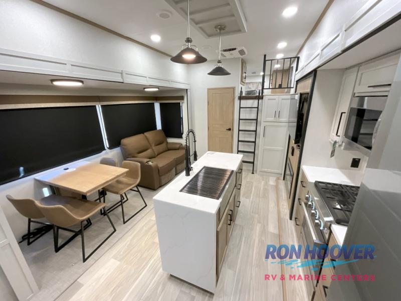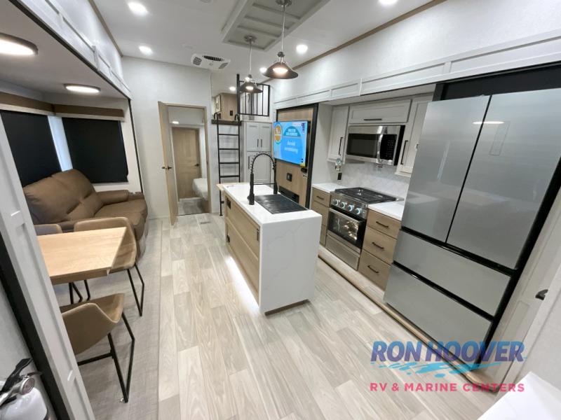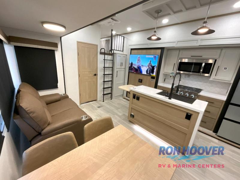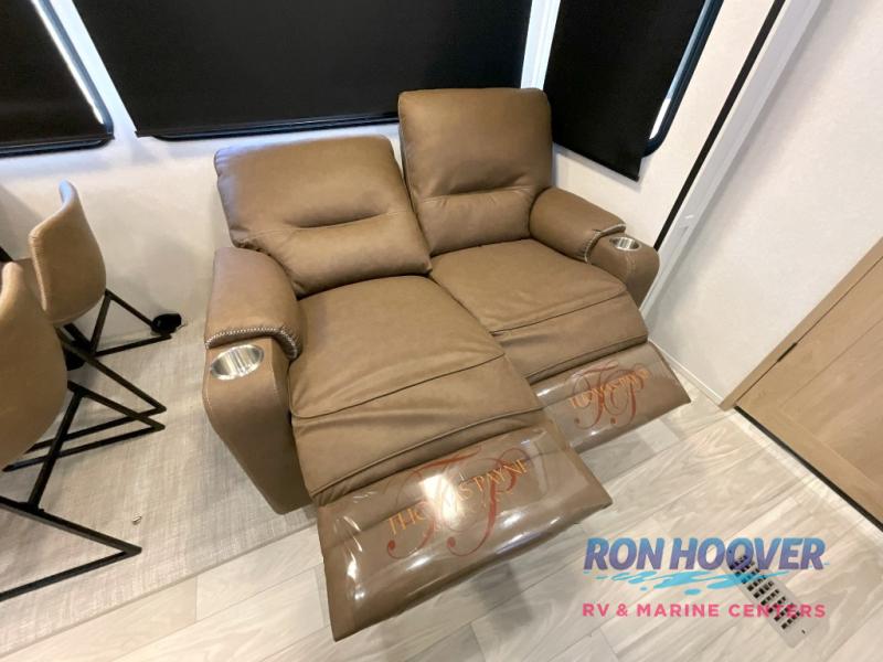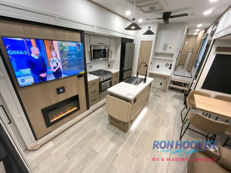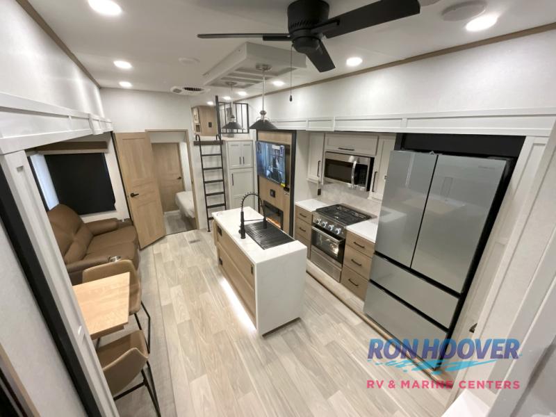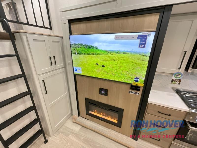 Enjoy a home on wheels with this fifth wheel! There are two bedrooms to choose from plus an upper loft with two 32" x 74" bunk mats, cabinets, and TV prep. The front private bedroom has a queen bed slide across from a dresser and next to a front wardrobe that is prepped to add an optional washer and dryer. The second bedroom has a queen bed slide across from a dresser with wardrobes on either side, plus it's very own full rear bathroom which has a tub and a rear entry/exit door to the unit. The second full bathroom has a one-piece fiberglass shower so everyone can get ready quickly in the morning. Prepare your best home cooked meals with the kitchen island and three burner cooktop then enjoy it at the free-standing dinette. Relax in true comfort each night in the theater seating across from the fireplace and 50" TV at the entertainment center!