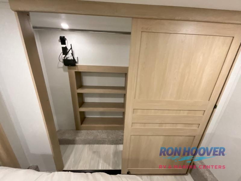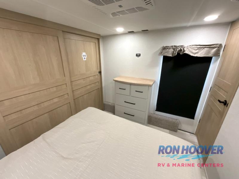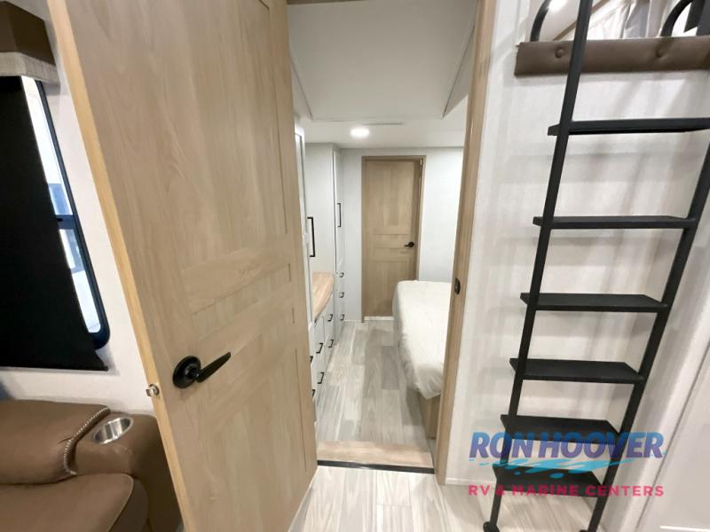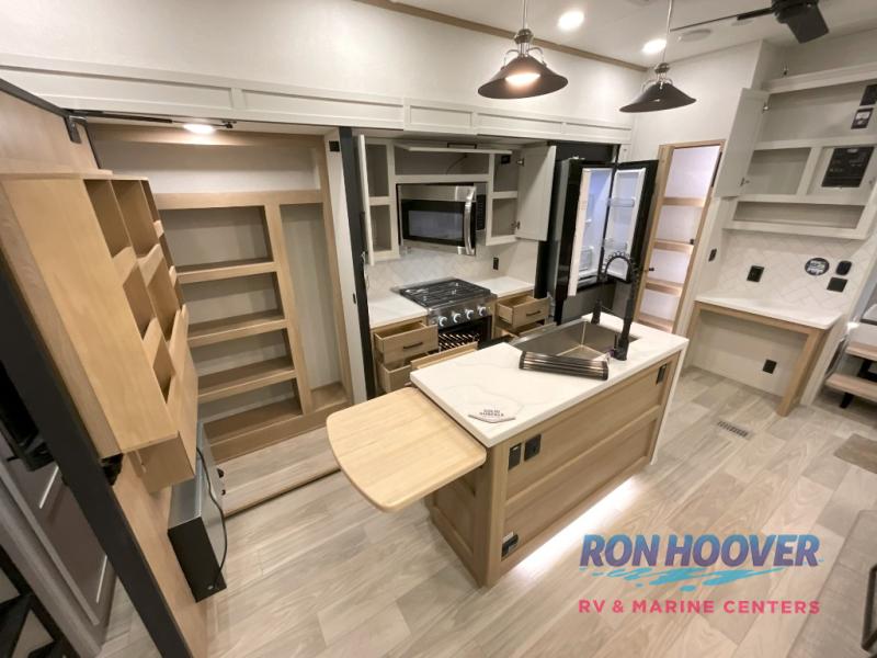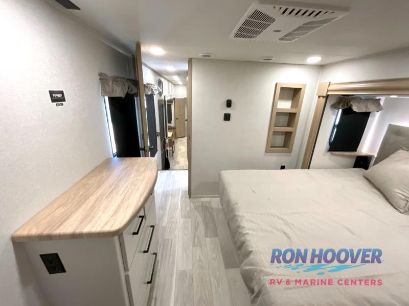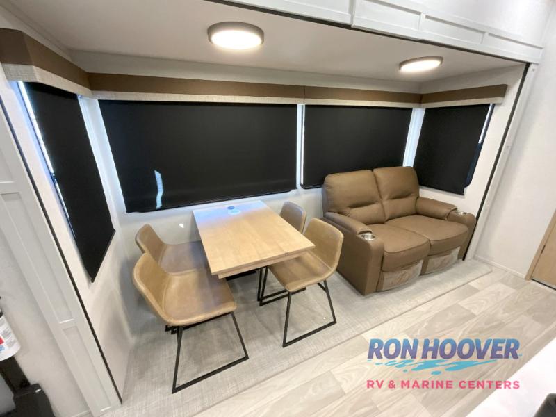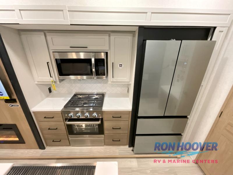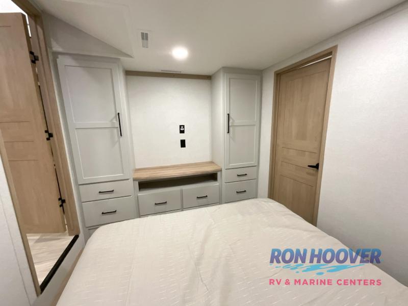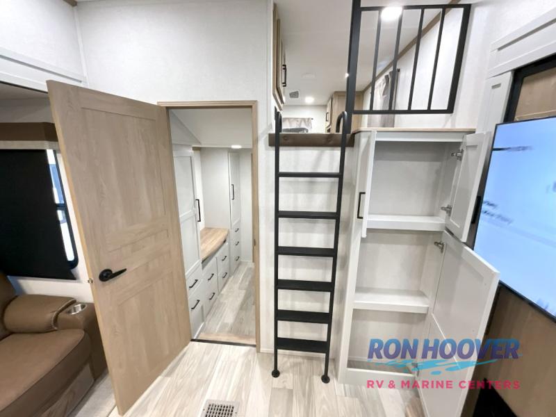 Enjoy a home on wheels with this fifth wheel! There are two bedrooms to choose from plus an upper loft with two 32" x 74" bunk mats, cabinets, and TV prep. The front private bedroom has a queen bed slide across from a dresser and next to a front wardrobe that is prepped to add an optional washer and dryer. The second bedroom has a queen bed slide across from a dresser with wardrobes on either side, plus it's very own full rear bathroom which has a tub and a rear entry/exit door to the unit. The second full bathroom has a one-piece fiberglass shower so everyone can get ready quickly in the morning. Prepare your best home cooked meals with the kitchen island and three burner cooktop then enjoy it at the free-standing dinette. Relax in true comfort each night in the theater seating across from the fireplace and 50" TV at the entertainment center!