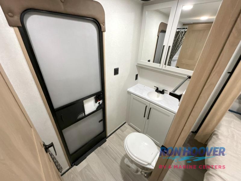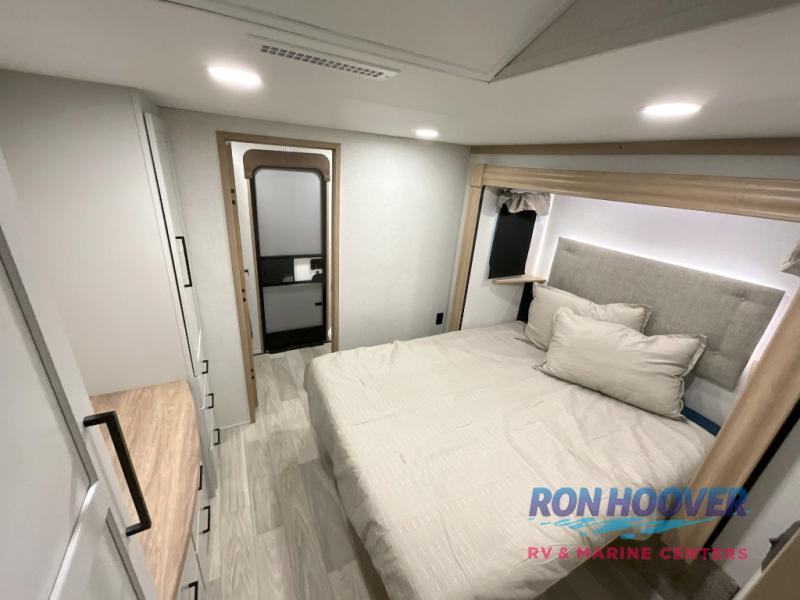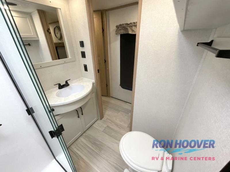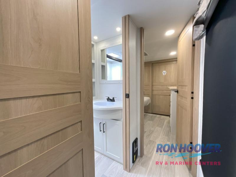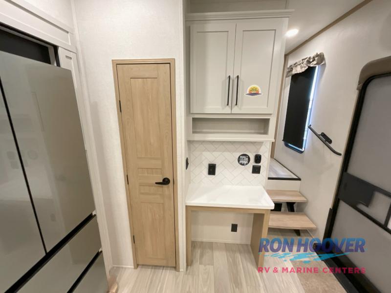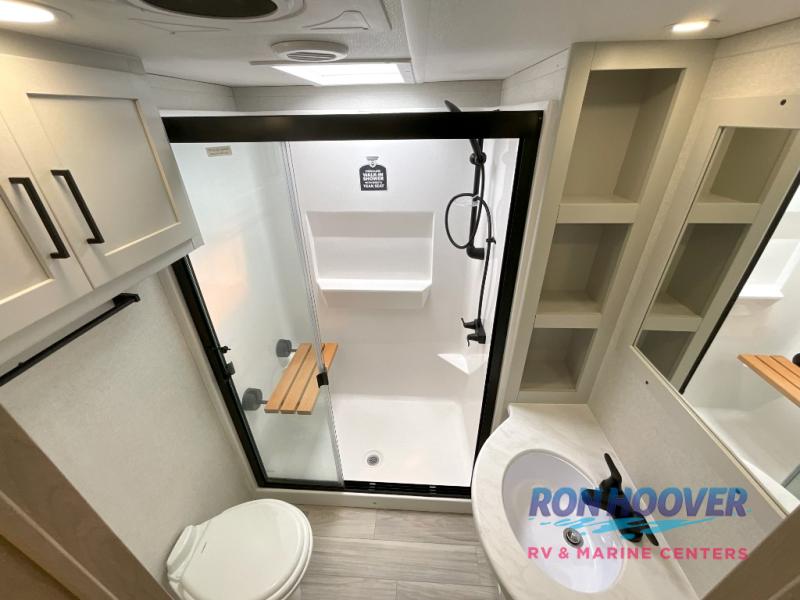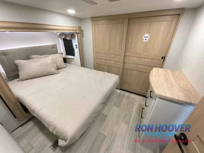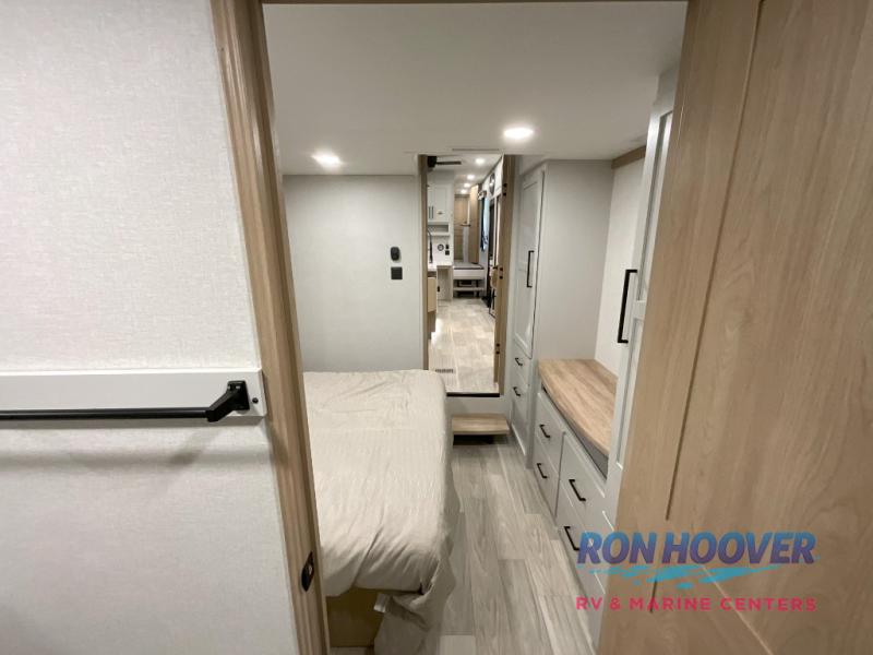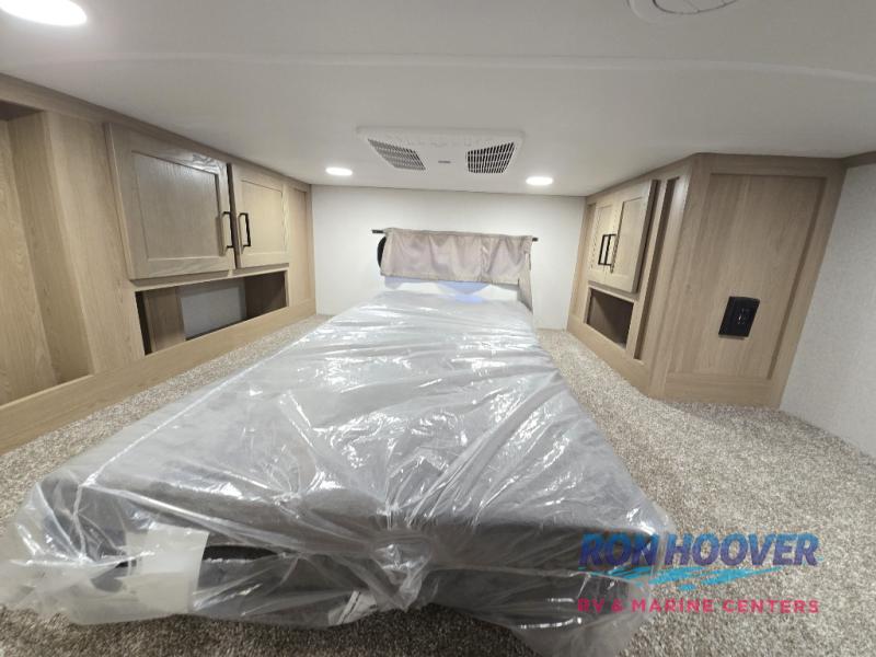 Enjoy a home on wheels with this fifth wheel! There are two bedrooms to choose from plus an upper loft with two 32" x 74" bunk mats, cabinets, and TV prep. The front private bedroom has a queen bed slide across from a dresser and next to a front wardrobe that is prepped to add an optional washer and dryer. The second bedroom has a queen bed slide across from a dresser with wardrobes on either side, plus it's very own full rear bathroom which has a tub and a rear entry/exit door to the unit. The second full bathroom has a one-piece fiberglass shower so everyone can get ready quickly in the morning. Prepare your best home cooked meals with the kitchen island and three burner cooktop then enjoy it at the free-standing dinette. Relax in true comfort each night in the theater seating across from the fireplace and 50" TV at the entertainment center!