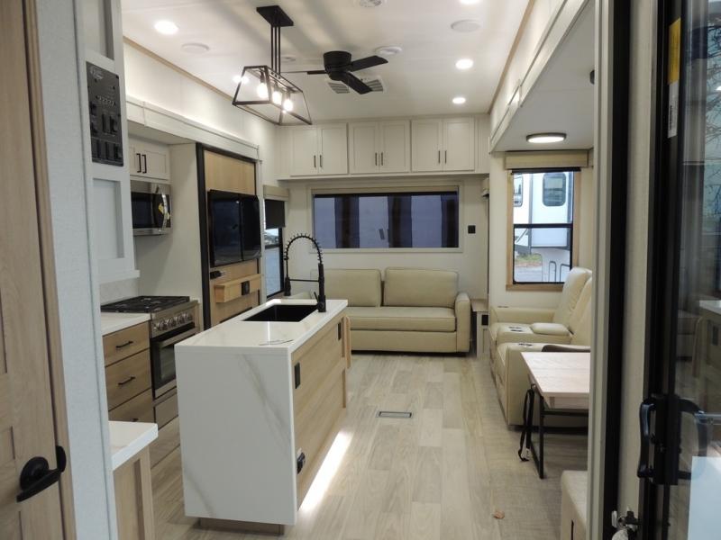 With each Sierra Destination Trailer by Forest River you will enjoy many luxurious features, such as crown molding over the kitchen cabinets, solid surface kitchen countertops, a memory foam mattress, plus so much more. The extra large picture windows throughout let natural light in and provide beautiful outdoor views, and each model includes three or more slides for added interior space. You'll find many exterior conveniences, like the porch light with an interior switch, the rain gutters with extra long drip spouts to prevent black streaking, and an electric awning with LED light strip, plus more! You will stay comfortable year around with dual 15,000 A/C units plus each model is constructed with an Underbelly Armor for better protection and insulation!