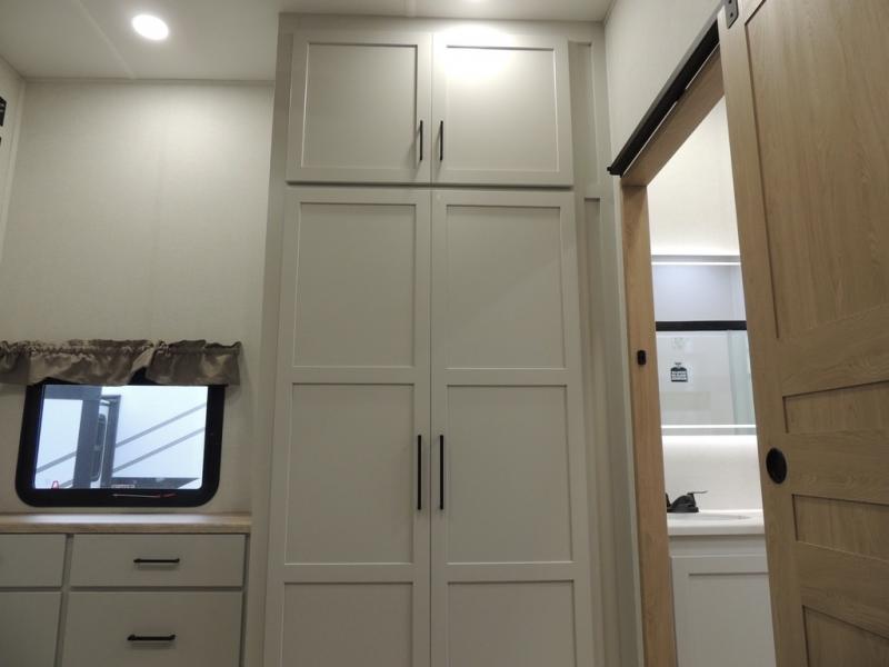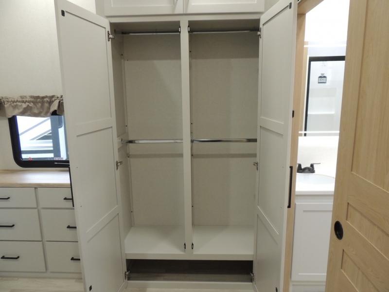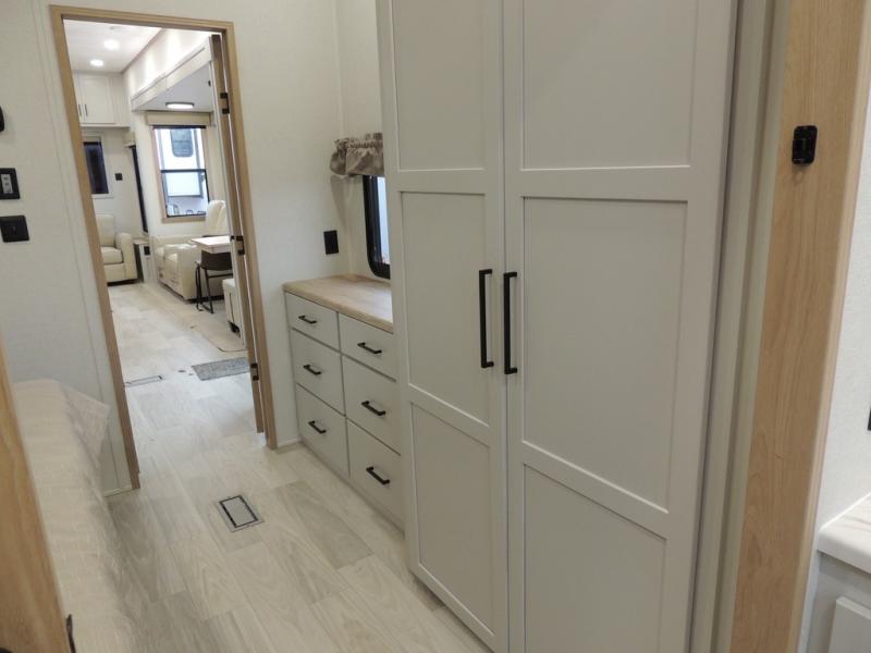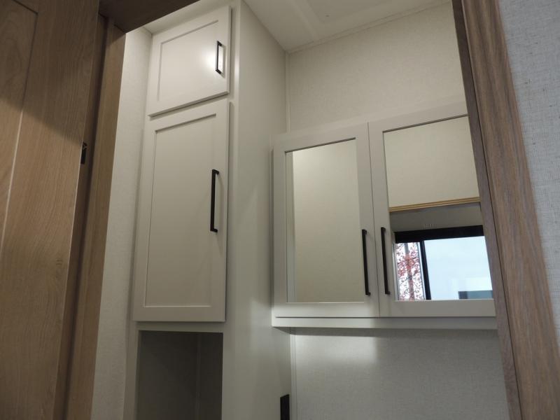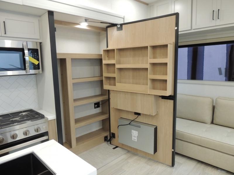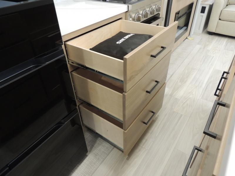 Enjoy extended stays in this triple slide out destination trailer! Once you unload your bags, you can put out the 19' awning with LED lights and relax in your camp chairs. The Chef Collection three burner range will let you make lunch for your crew when you head inside, and there is a free-standing dinette with a bench and two chairs to dine at. After your meal, you can relax on the theater seating across from the entertainment center with a hidden pantry behind it. There is also a front tri-fold hide-a-bed sofa to let guests sleep over. The mid-coach half bath will be easily accessible to use, and the full rear bath will create a master bedroom you are sure to love. There is a king bed slide out here, a dresser with TV prep, and two wardrobes to keep your things tidy!