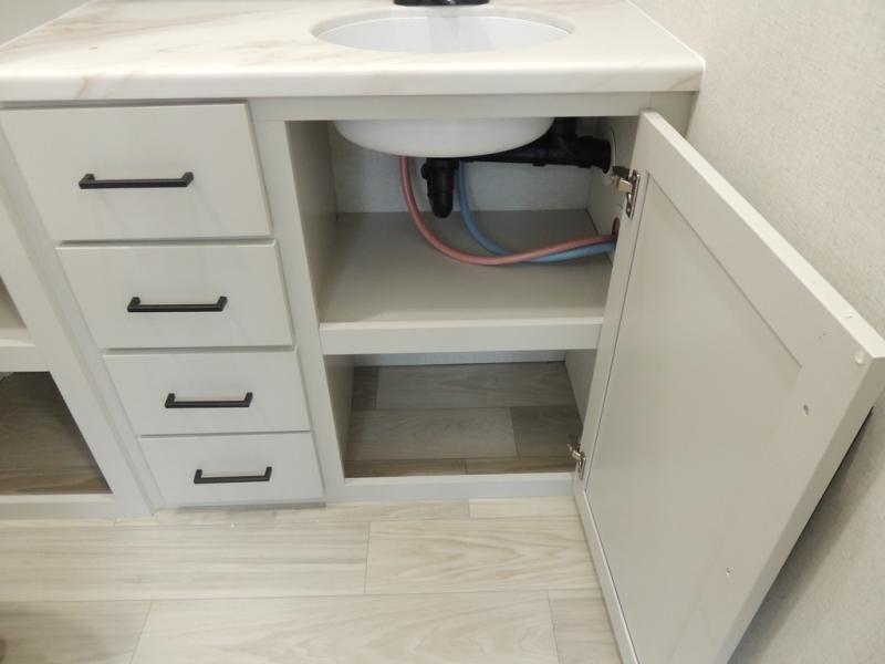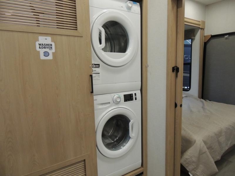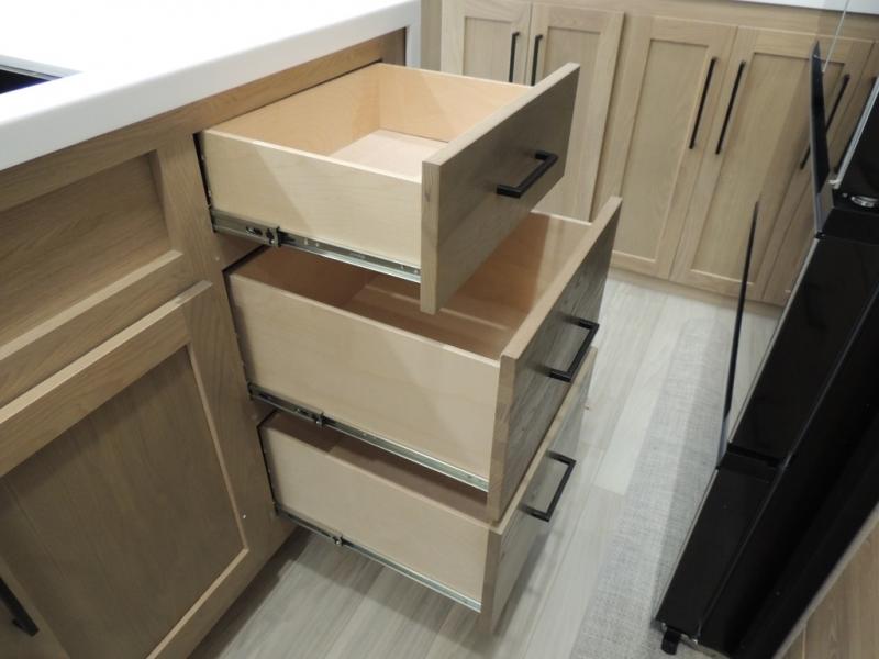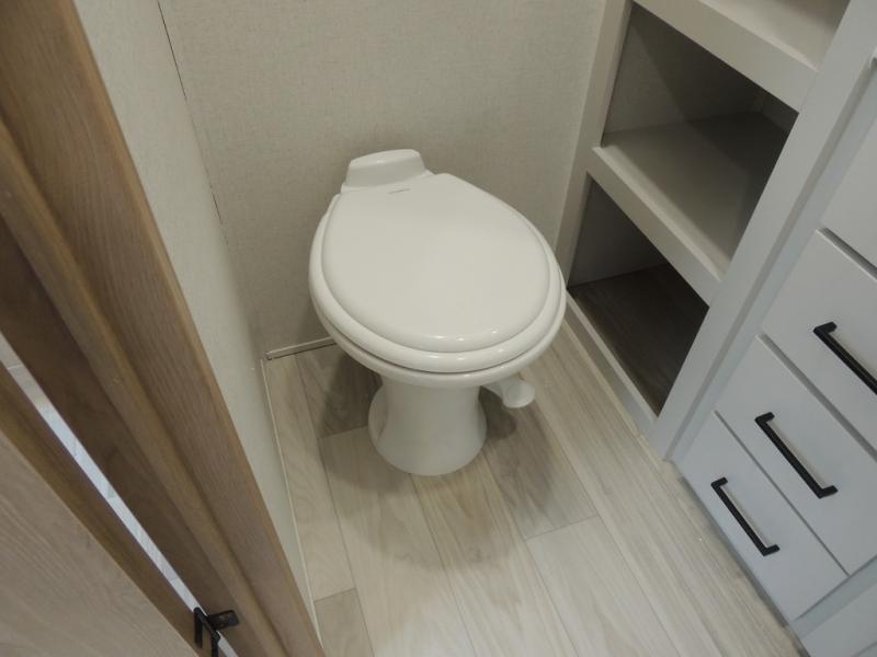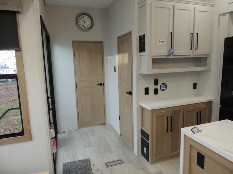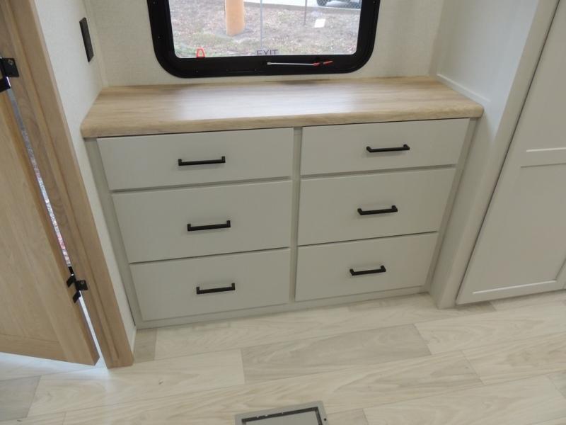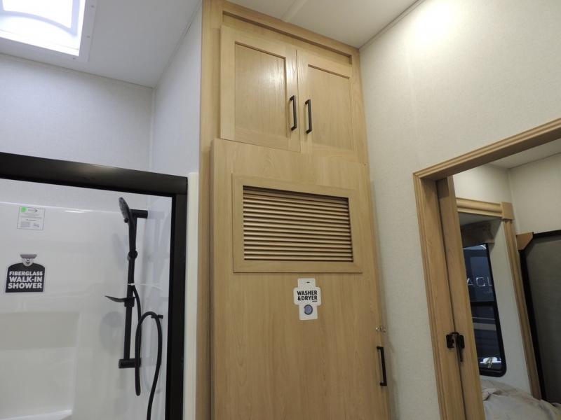 Enjoy extended stays in this triple slide out destination trailer! Once you unload your bags, you can put out the 19' awning with LED lights and relax in your camp chairs. The Chef Collection three burner range will let you make lunch for your crew when you head inside, and there is a free-standing dinette with a bench and two chairs to dine at. After your meal, you can relax on the theater seating across from the entertainment center with a hidden pantry behind it. There is also a front tri-fold hide-a-bed sofa to let guests sleep over. The mid-coach half bath will be easily accessible to use, and the full rear bath will create a master bedroom you are sure to love. There is a king bed slide out here, a dresser with TV prep, and two wardrobes to keep your things tidy!