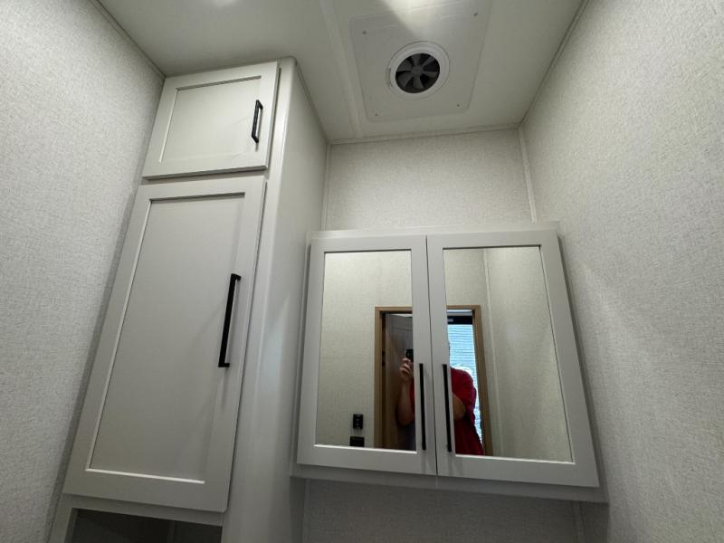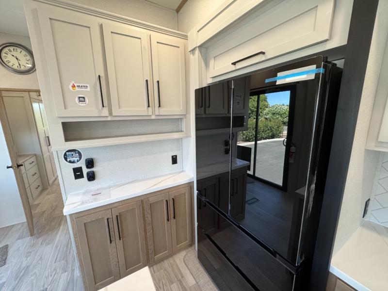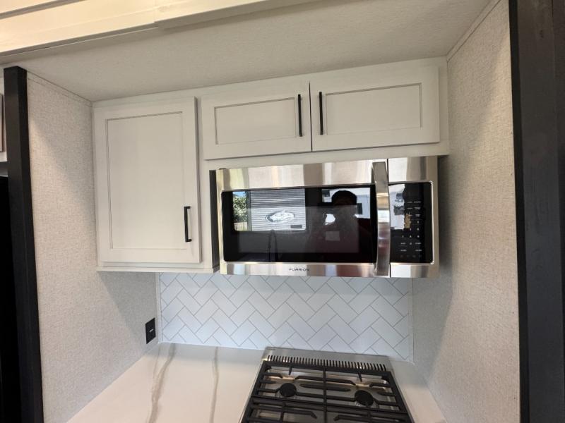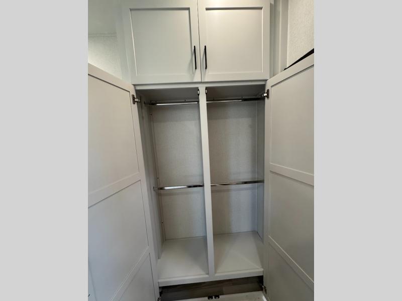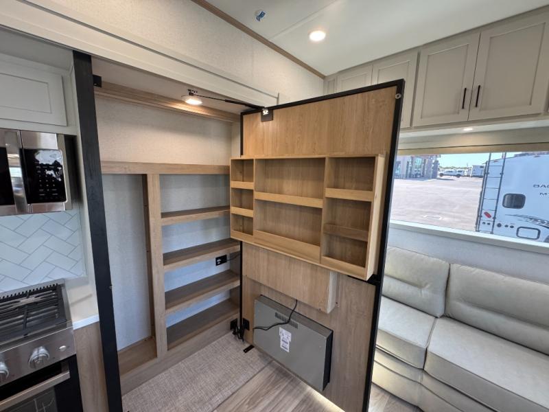 Enjoy extended stays in this triple slide out destination trailer! Once you unload your bags, you can put out the 19' awning with LED lights and relax in your camp chairs. The Chef Collection three burner range will let you make lunch for your crew when you head inside, and there is a free-standing dinette with a bench and two chairs to dine at. After your meal, you can relax on the theater seating across from the entertainment center with a hidden pantry behind it. There is also a front tri-fold hide-a-bed sofa to let guests sleep over. The mid-coach half bath will be easily accessible to use, and the full rear bath will create a master bedroom you are sure to love. There is a king bed slide out here, a dresser with TV prep, and two wardrobes to keep your things tidy!