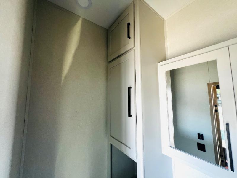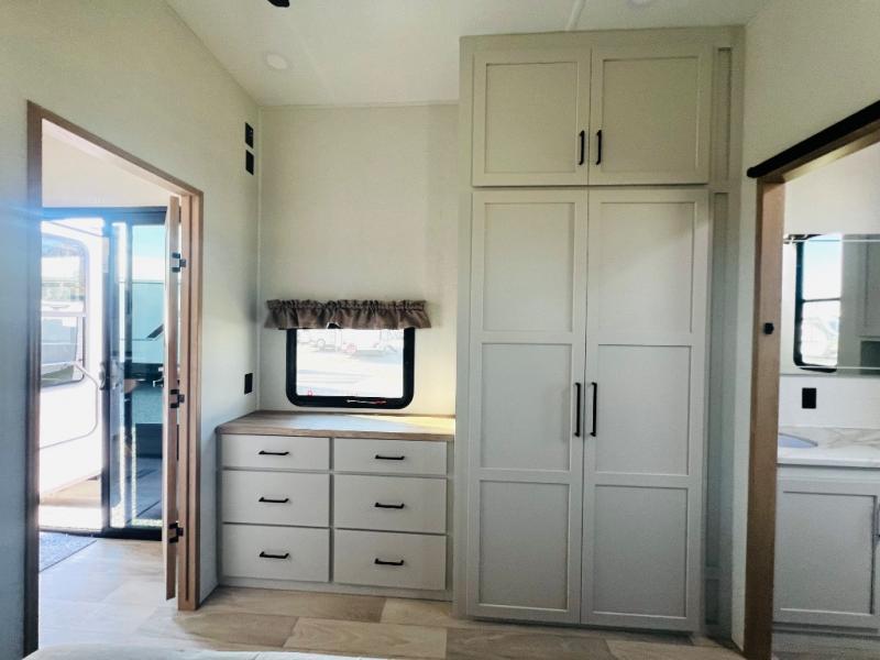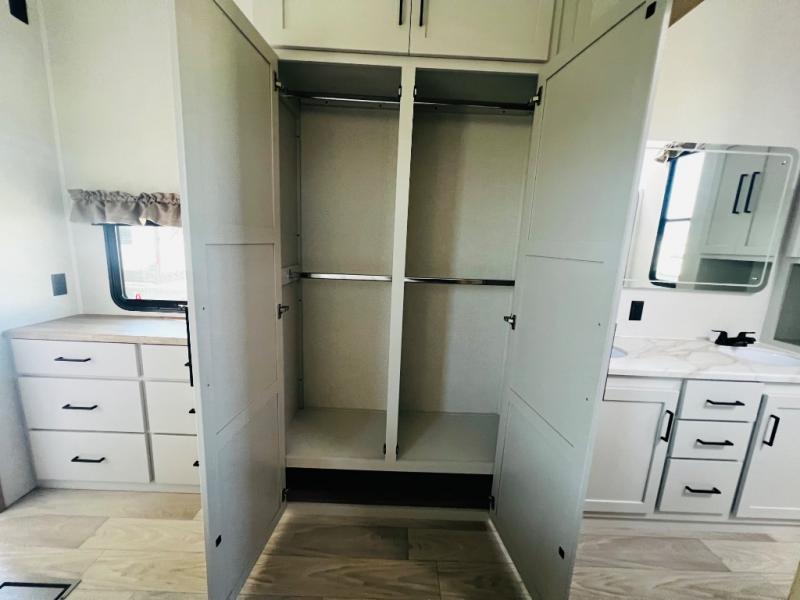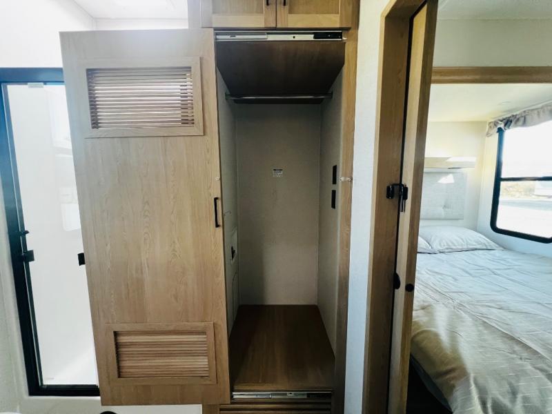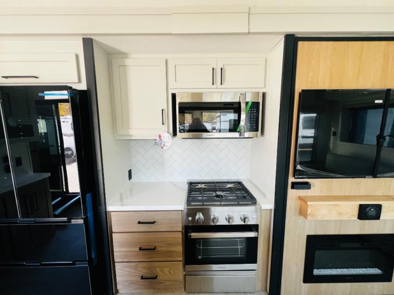 Enjoy extended stays in this triple slide out destination trailer! Once you unload your bags, you can put out the 19' awning with LED lights and relax in your camp chairs. The Chef Collection three burner range will let you make lunch for your crew when you head inside, and there is a free-standing dinette with a bench and two chairs to dine at. After your meal, you can relax on the theater seating across from the entertainment center with a hidden pantry behind it. There is also a front tri-fold hide-a-bed sofa to let guests sleep over. The mid-coach half bath will be easily accessible to use, and the full rear bath will create a master bedroom you are sure to love. There is a king bed slide out here, a dresser with TV prep, and two wardrobes to keep your things tidy!
