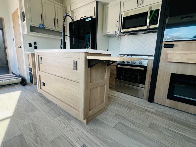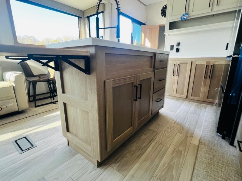 Luxury condo layout with island kitchen, loft sleeping, triple slides, and panoramic windows, all wrapped in durable fiberglass with underbelly armor!