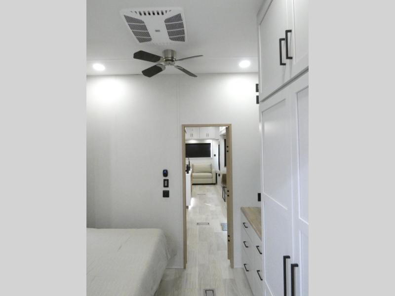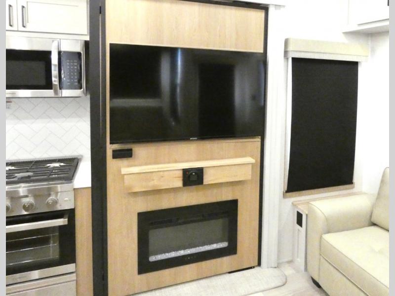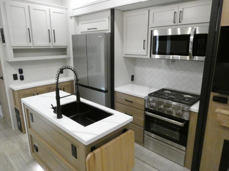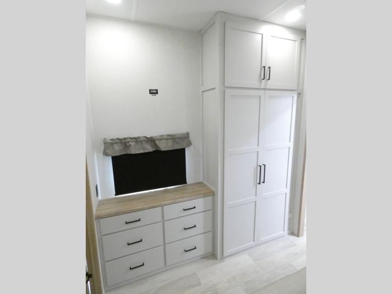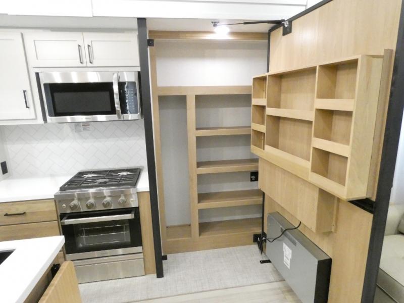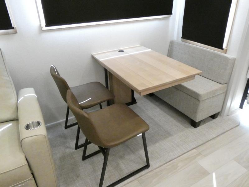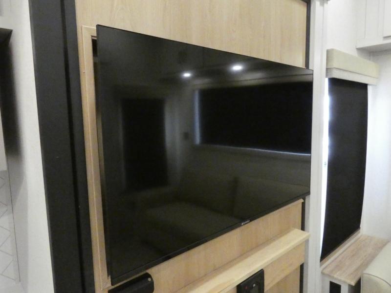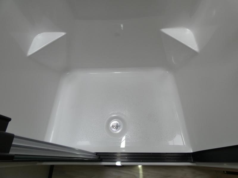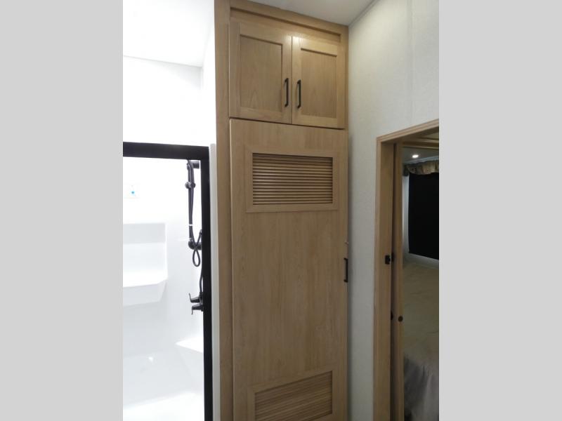 Enjoy extended stays in this triple slide out destination trailer! Once you unload your bags, you can put out the 19' awning with LED lights and relax in your camp chairs. The Chef Collection three burner range will let you make lunch for your crew when you head inside, and there is a free-standing dinette with a bench and two chairs to dine at. After your meal, you can relax on the theater seating across from the entertainment center with a hidden pantry behind it. There is also a front tri-fold hide-a-bed sofa to let guests sleep over. The mid-coach half bath will be easily accessible to use, and the full rear bath will create a master bedroom you are sure to love. There is a king bed slide out here, a dresser with TV prep, and two wardrobes to keep your things tidy!