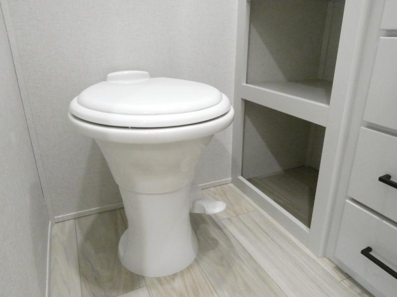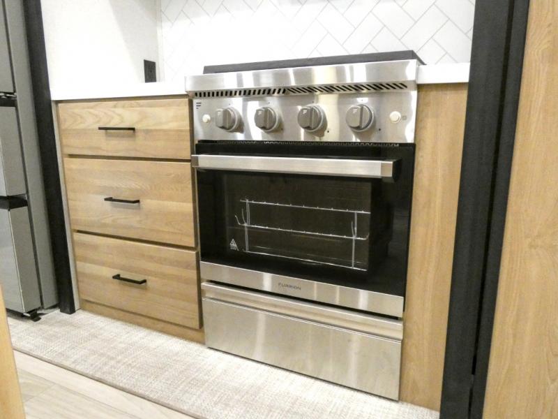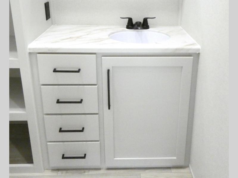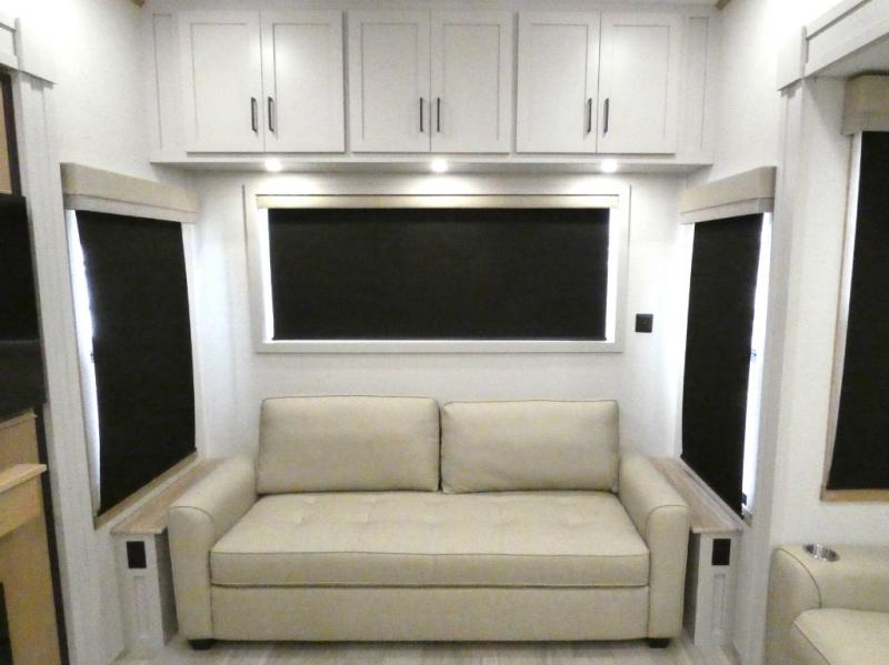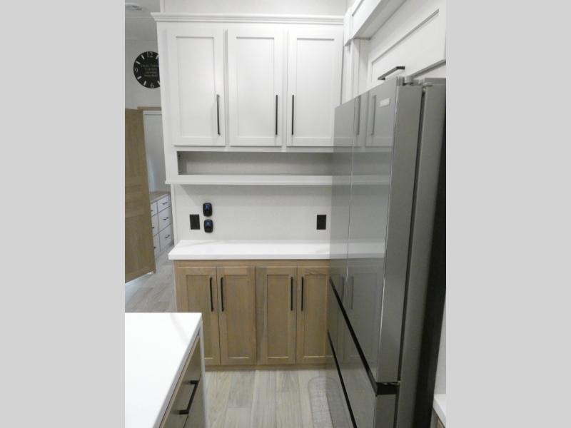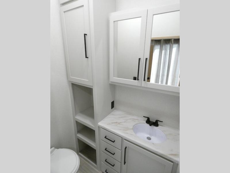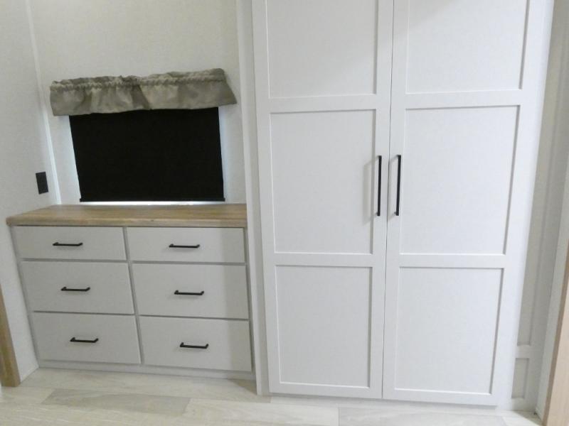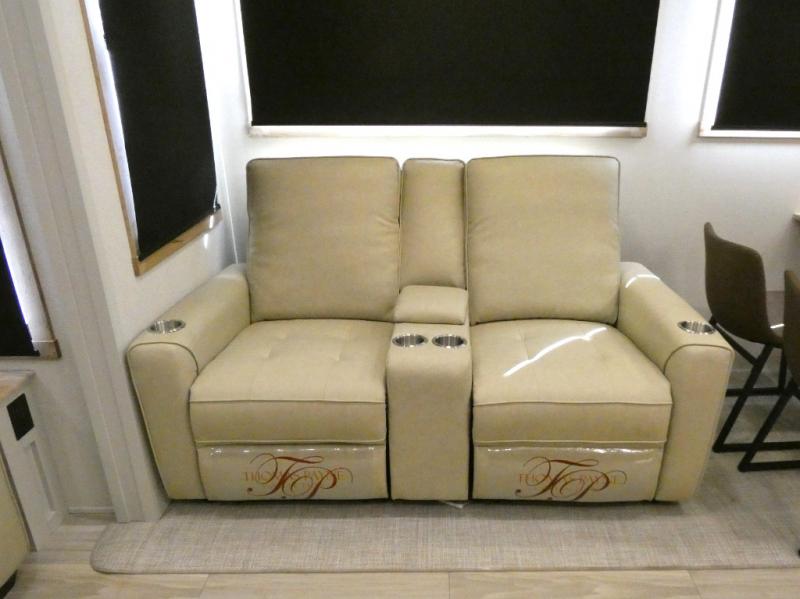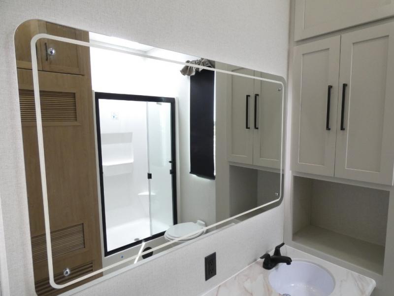 Enjoy extended stays in this triple slide out destination trailer! Once you unload your bags, you can put out the 19' awning with LED lights and relax in your camp chairs. The Chef Collection three burner range will let you make lunch for your crew when you head inside, and there is a free-standing dinette with a bench and two chairs to dine at. After your meal, you can relax on the theater seating across from the entertainment center with a hidden pantry behind it. There is also a front tri-fold hide-a-bed sofa to let guests sleep over. The mid-coach half bath will be easily accessible to use, and the full rear bath will create a master bedroom you are sure to love. There is a king bed slide out here, a dresser with TV prep, and two wardrobes to keep your things tidy!