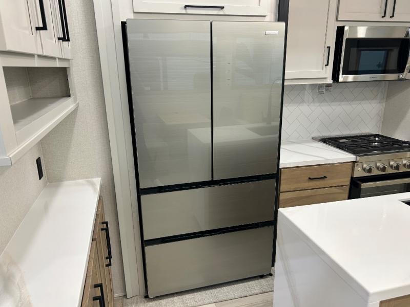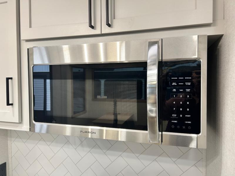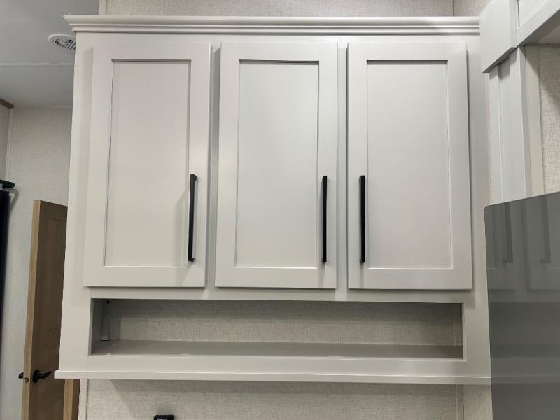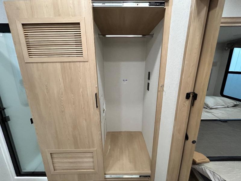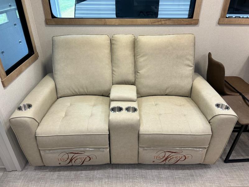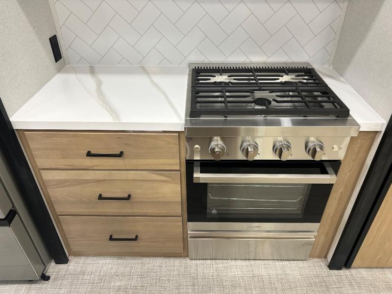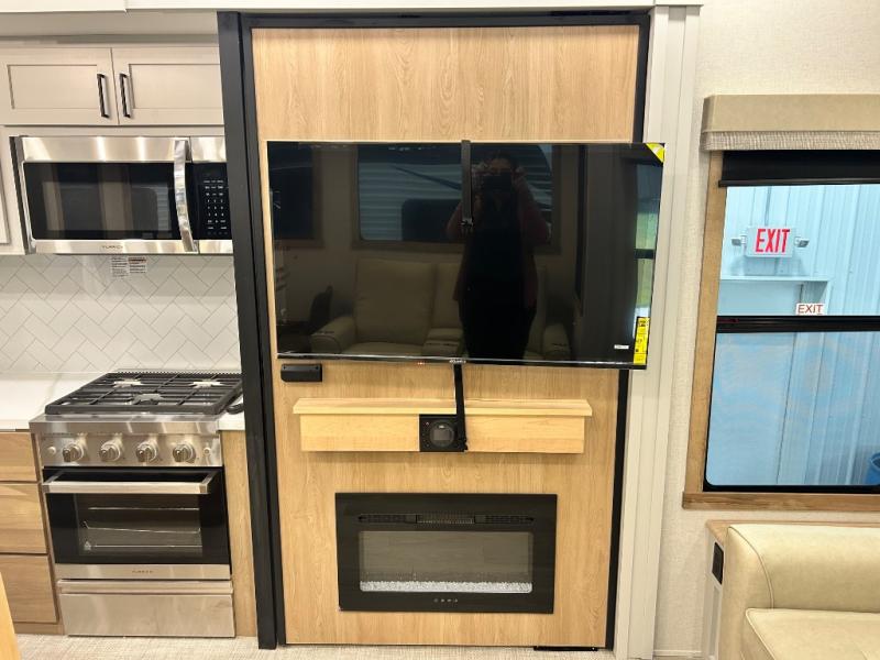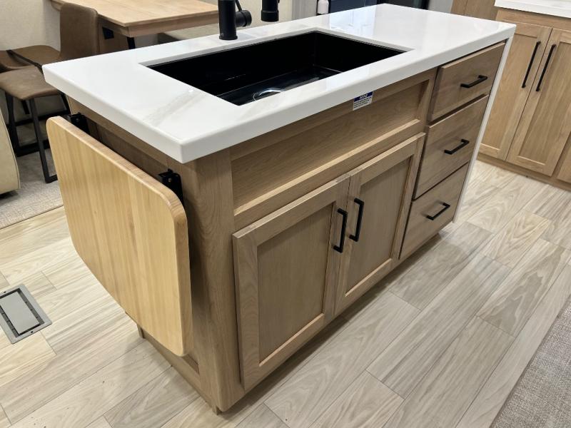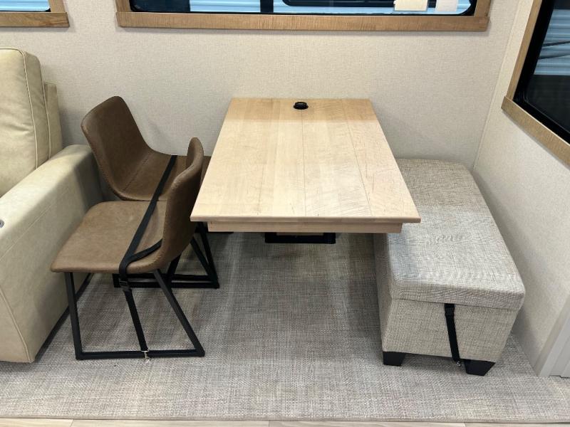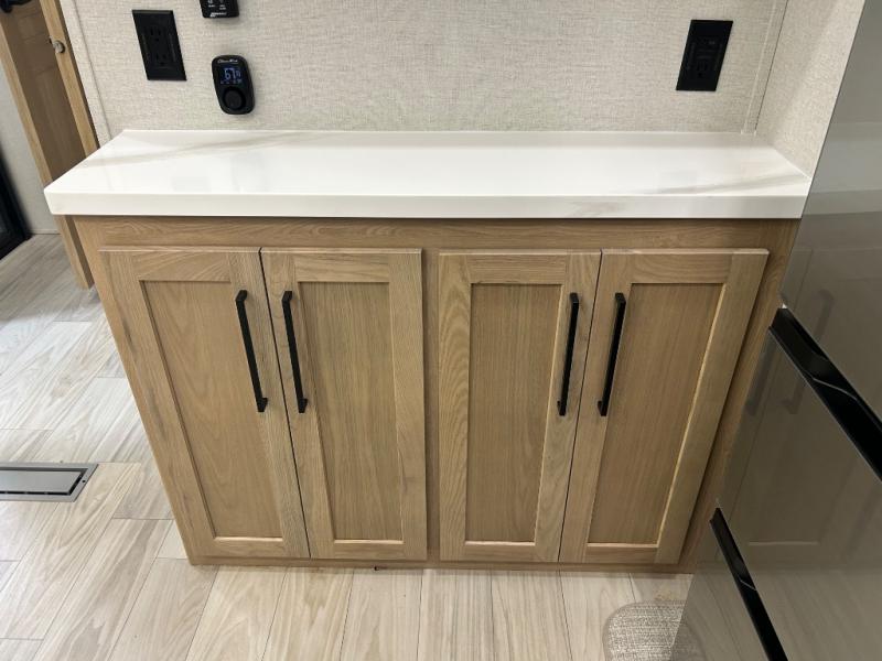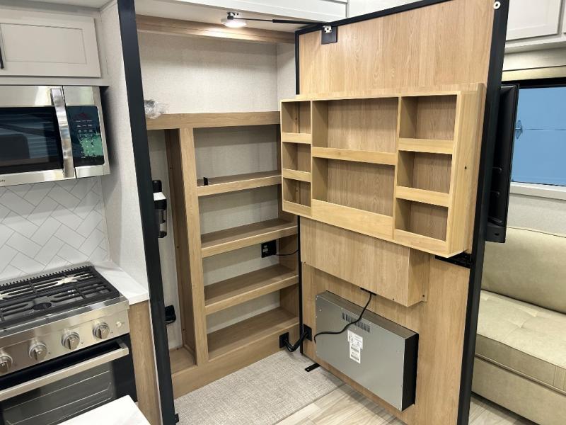 Enjoy extended stays in this triple slide out destination trailer! Once you unload your bags, you can put out the 19' awning with LED lights and relax in your camp chairs. The Chef Collection three burner range will let you make lunch for your crew when you head inside, and there is a free-standing dinette with a bench and two chairs to dine at. After your meal, you can relax on the theater seating across from the entertainment center with a hidden pantry behind it. There is also a front tri-fold hide-a-bed sofa to let guests sleep over. The mid-coach half bath will be easily accessible to use, and the full rear bath will create a master bedroom you are sure to love. There is a king bed slide out here, a dresser with TV prep, and two wardrobes to keep your things tidy!