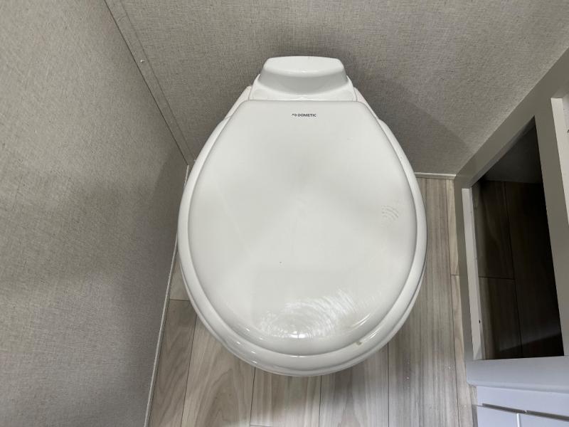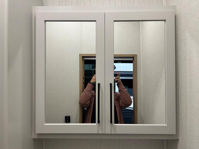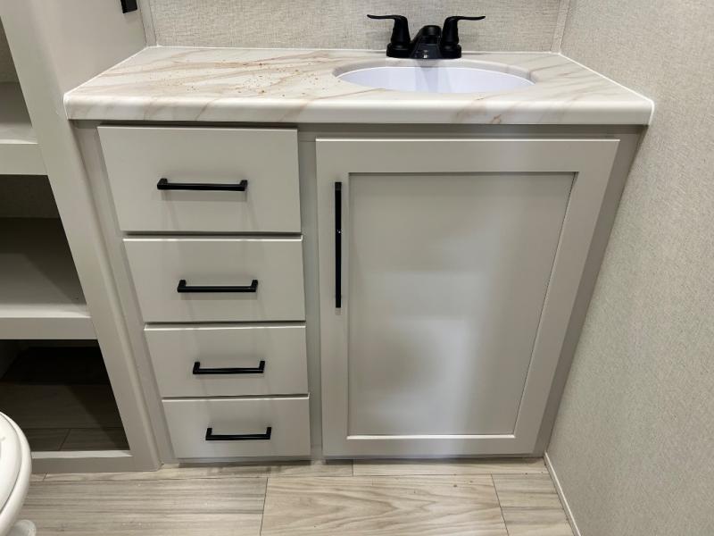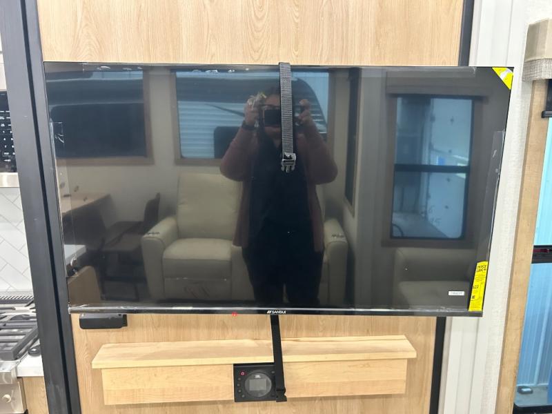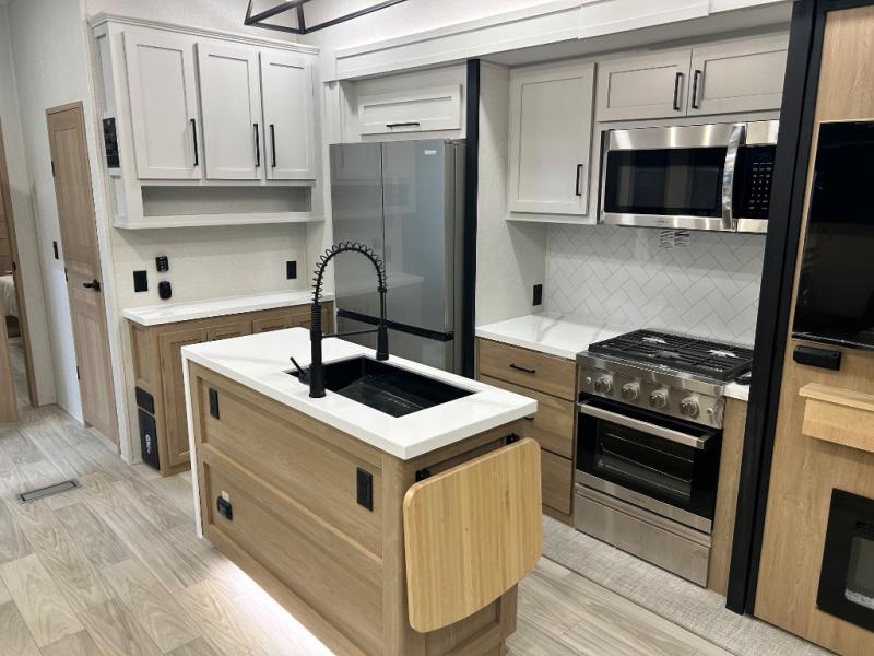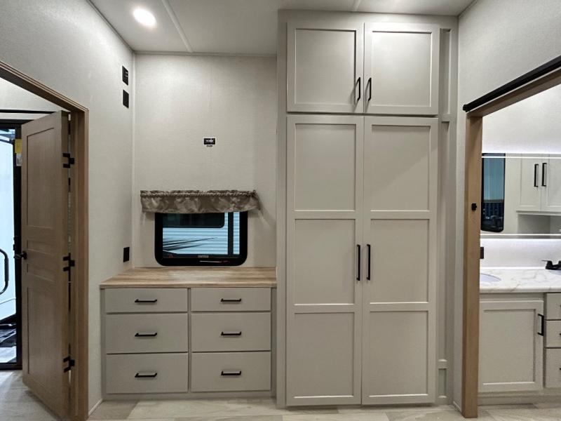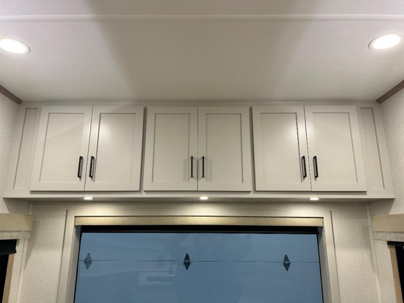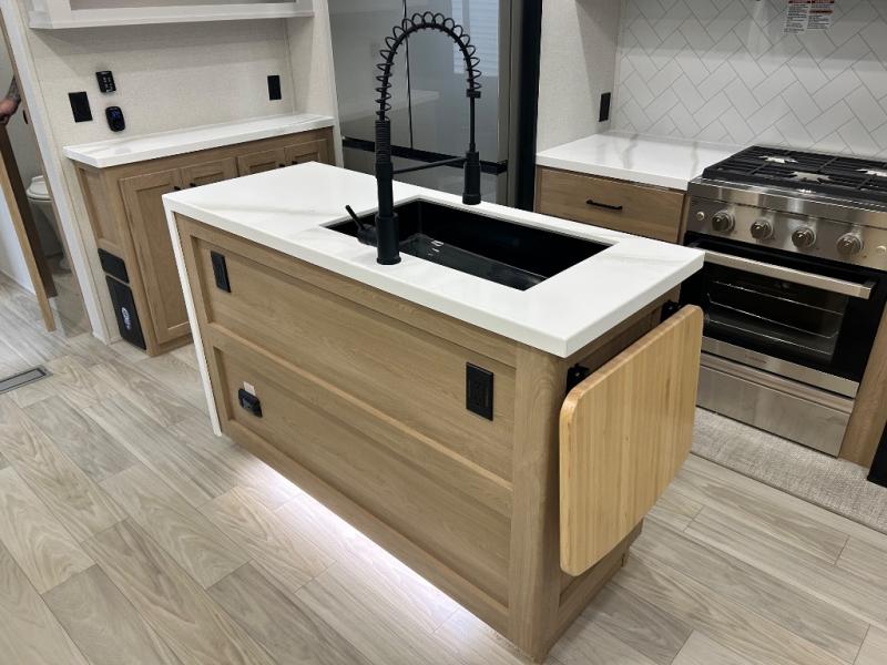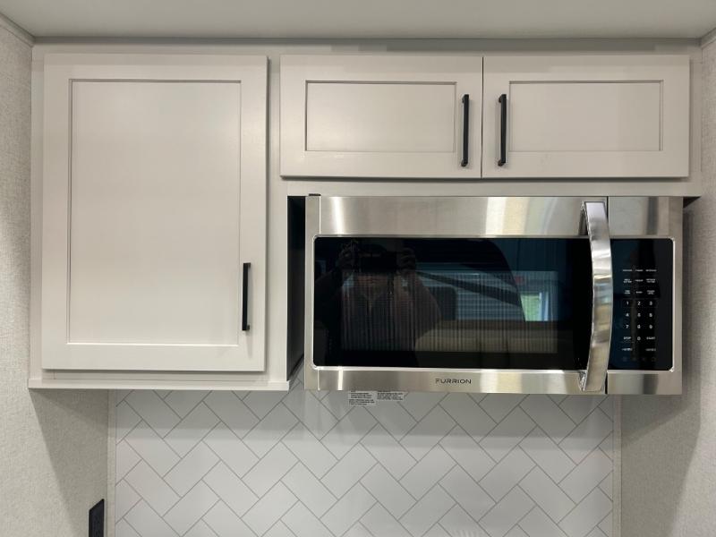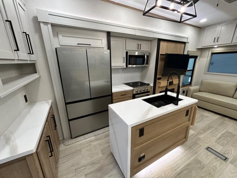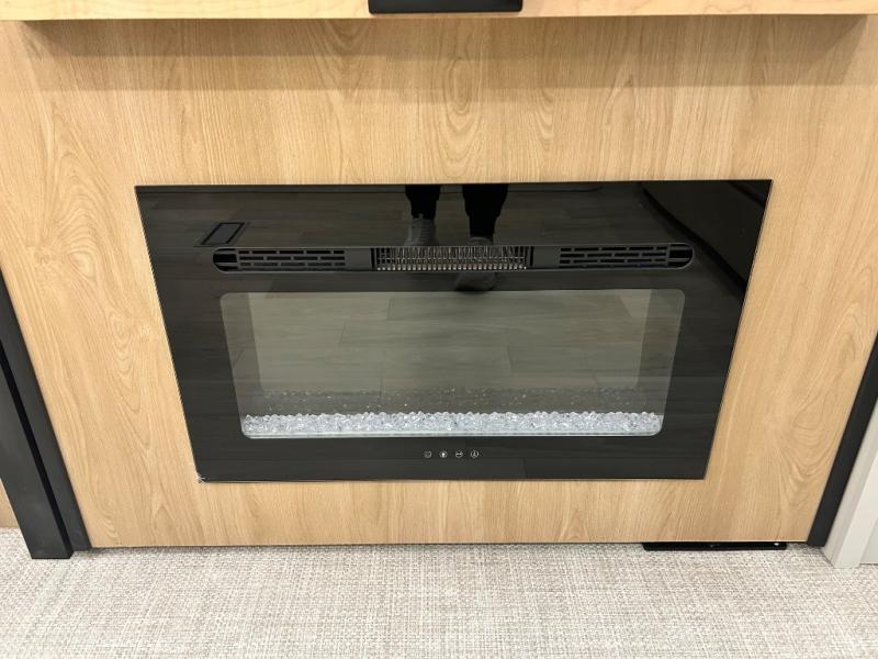Enjoy extended stays in this triple slide out destination trailer! Once you unload your bags, you can put out the 19' awning with LED lights and relax in your camp chairs. The Chef Collection three burner range will let you make lunch for your crew when you head inside, and there is a free-standing dinette with a bench and two chairs to dine at. After your meal, you can relax on the theater seating across from the entertainment center with a hidden pantry behind it. There is also a front tri-fold hide-a-bed sofa to let guests sleep over. The mid-coach half bath will be easily accessible to use, and the full rear bath will create a master bedroom you are sure to love. There is a king bed slide out here, a dresser with TV prep, and two wardrobes to keep your things tidy!