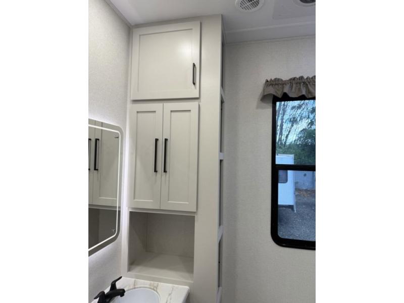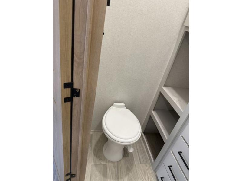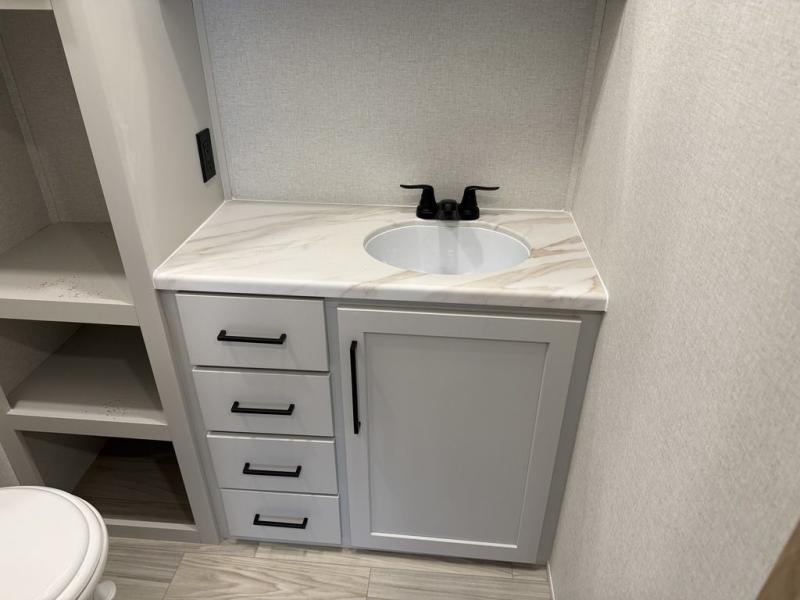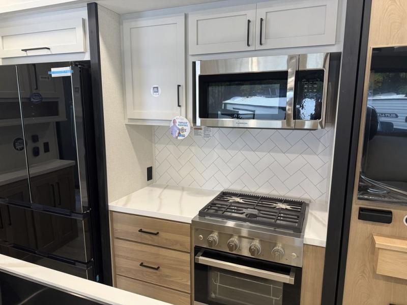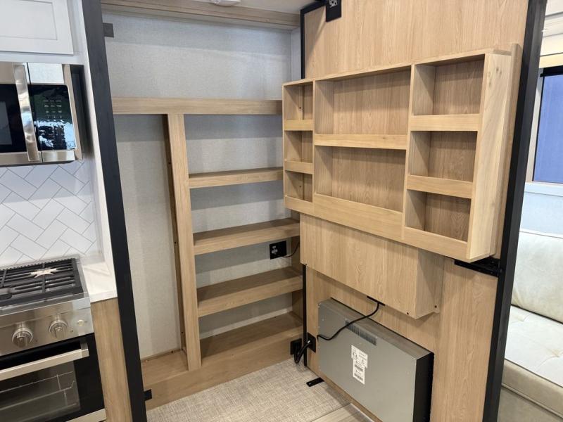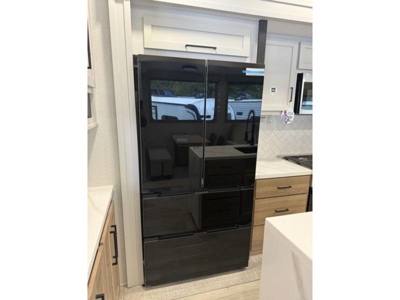 Enjoy extended stays in this triple slide out destination trailer! Once you unload your bags, you can put out the 19' awning with LED lights and relax in your camp chairs. The Chef Collection three burner range will let you make lunch for your crew when you head inside, and there is a free-standing dinette with a bench and two chairs to dine at. After your meal, you can relax on the theater seating across from the entertainment center with a hidden pantry behind it. There is also a front tri-fold hide-a-bed sofa to let guests sleep over. The mid-coach half bath will be easily accessible to use, and the full rear bath will create a master bedroom you are sure to love. There is a king bed slide out here, a dresser with TV prep, and two wardrobes to keep your things tidy!