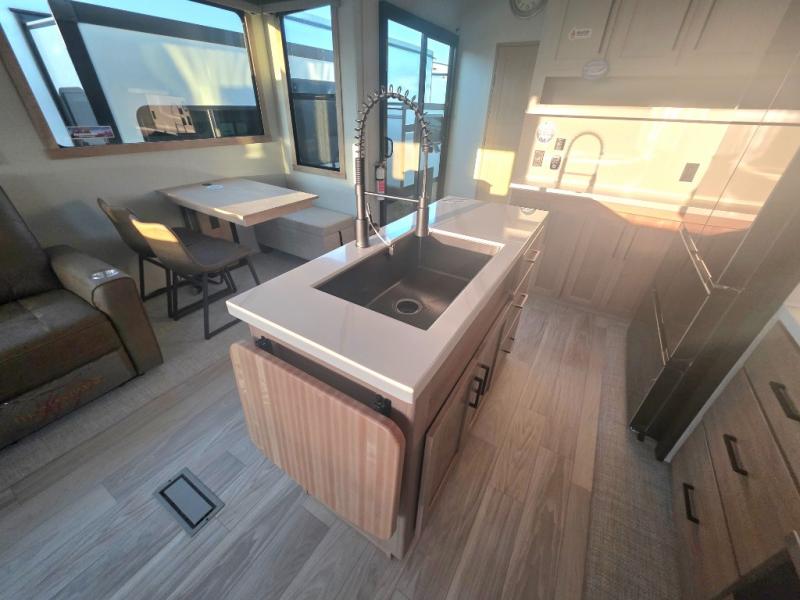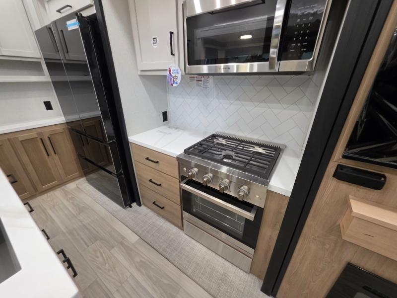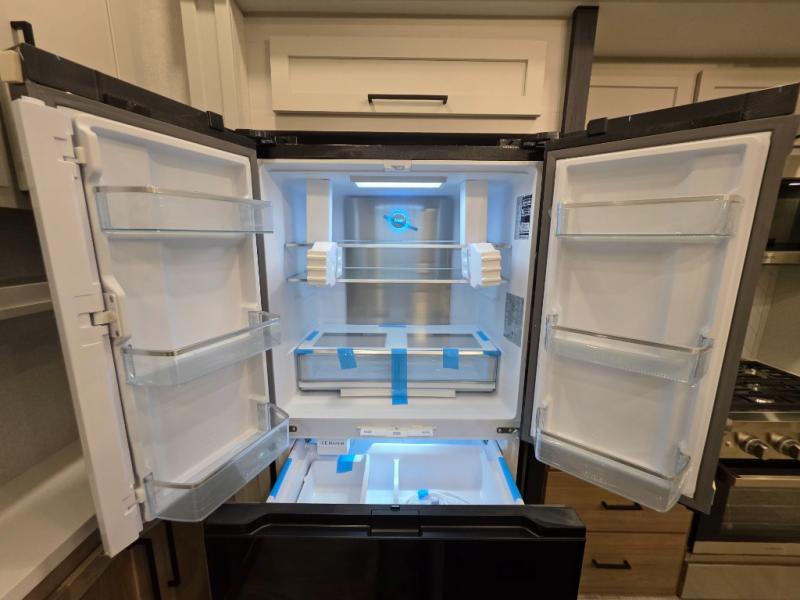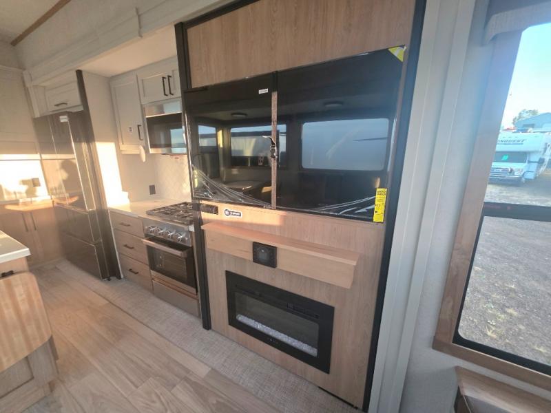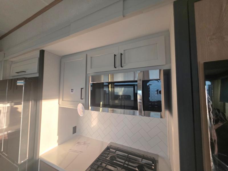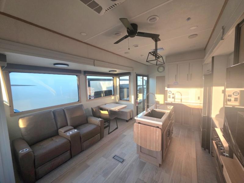 Enjoy extended stays in this triple slide out destination trailer! Once you unload your bags, you can put out the 19' awning with LED lights and relax in your camp chairs. The Chef Collection three burner range will let you make lunch for your crew when you head inside, and there is a free-standing dinette with a bench and two chairs to dine at. After your meal, you can relax on the theater seating across from the entertainment center with a hidden pantry behind it. There is also a front tri-fold hide-a-bed sofa to let guests sleep over. The mid-coach half bath will be easily accessible to use, and the full rear bath will create a master bedroom you are sure to love. There is a king bed slide out here, a dresser with TV prep, and two wardrobes to keep your things tidy!