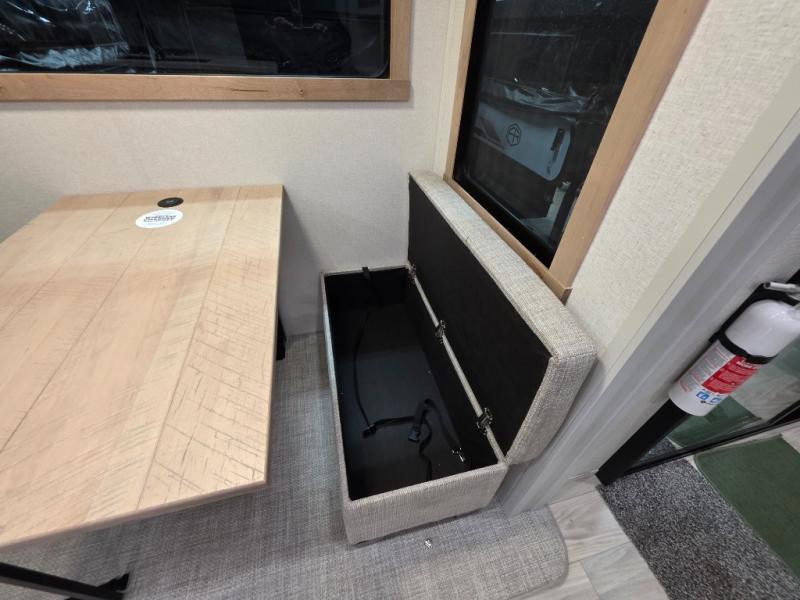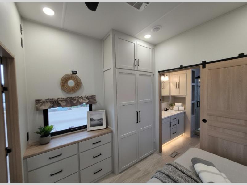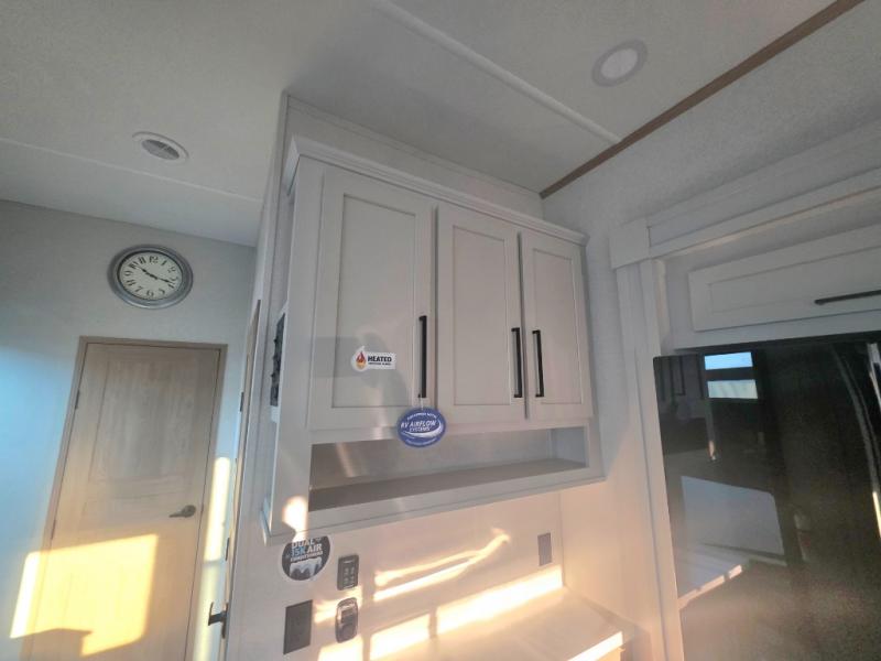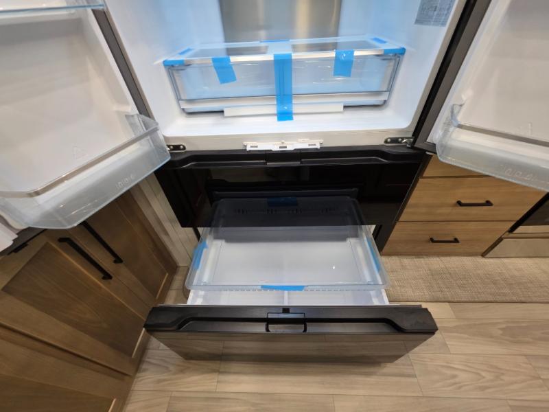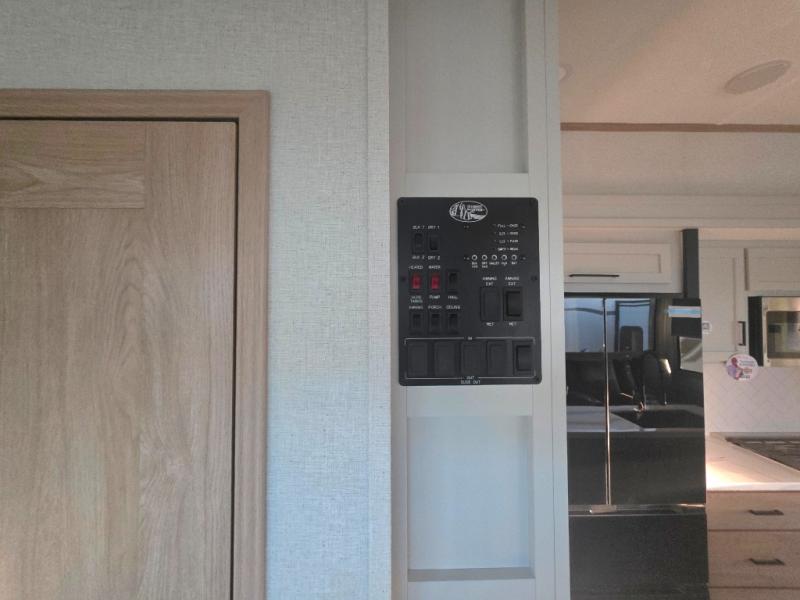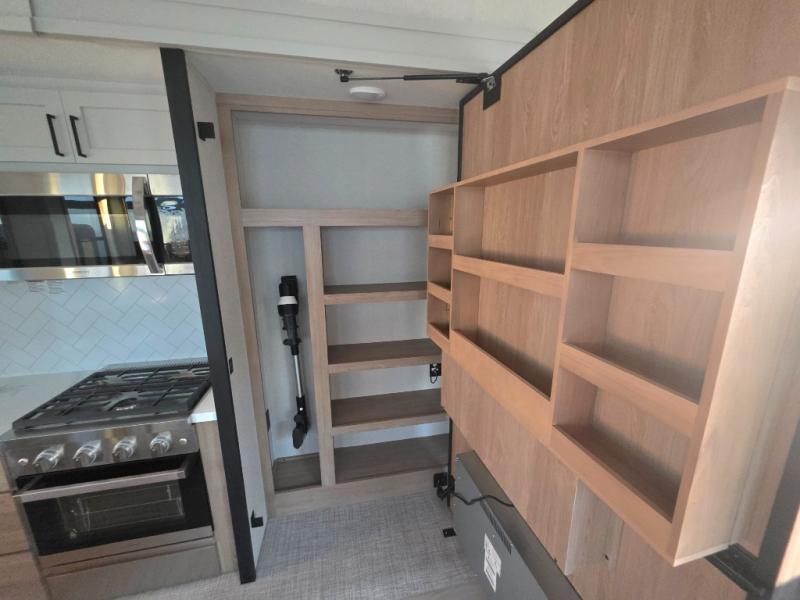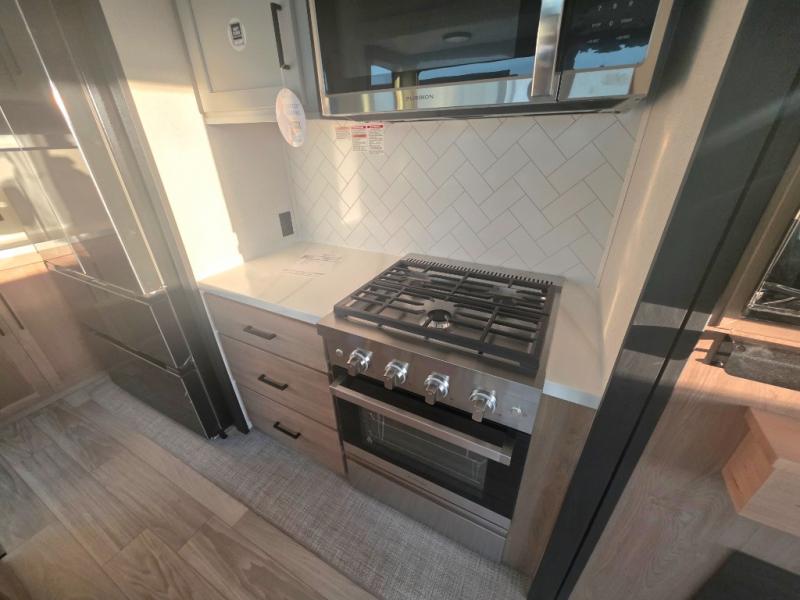 Enjoy extended stays in this triple slide out destination trailer! Once you unload your bags, you can put out the 19' awning with LED lights and relax in your camp chairs. The Chef Collection three burner range will let you make lunch for your crew when you head inside, and there is a free-standing dinette with a bench and two chairs to dine at. After your meal, you can relax on the theater seating across from the entertainment center with a hidden pantry behind it. There is also a front tri-fold hide-a-bed sofa to let guests sleep over. The mid-coach half bath will be easily accessible to use, and the full rear bath will create a master bedroom you are sure to love. There is a king bed slide out here, a dresser with TV prep, and two wardrobes to keep your things tidy!