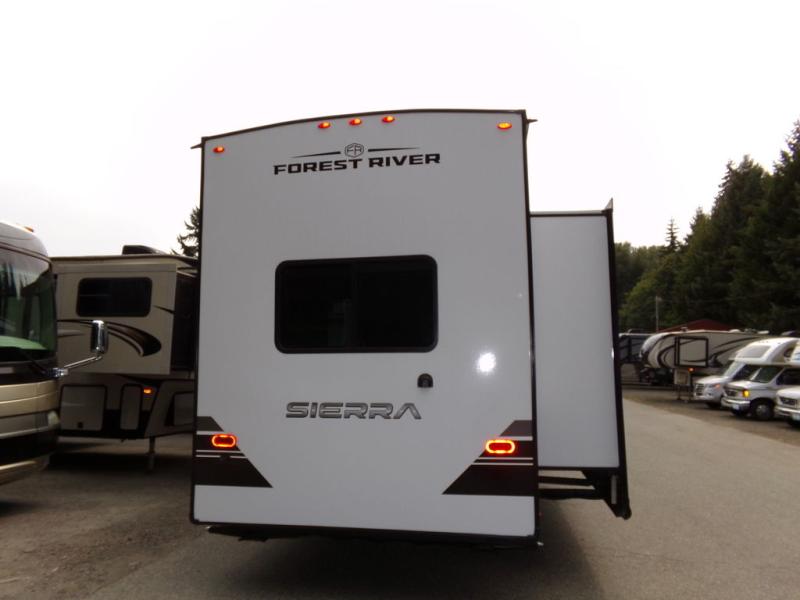 With each Sierra Destination Trailer by Forest River you will enjoy many luxurious features, such as crown molding over the kitchen cabinets, solid surface kitchen countertops, a memory foam mattress, plus so much more. The extra large picture windows throughout let natural light in and provide beautiful outdoor views, and each model includes three or more slides for added interior space. You'll find many exterior conveniences, like the porch light with an interior switch, the rain gutters with extra long drip spouts to prevent black streaking, and an electric awning with LED light strip, plus more! You will stay comfortable year around with dual 15,000 A/C units plus each model is constructed with an Underbelly Armor for better protection and insulation!