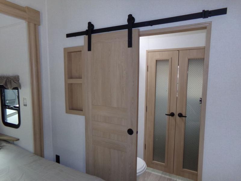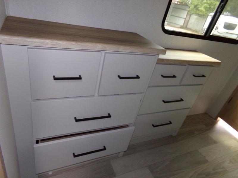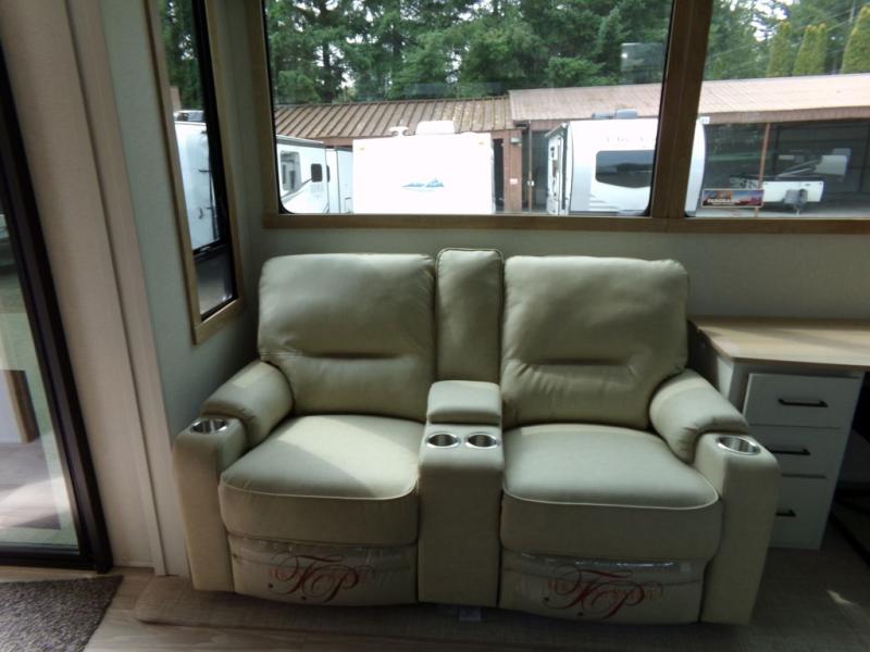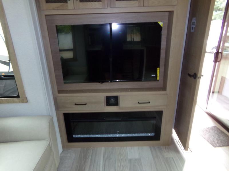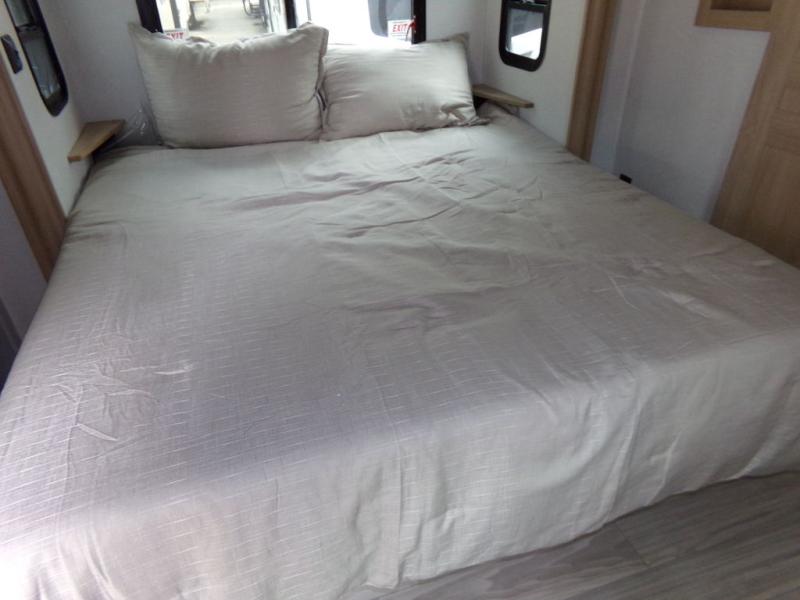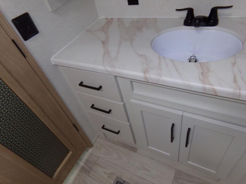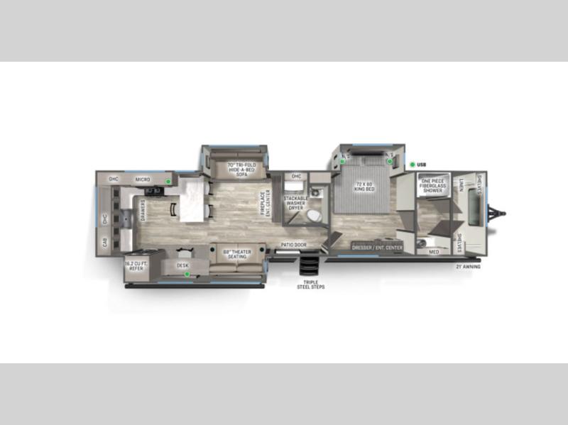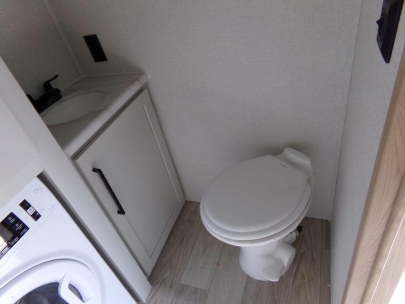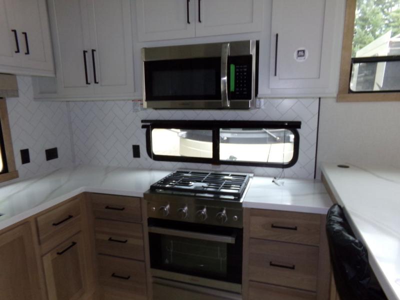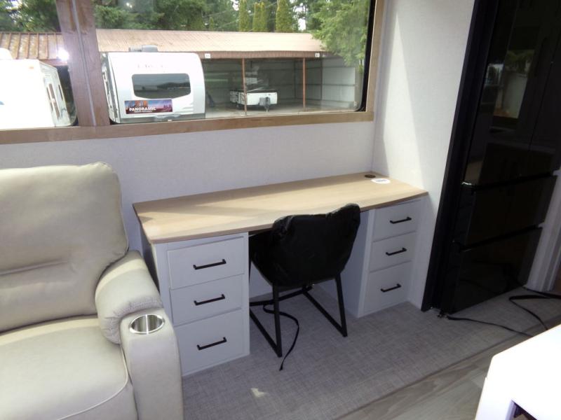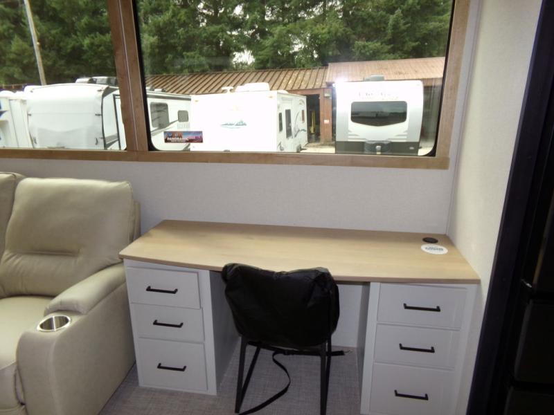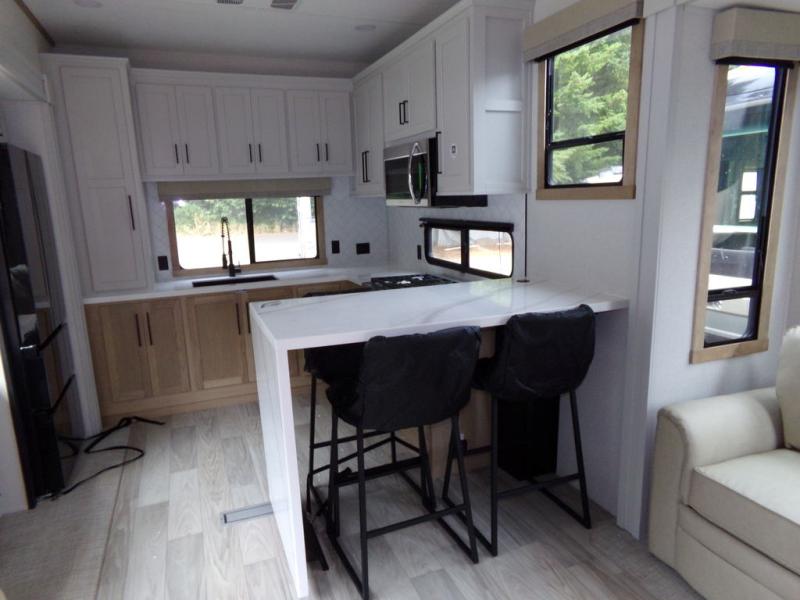 One look at this destination trailer and you'll be sold! You'll love waking up each morning in the master bedroom with a king bed slide out, dual nightstands, and a dresser to keep clothes organized. There is also a spacious front bathroom with a walk-in closet! As you walk to the main living area, you'll find the half bath with washer and dryer prep if you plan to add these appliances. A tri-fold hide-a-bed sofa and theater seating in the living area will let you relax each day, and the bar with stools overlooks the kitchen so you can visit with the chef while dinner is being made.