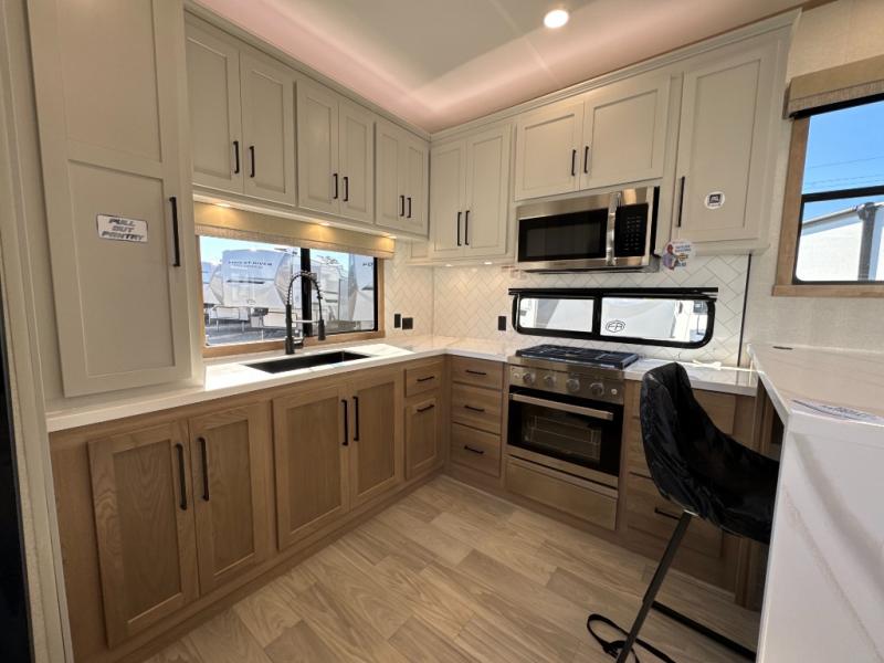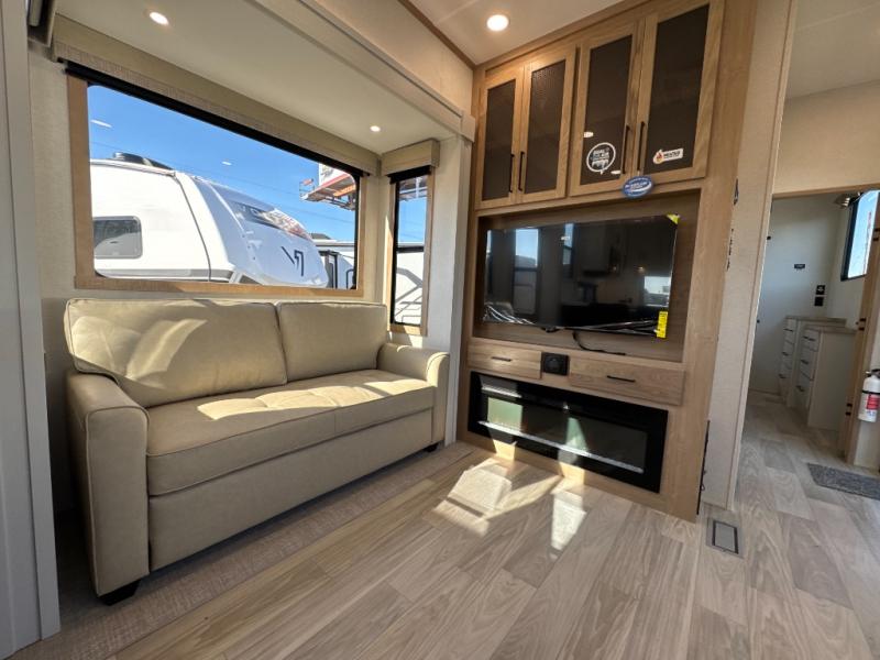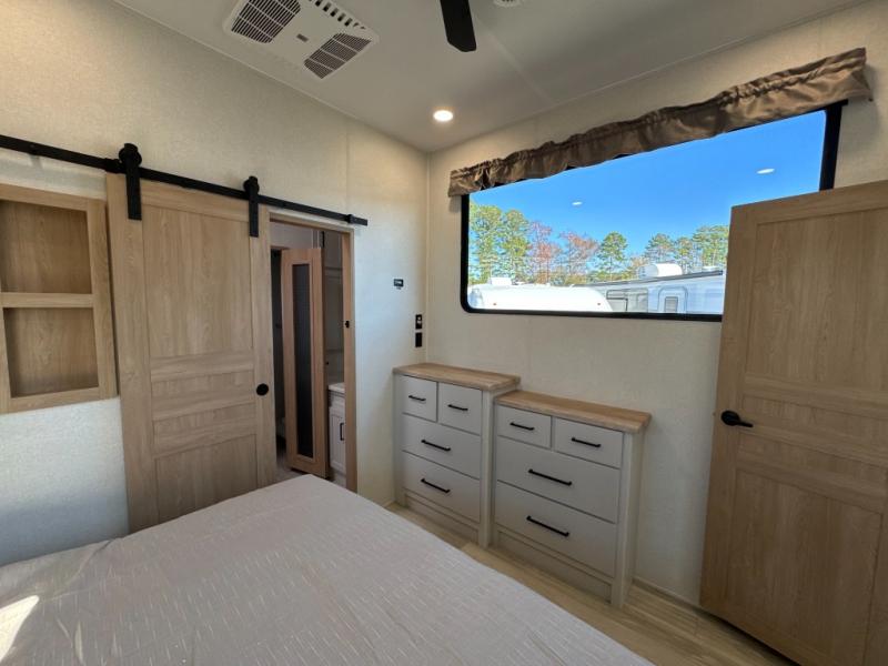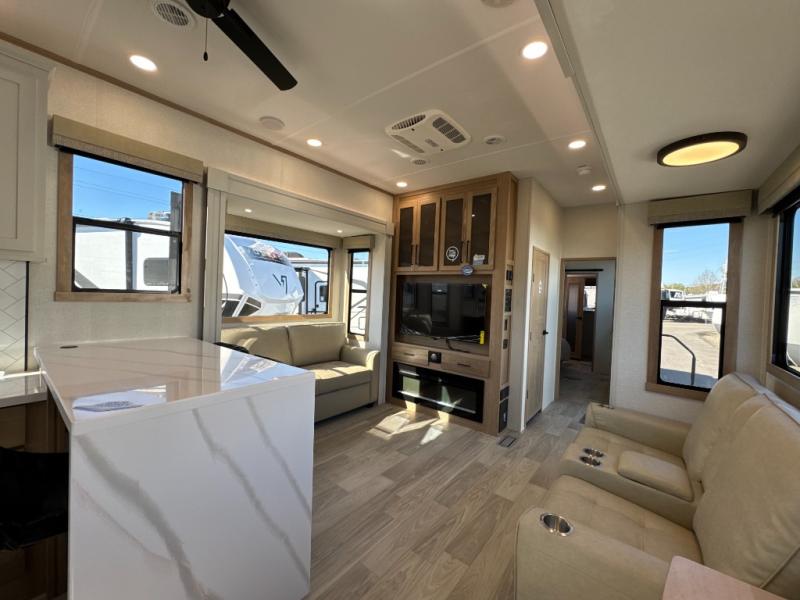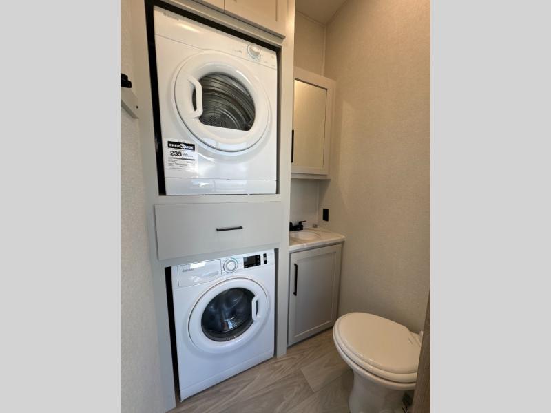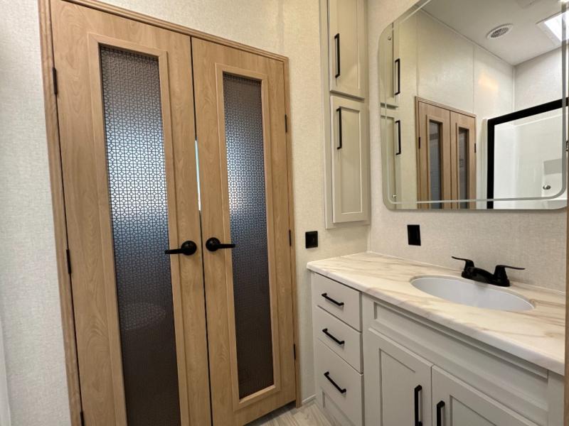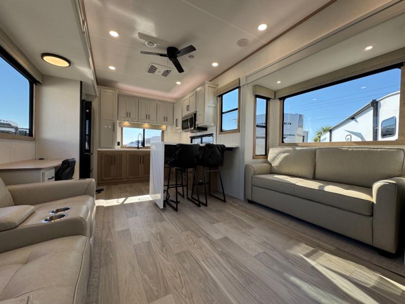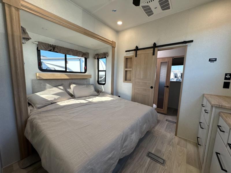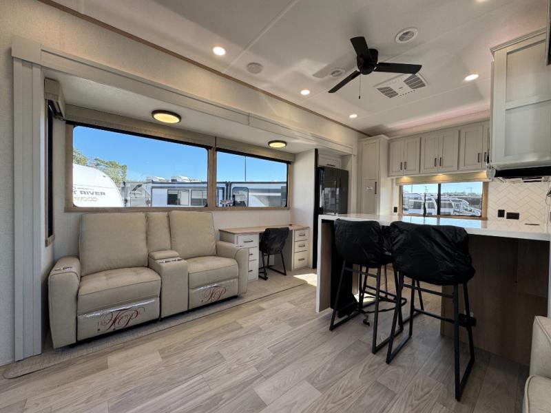 One look at this destination trailer and you'll be sold! You'll love waking up each morning in the master bedroom with a king bed slide out, dual nightstands, and a dresser to keep clothes organized. There is also a spacious front bathroom with a walk-in closet! As you walk to the main living area, you'll find the half bath with washer and dryer prep if you plan to add these appliances. A tri-fold hide-a-bed sofa and theater seating in the living area will let you relax each day, and the bar with stools overlooks the kitchen so you can visit with the chef while dinner is being made.