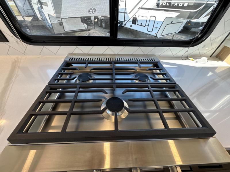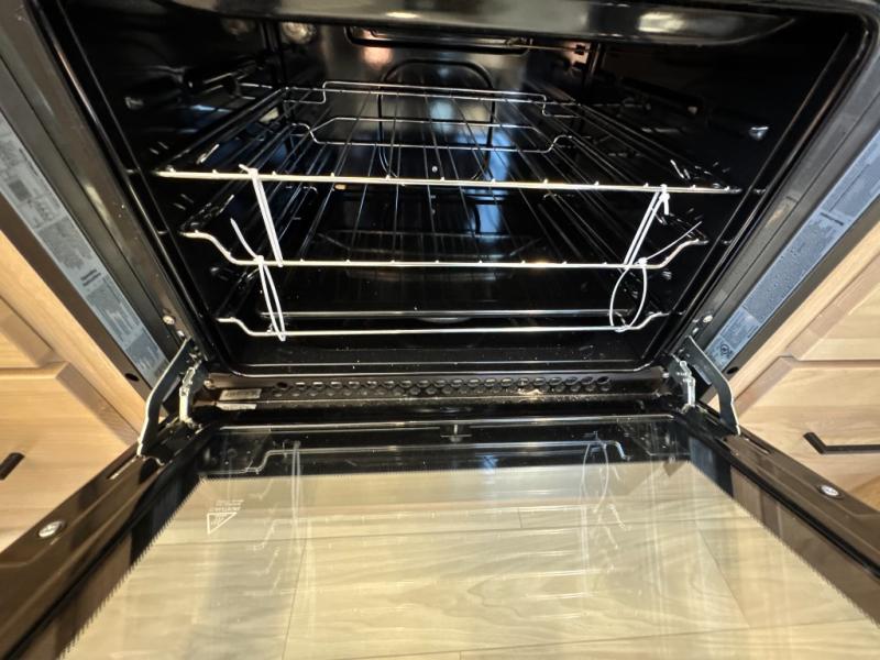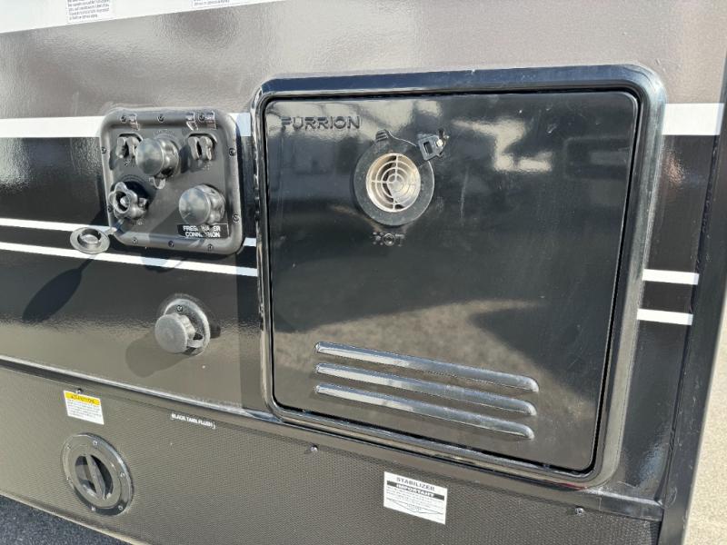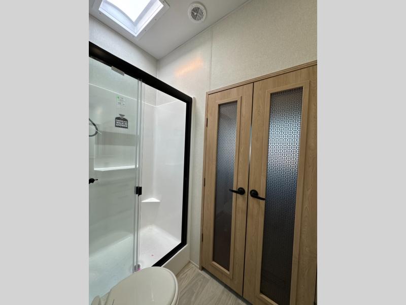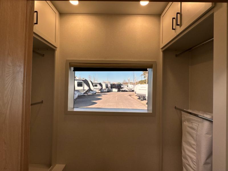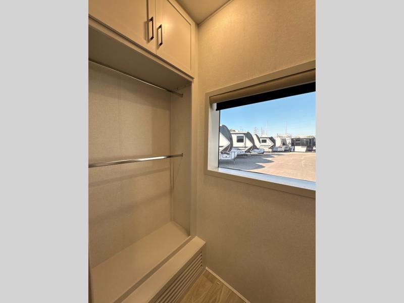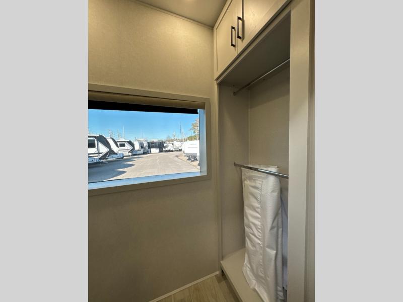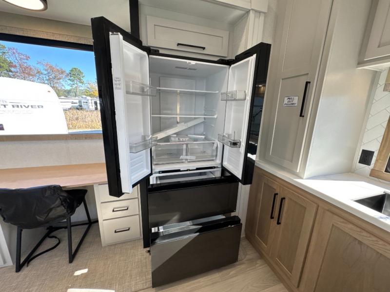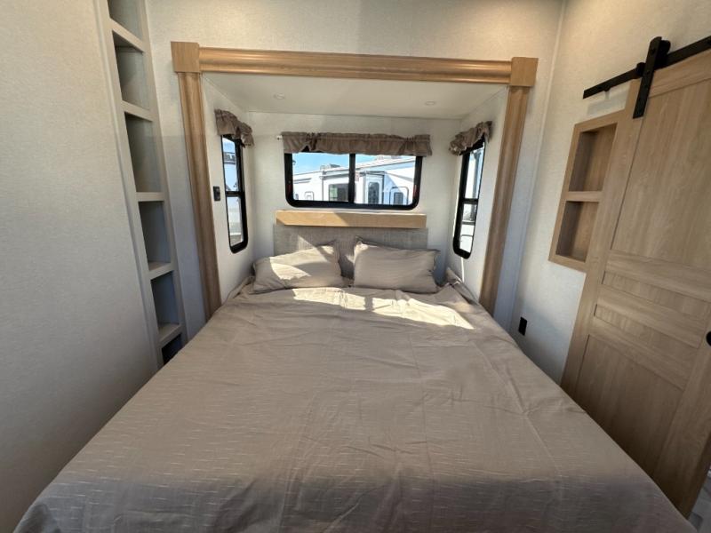 One look at this destination trailer and you'll be sold! You'll love waking up each morning in the master bedroom with a king bed slide out, dual nightstands, and a dresser to keep clothes organized. There is also a spacious front bathroom with a walk-in closet! As you walk to the main living area, you'll find the half bath with washer and dryer prep if you plan to add these appliances. A tri-fold hide-a-bed sofa and theater seating in the living area will let you relax each day, and the bar with stools overlooks the kitchen so you can visit with the chef while dinner is being made.