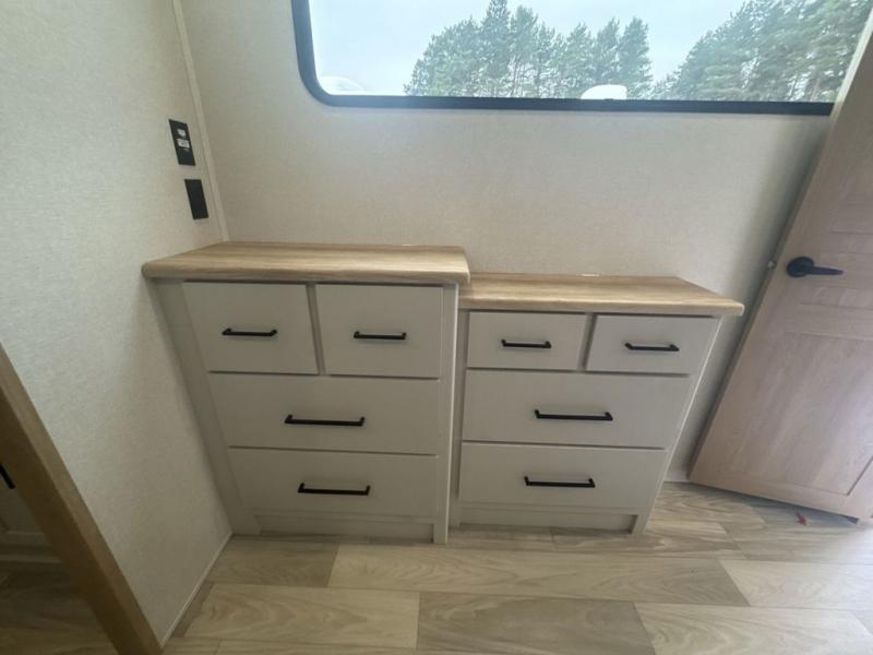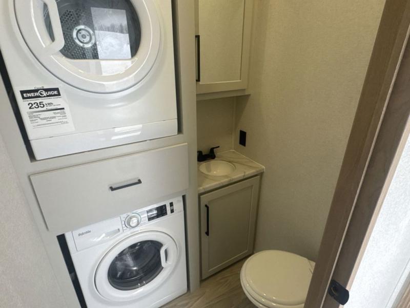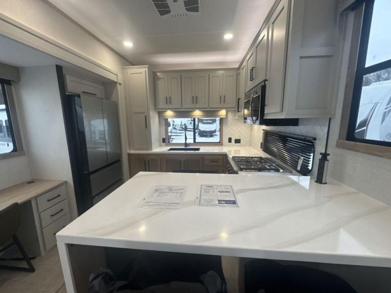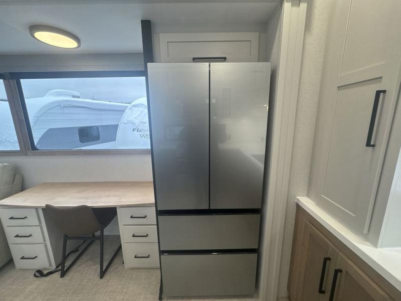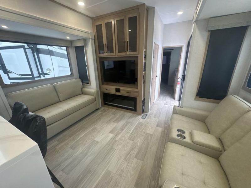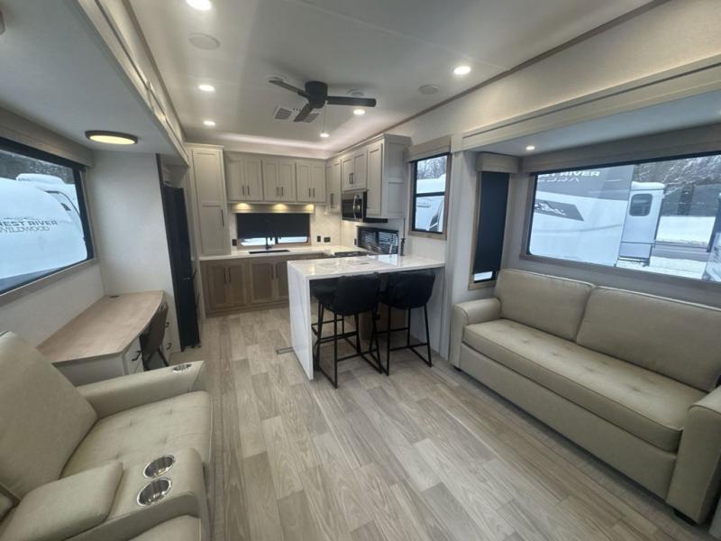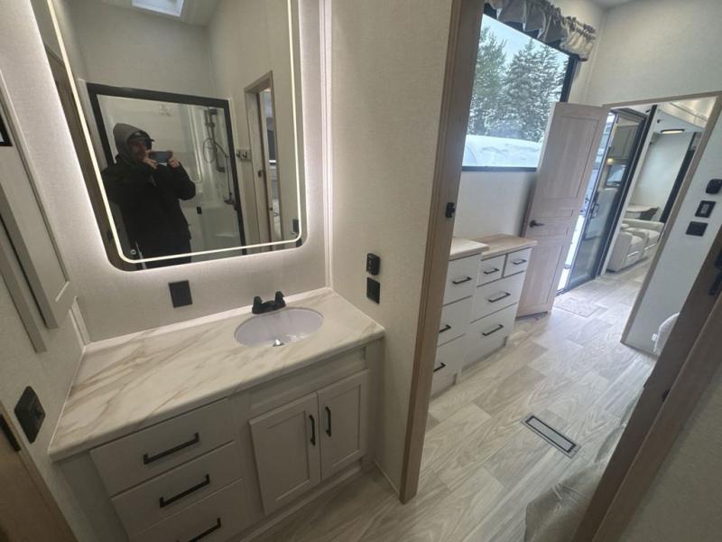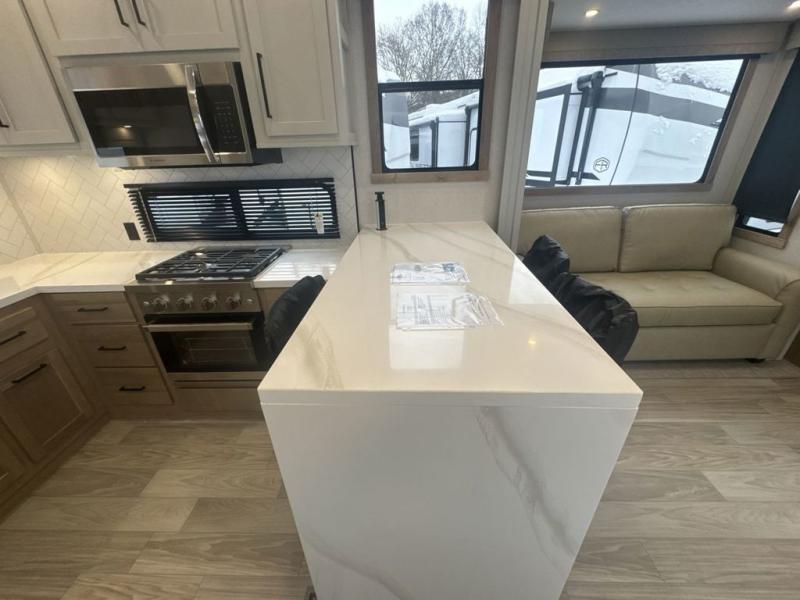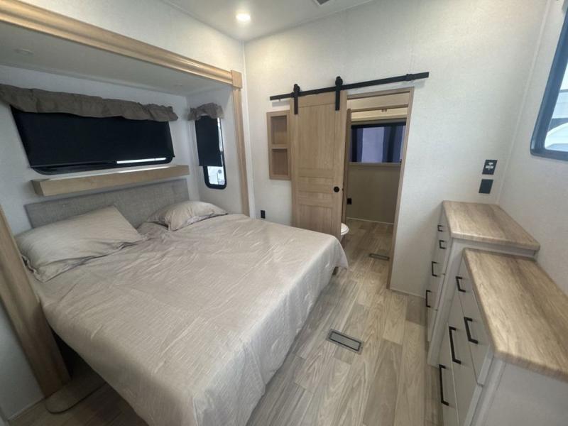 One look at this destination trailer and you'll be sold! You'll love waking up each morning in the master bedroom with a king bed slide out, dual nightstands, and a dresser to keep clothes organized. There is also a spacious front bathroom with a walk-in closet! As you walk to the main living area, you'll find the half bath with washer and dryer prep if you plan to add these appliances. A tri-fold hide-a-bed sofa and theater seating in the living area will let you relax each day, and the bar with stools overlooks the kitchen so you can visit with the chef while dinner is being made.