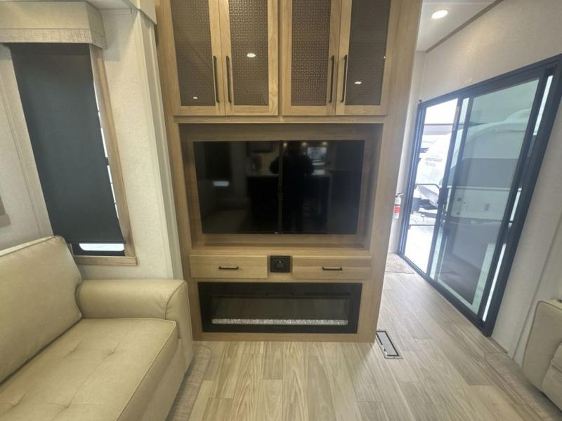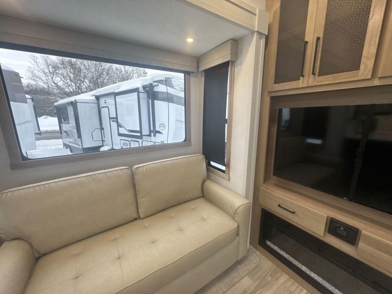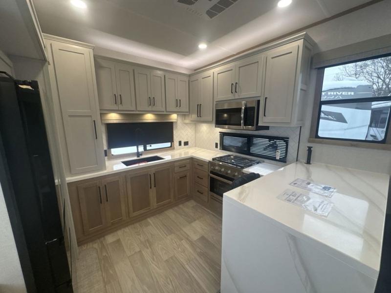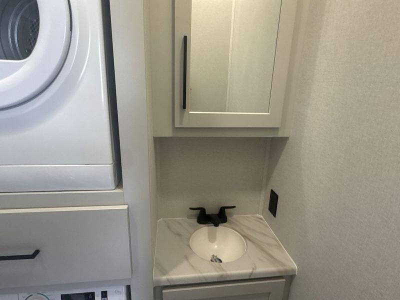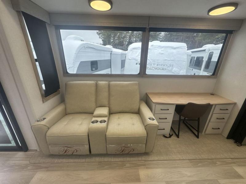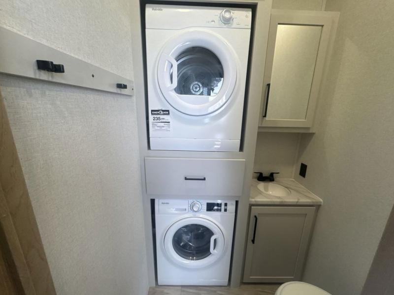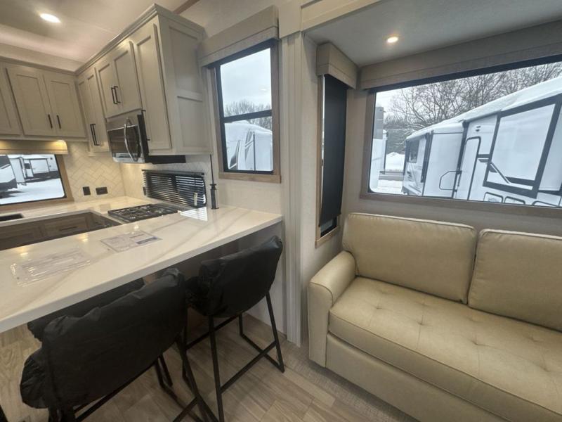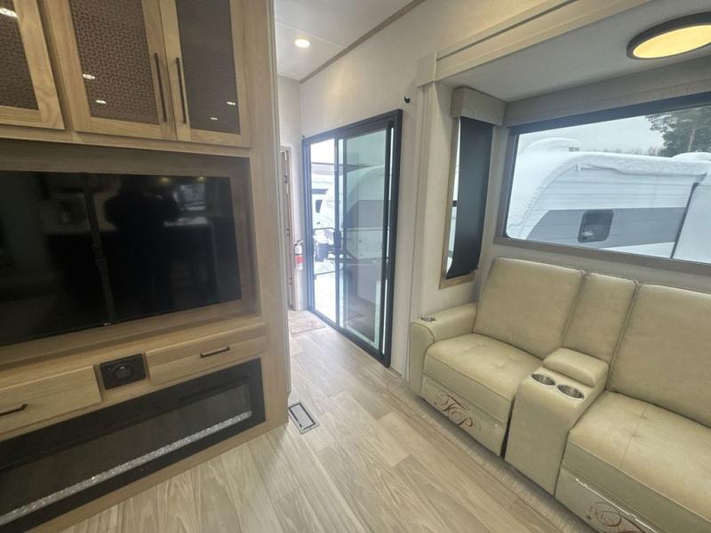 One look at this destination trailer and you'll be sold! You'll love waking up each morning in the master bedroom with a king bed slide out, dual nightstands, and a dresser to keep clothes organized. There is also a spacious front bathroom with a walk-in closet! As you walk to the main living area, you'll find the half bath with washer and dryer prep if you plan to add these appliances. A tri-fold hide-a-bed sofa and theater seating in the living area will let you relax each day, and the bar with stools overlooks the kitchen so you can visit with the chef while dinner is being made.