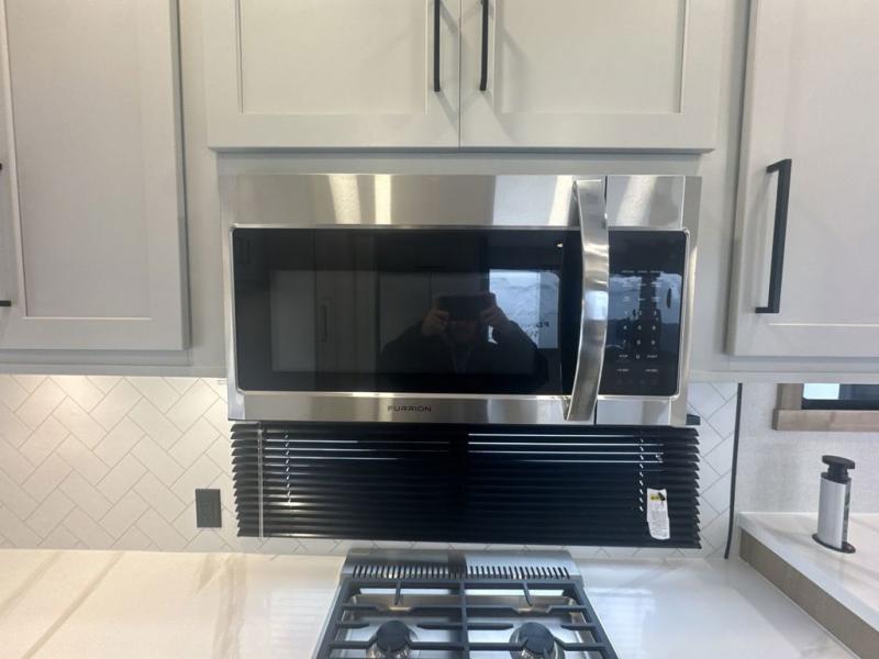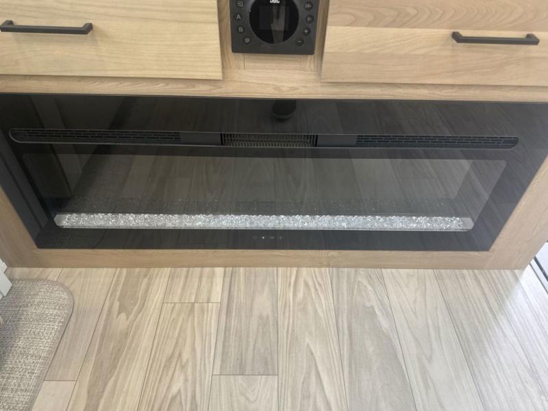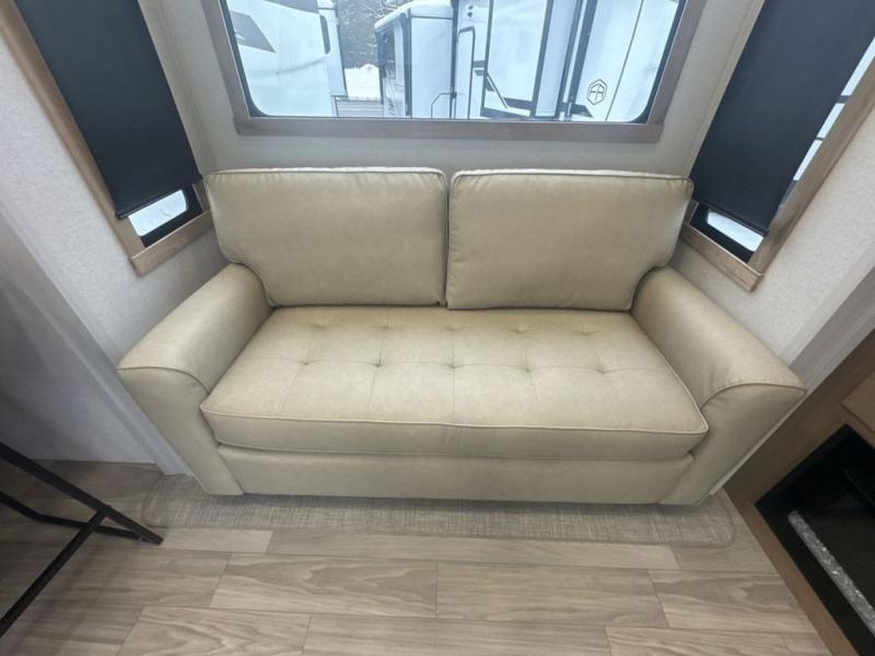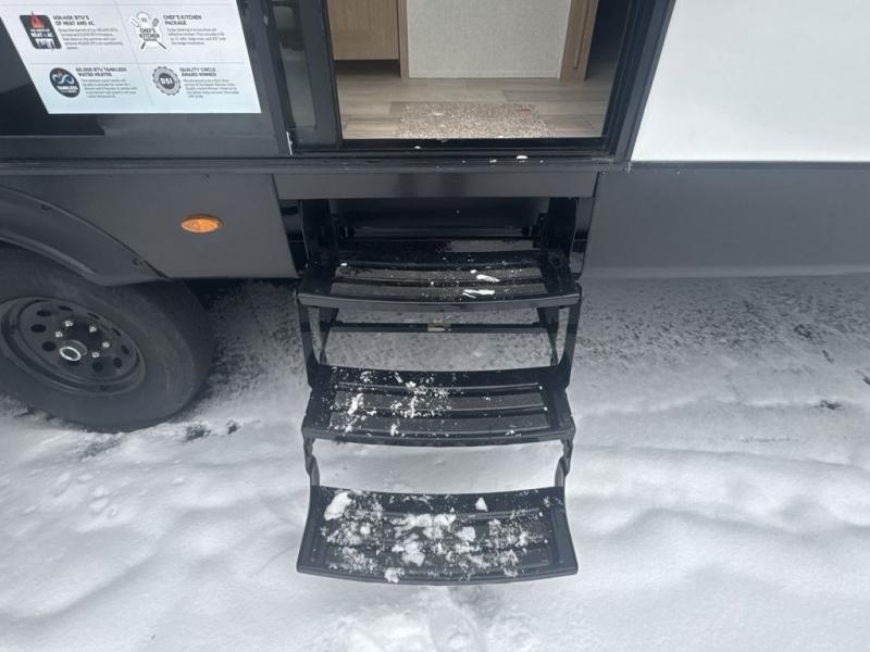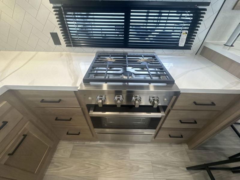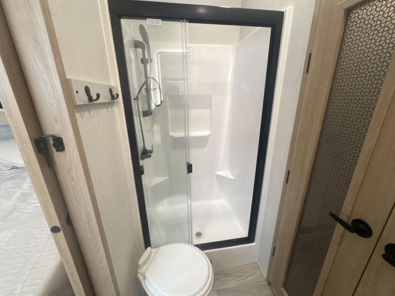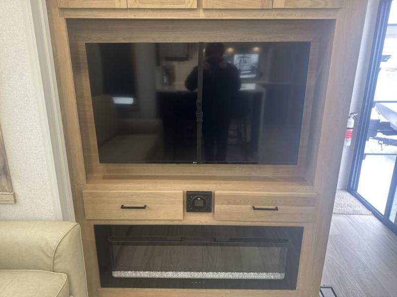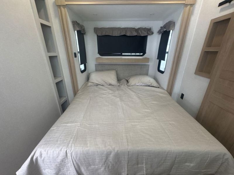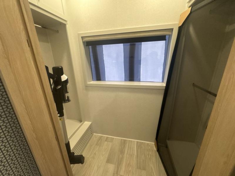 One look at this destination trailer and you'll be sold! You'll love waking up each morning in the master bedroom with a king bed slide out, dual nightstands, and a dresser to keep clothes organized. There is also a spacious front bathroom with a walk-in closet! As you walk to the main living area, you'll find the half bath with washer and dryer prep if you plan to add these appliances. A tri-fold hide-a-bed sofa and theater seating in the living area will let you relax each day, and the bar with stools overlooks the kitchen so you can visit with the chef while dinner is being made.