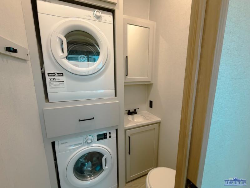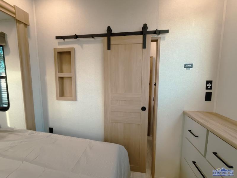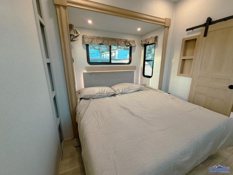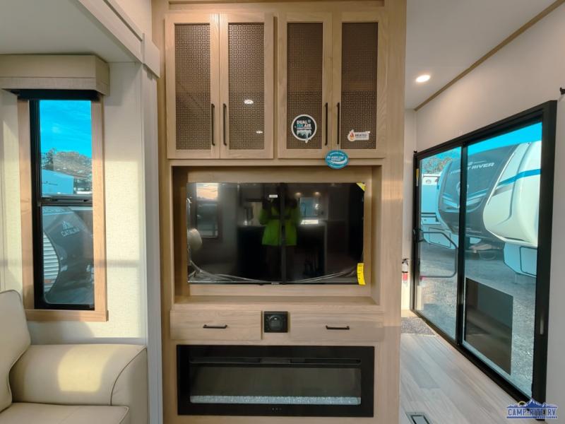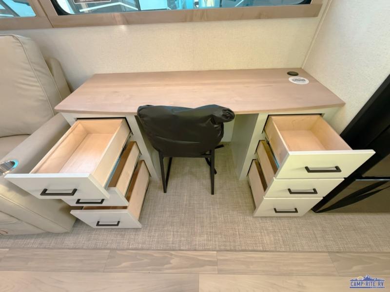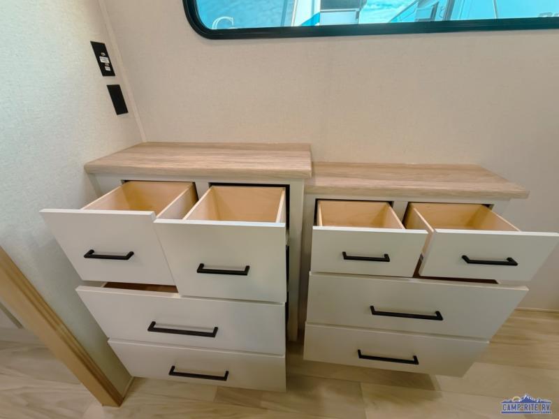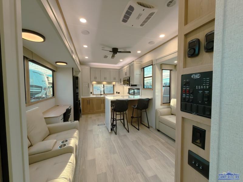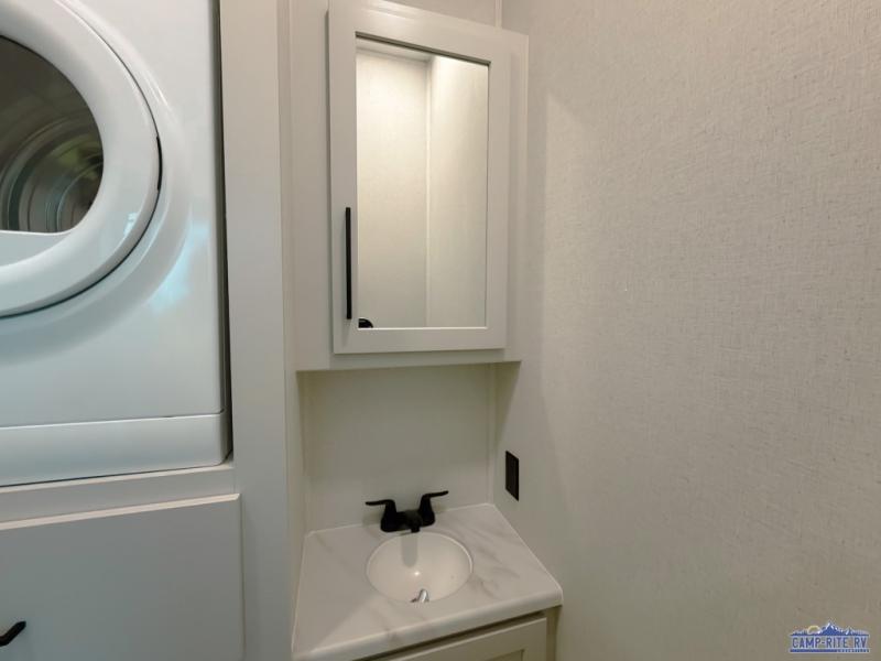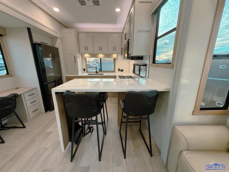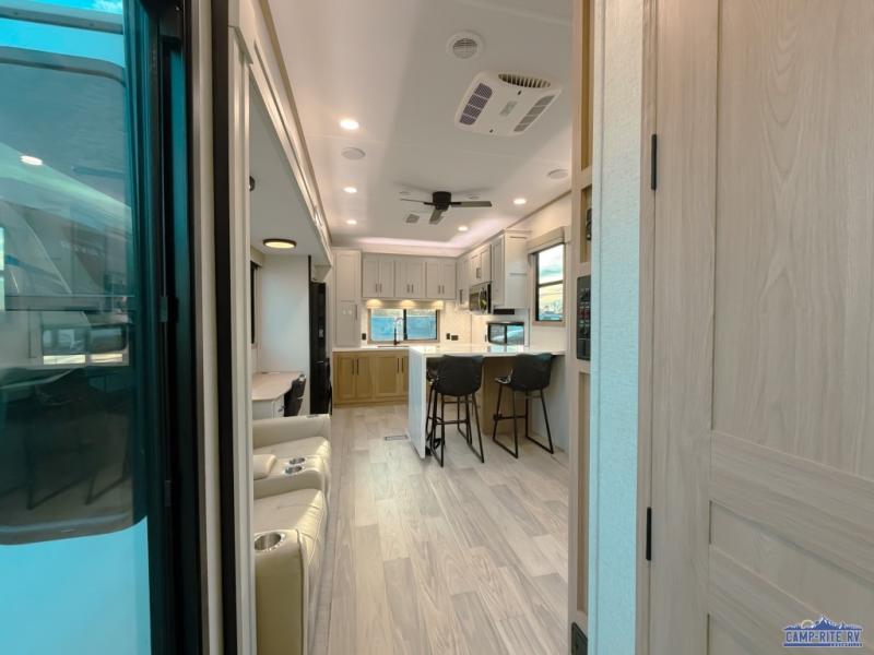 One look at this destination trailer and you'll be sold! You'll love waking up each morning in the master bedroom with a king bed slide out, dual nightstands, and a dresser to keep clothes organized. There is also a spacious front bathroom with a walk-in closet! As you walk to the main living area, you'll find the half bath with washer and dryer prep if you plan to add these appliances. A tri-fold hide-a-bed sofa and theater seating in the living area will let you relax each day, and the bar with stools overlooks the kitchen so you can visit with the chef while dinner is being made.