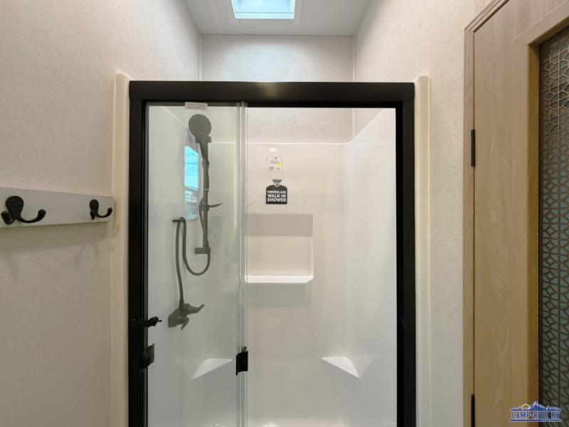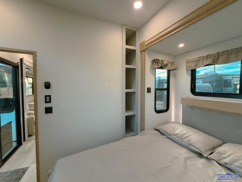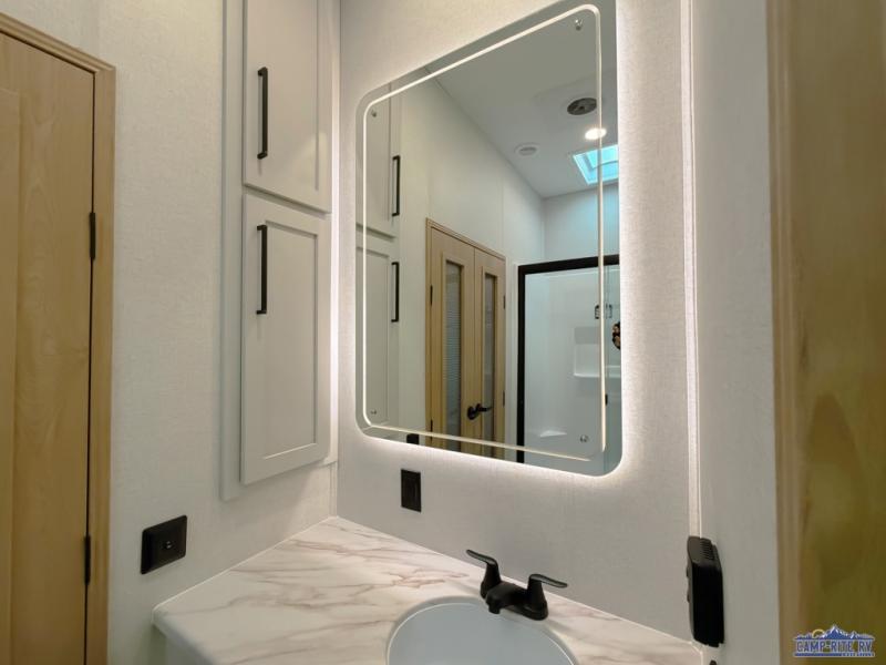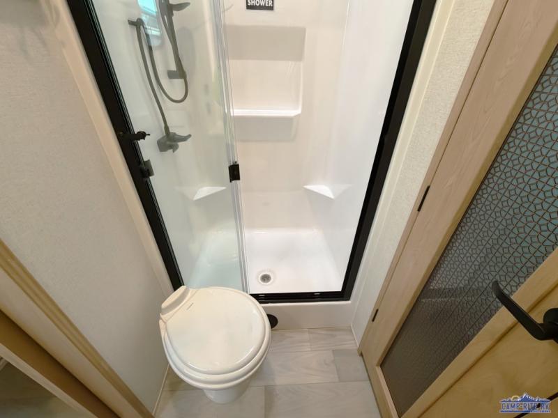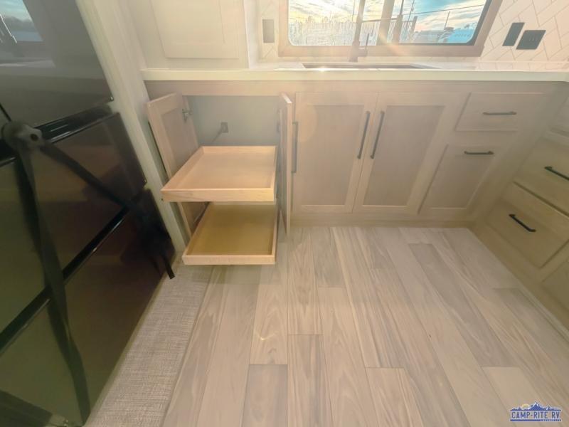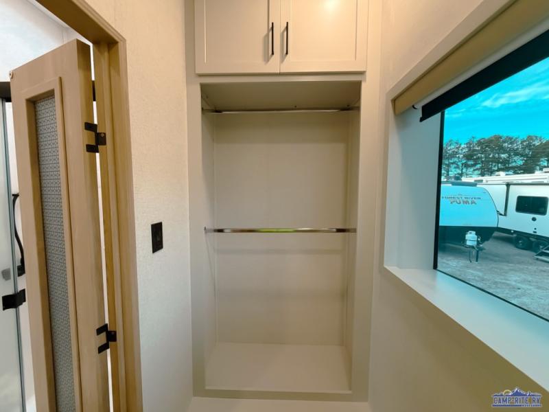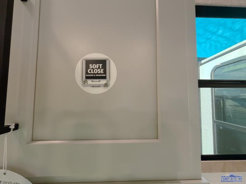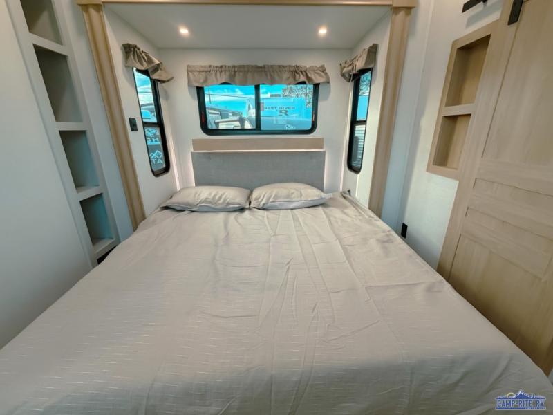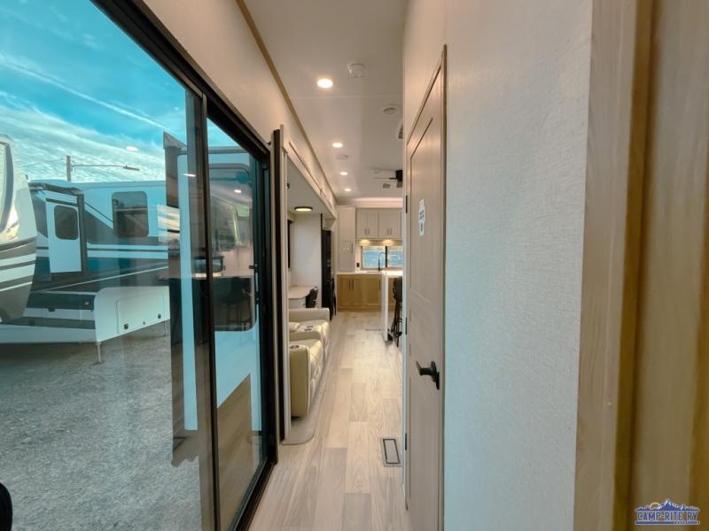 One look at this destination trailer and you'll be sold! You'll love waking up each morning in the master bedroom with a king bed slide out, dual nightstands, and a dresser to keep clothes organized. There is also a spacious front bathroom with a walk-in closet! As you walk to the main living area, you'll find the half bath with washer and dryer prep if you plan to add these appliances. A tri-fold hide-a-bed sofa and theater seating in the living area will let you relax each day, and the bar with stools overlooks the kitchen so you can visit with the chef while dinner is being made.