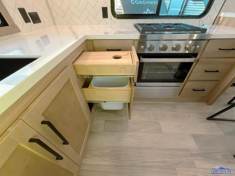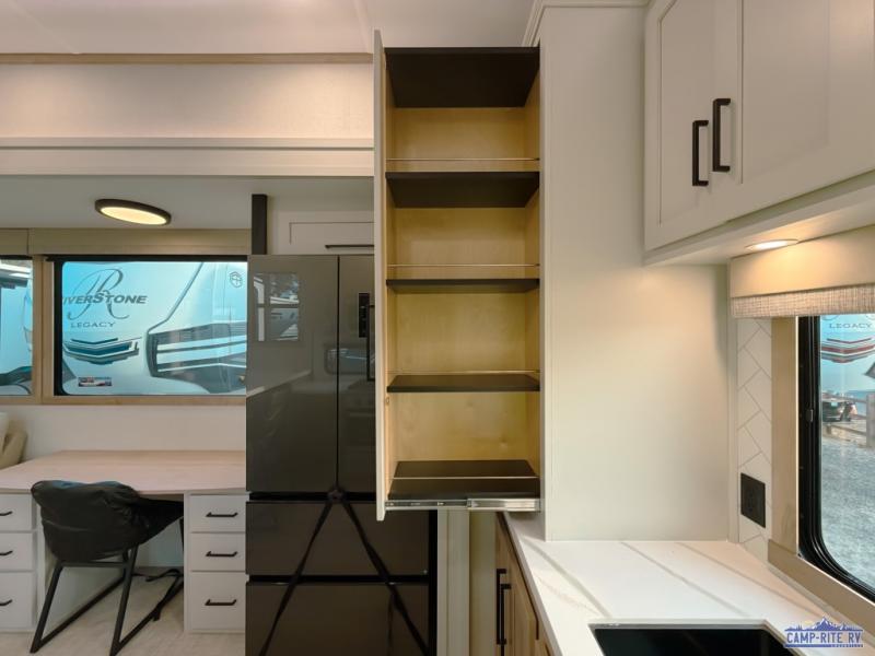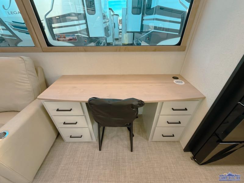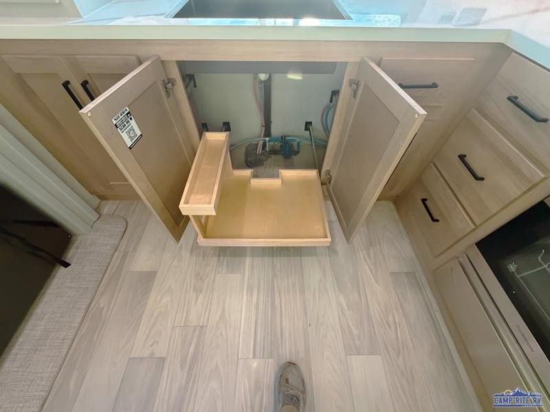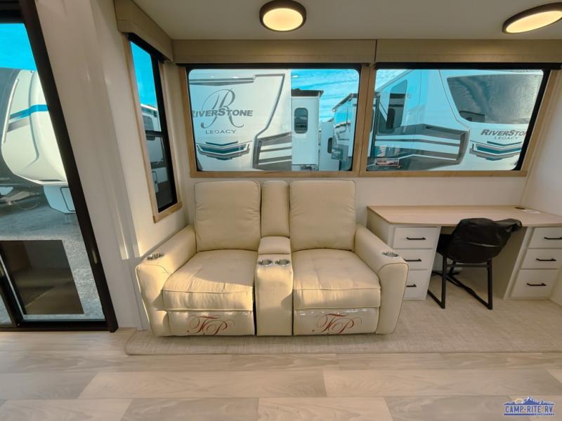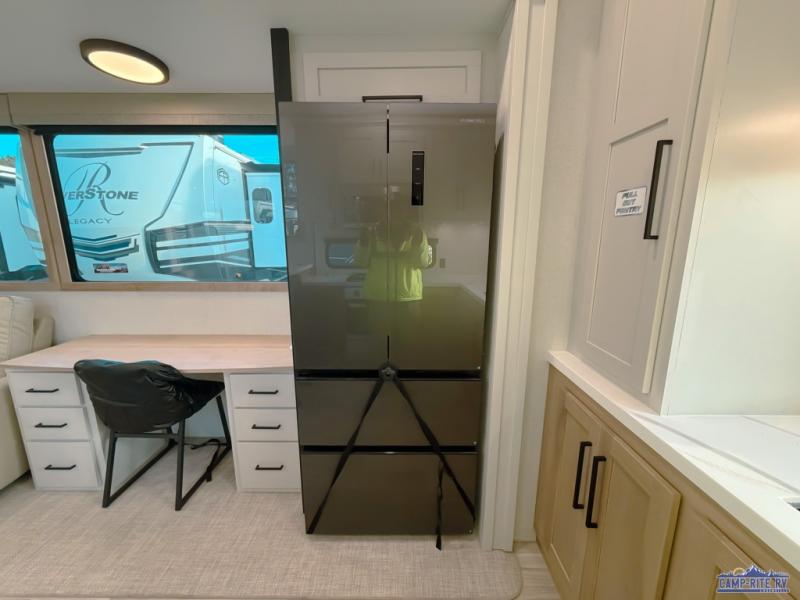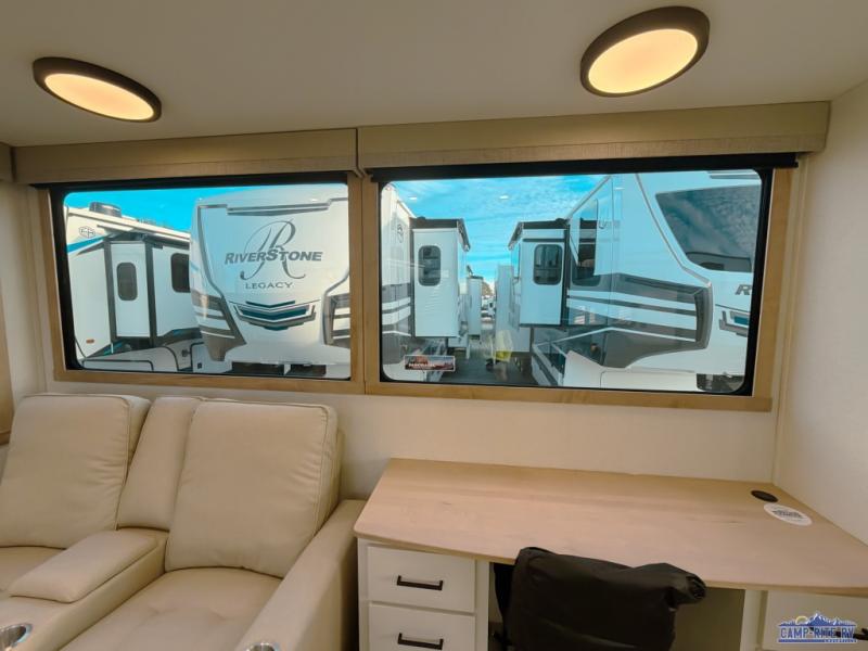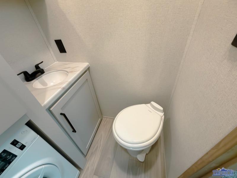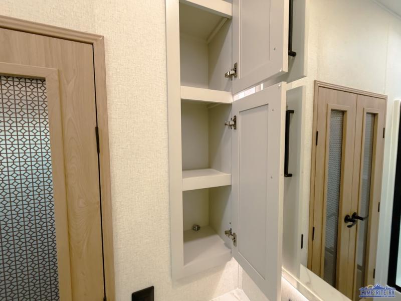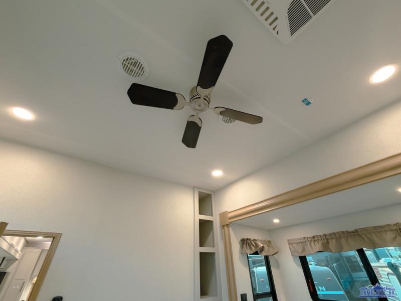 One look at this destination trailer and you'll be sold! You'll love waking up each morning in the master bedroom with a king bed slide out, dual nightstands, and a dresser to keep clothes organized. There is also a spacious front bathroom with a walk-in closet! As you walk to the main living area, you'll find the half bath with washer and dryer prep if you plan to add these appliances. A tri-fold hide-a-bed sofa and theater seating in the living area will let you relax each day, and the bar with stools overlooks the kitchen so you can visit with the chef while dinner is being made.
