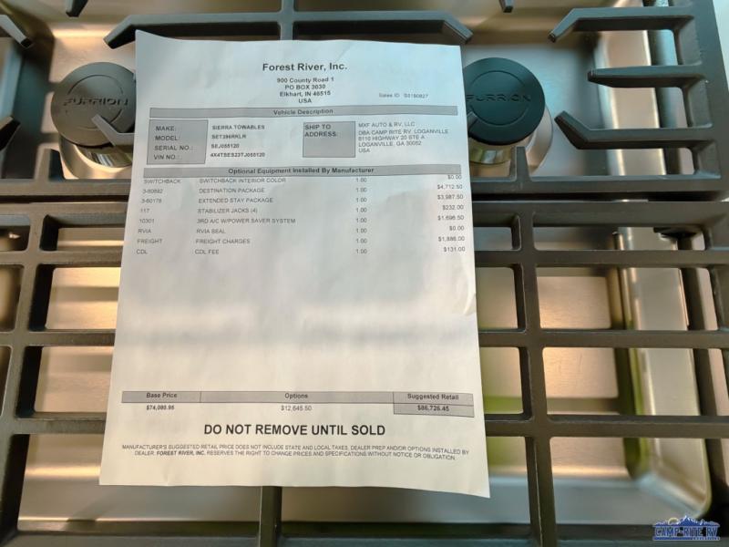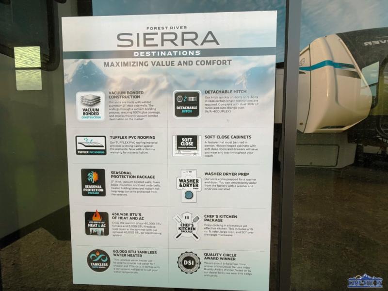 With each Sierra Destination Trailer by Forest River you will enjoy many luxurious features, such as crown molding over the kitchen cabinets, solid surface kitchen countertops, a memory foam mattress, plus so much more. The extra large picture windows throughout let natural light in and provide beautiful outdoor views, and each model includes three or more slides for added interior space. You'll find many exterior conveniences, like the porch light with an interior switch, the rain gutters with extra long drip spouts to prevent black streaking, and an electric awning with LED light strip, plus more! You will stay comfortable year around with dual 15,000 A/C units plus each model is constructed with an Underbelly Armor for better protection and insulation!